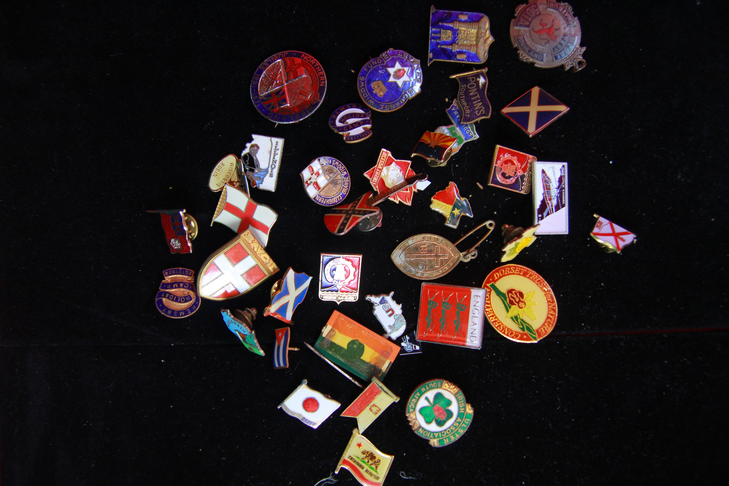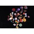 A small box containing a number of badges including US State badges, others including Soviet, a number of enamel badges relating to Ulster, Hemsby Holiday Camp, Butlins Southport and others