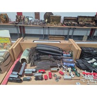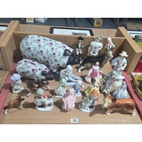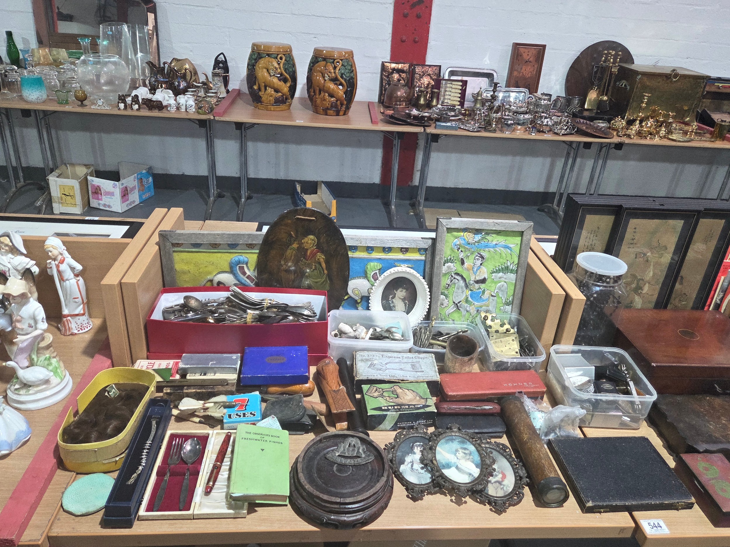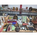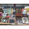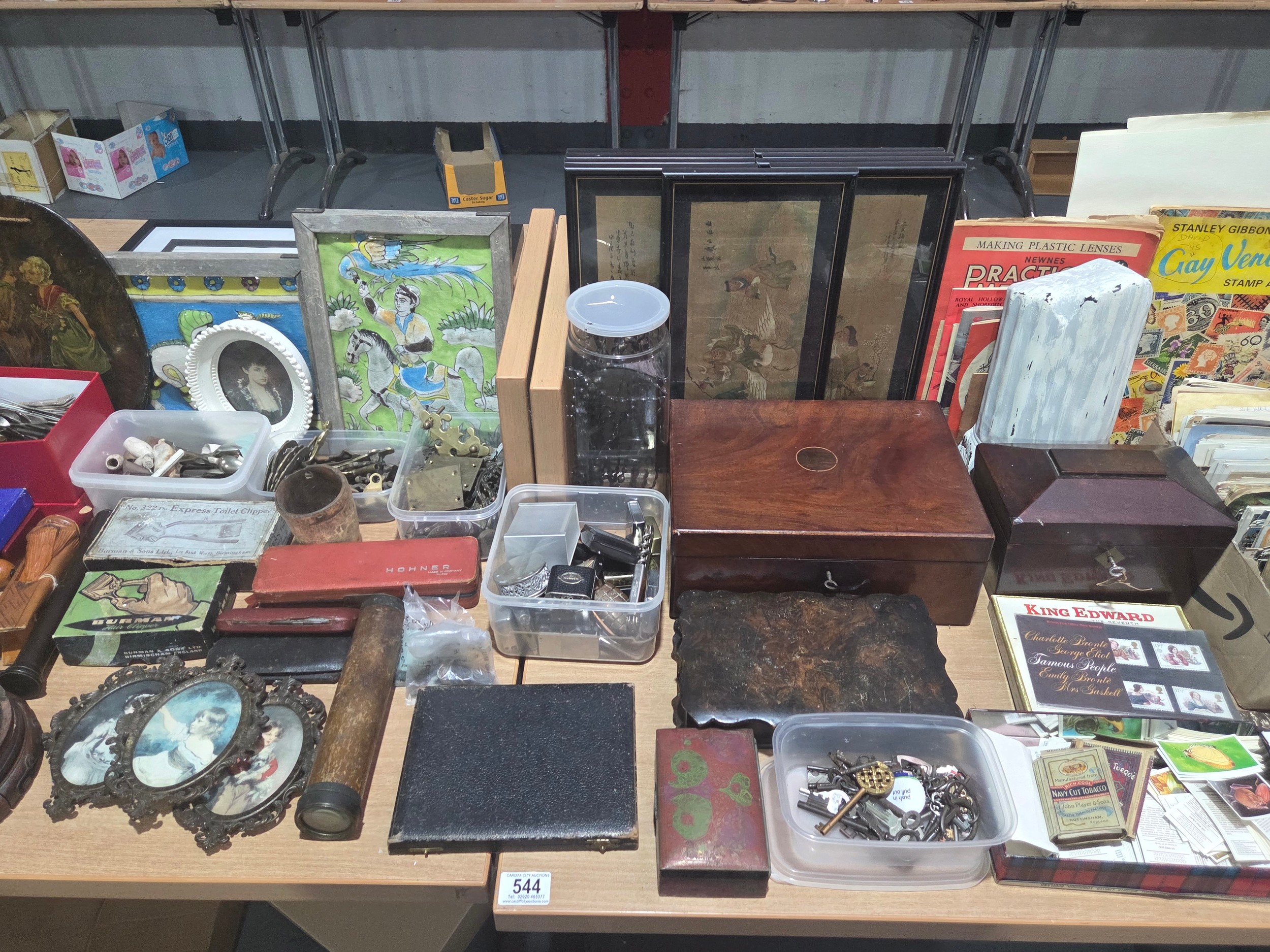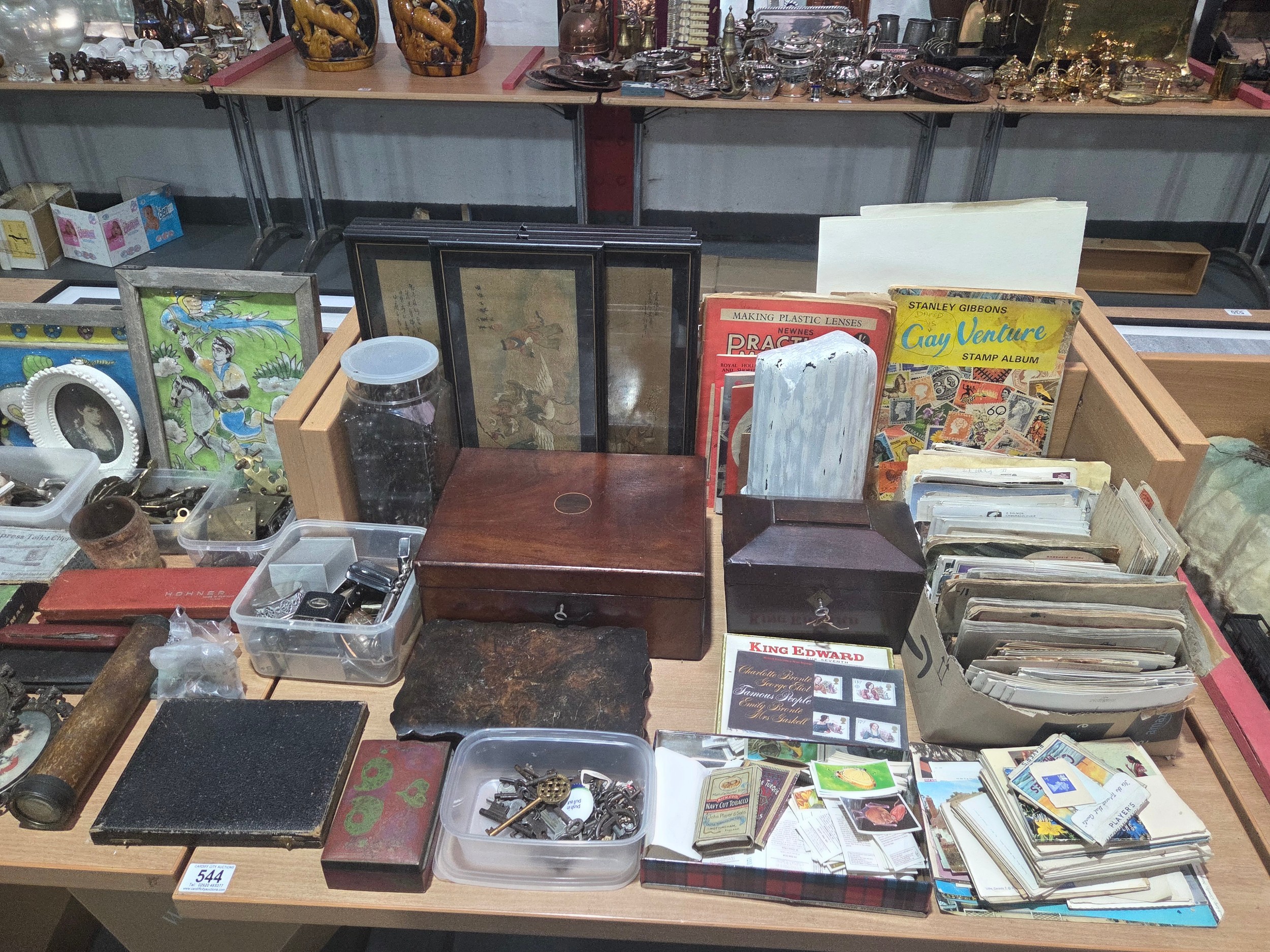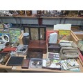 A mahogany writing slope, postcards, brass escutheons, tea caddy, lighters and other vintage items