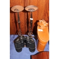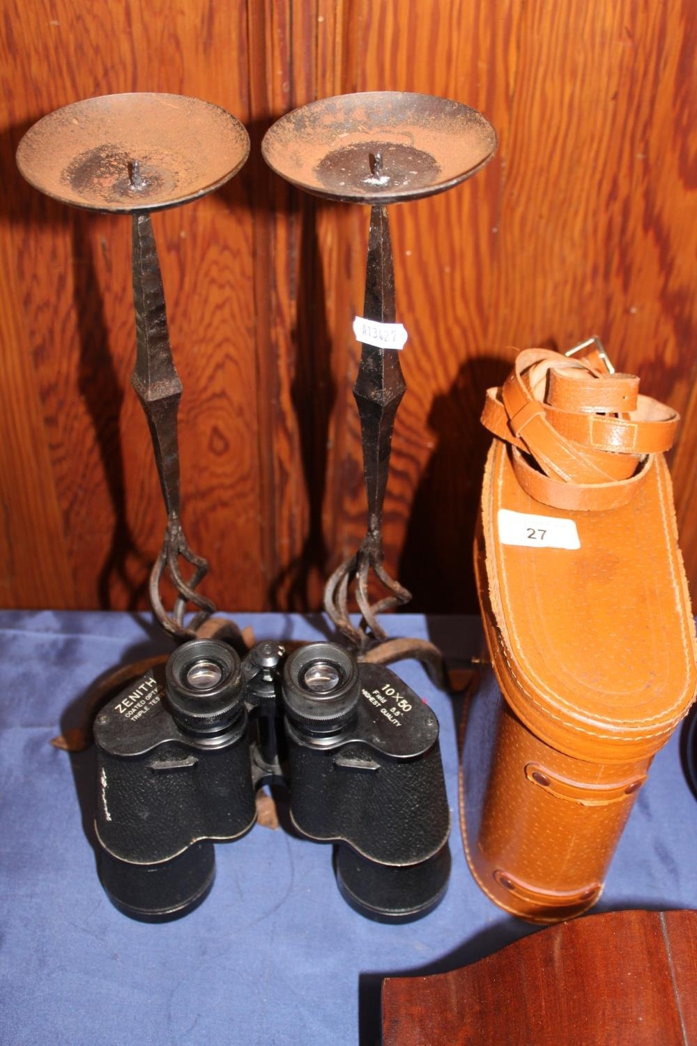 Pair of wrought iron candlesticks, and a pair of Zenith field binoculars.