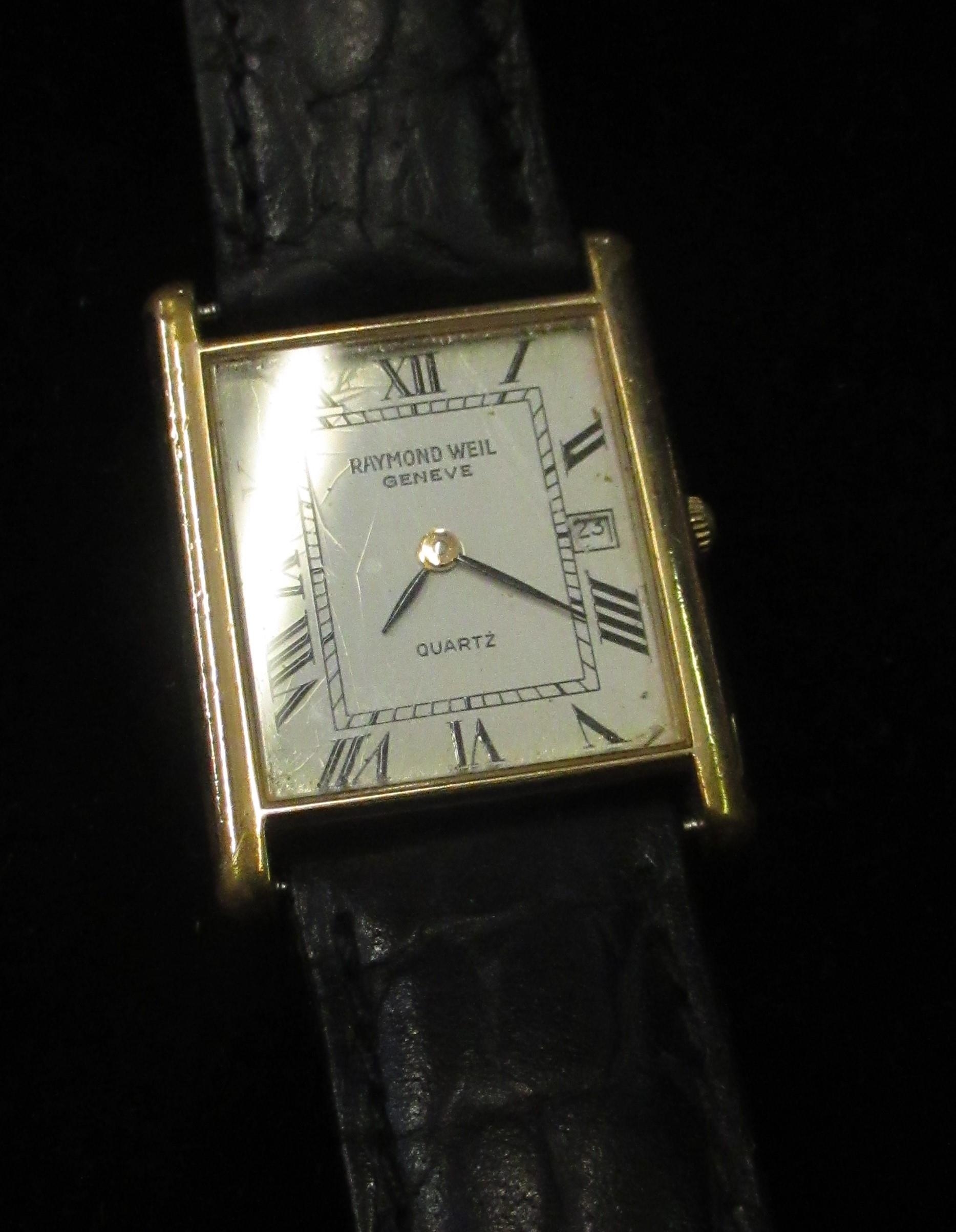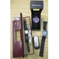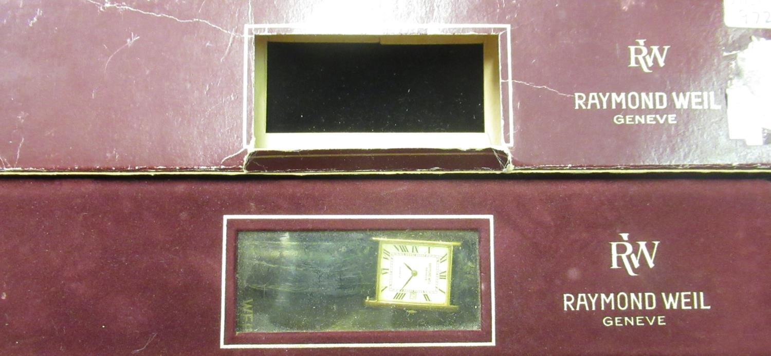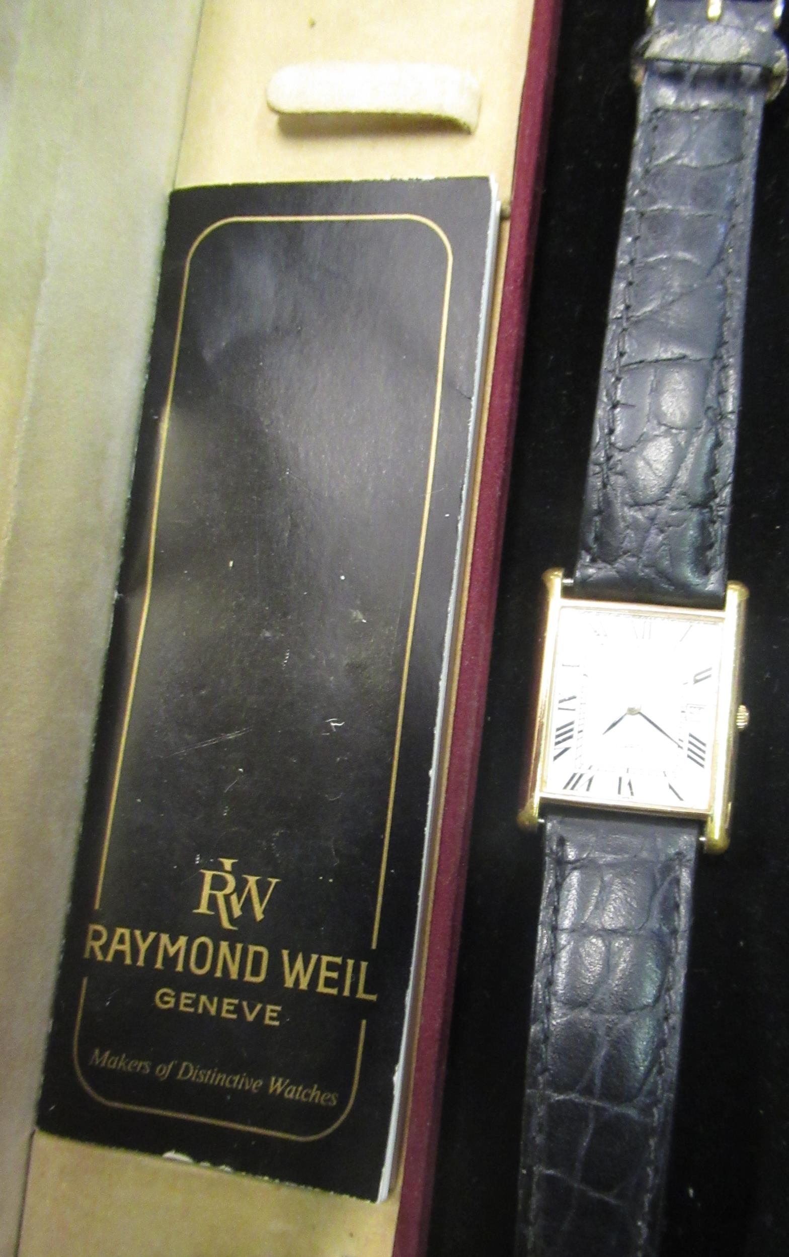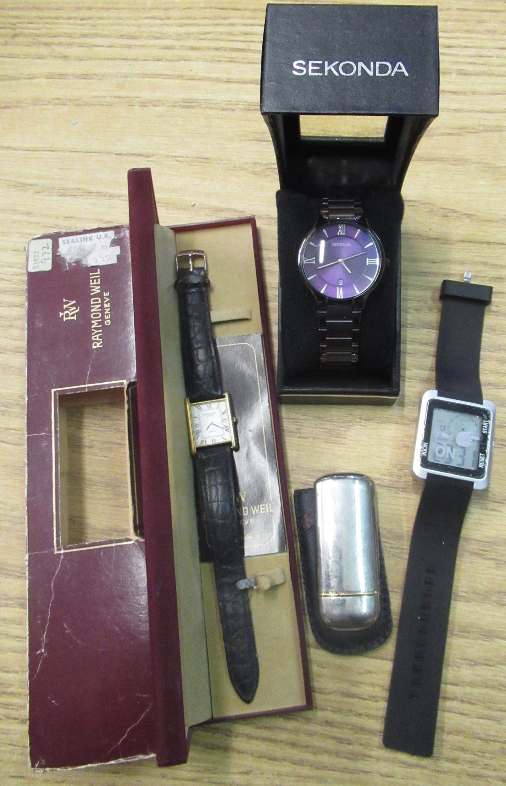 Raymond Weil quartz tank watch stamped 18ct gold electro plated no. 5312 guarantee card dated 1984 including case and box, Sekonda gents watch on gun metal strap with purple face in box with instructions, Atlas for men smart watch, chromed cigarette lighter
