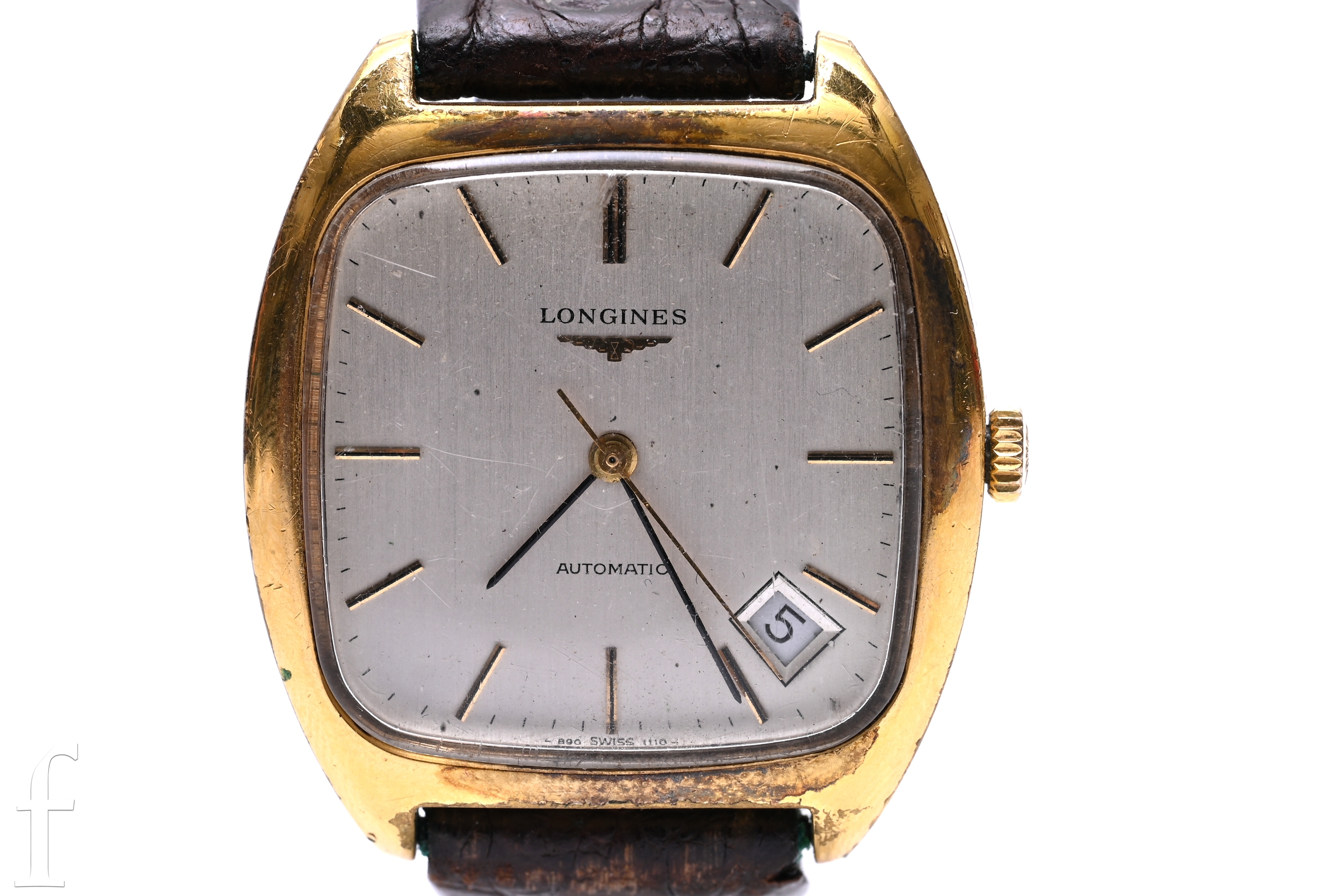 A 1970s Longines wristwatch in square shaped gold plated 34mm case, with 25 jewel cal.890-1 automatic movement, the dial with baton numerals and date window, movement number 533003.. and case number 1827577.., all to a brown leather strap with original Longines buckle, no box or papers.