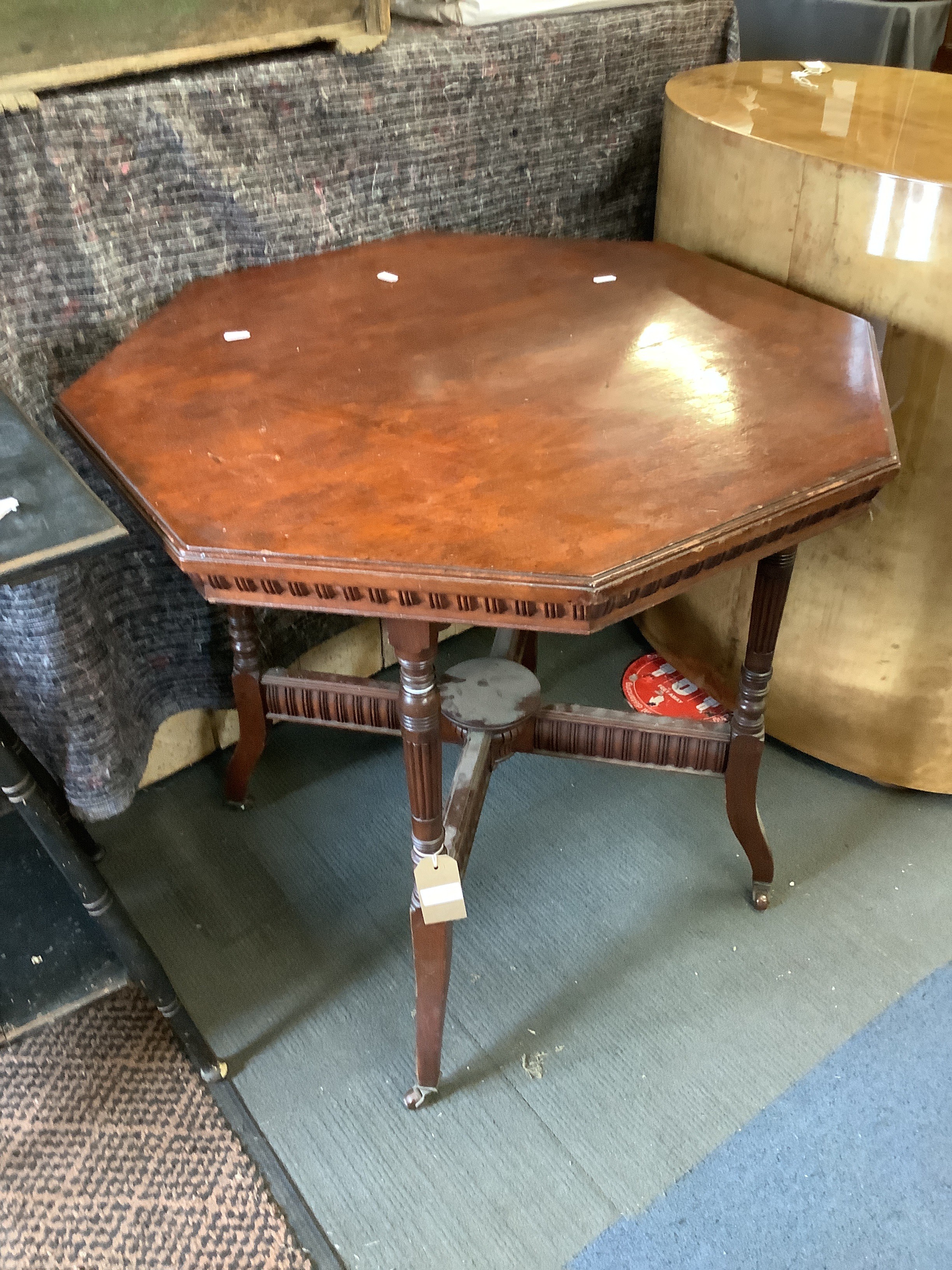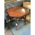 A mahogany octagonal table with X frame stretcher