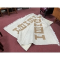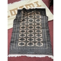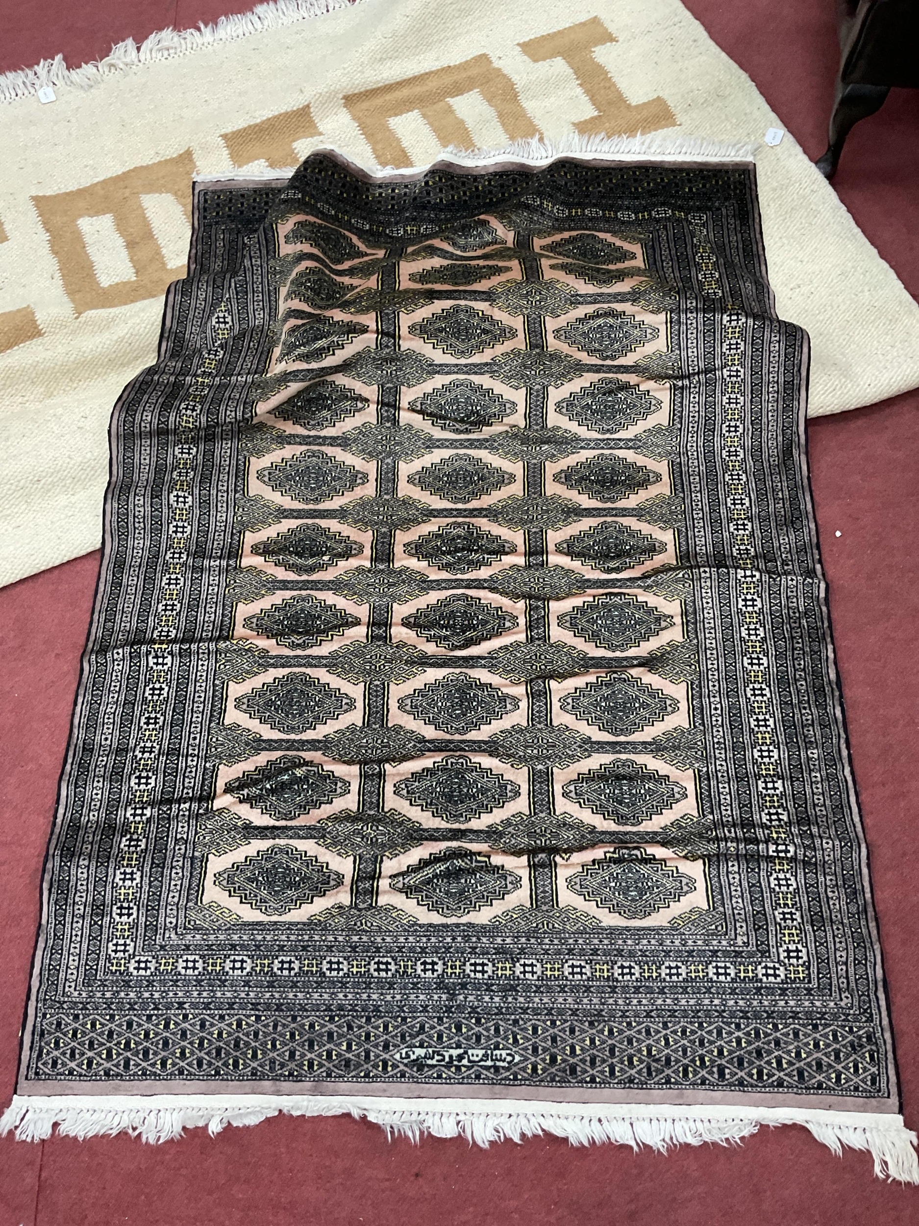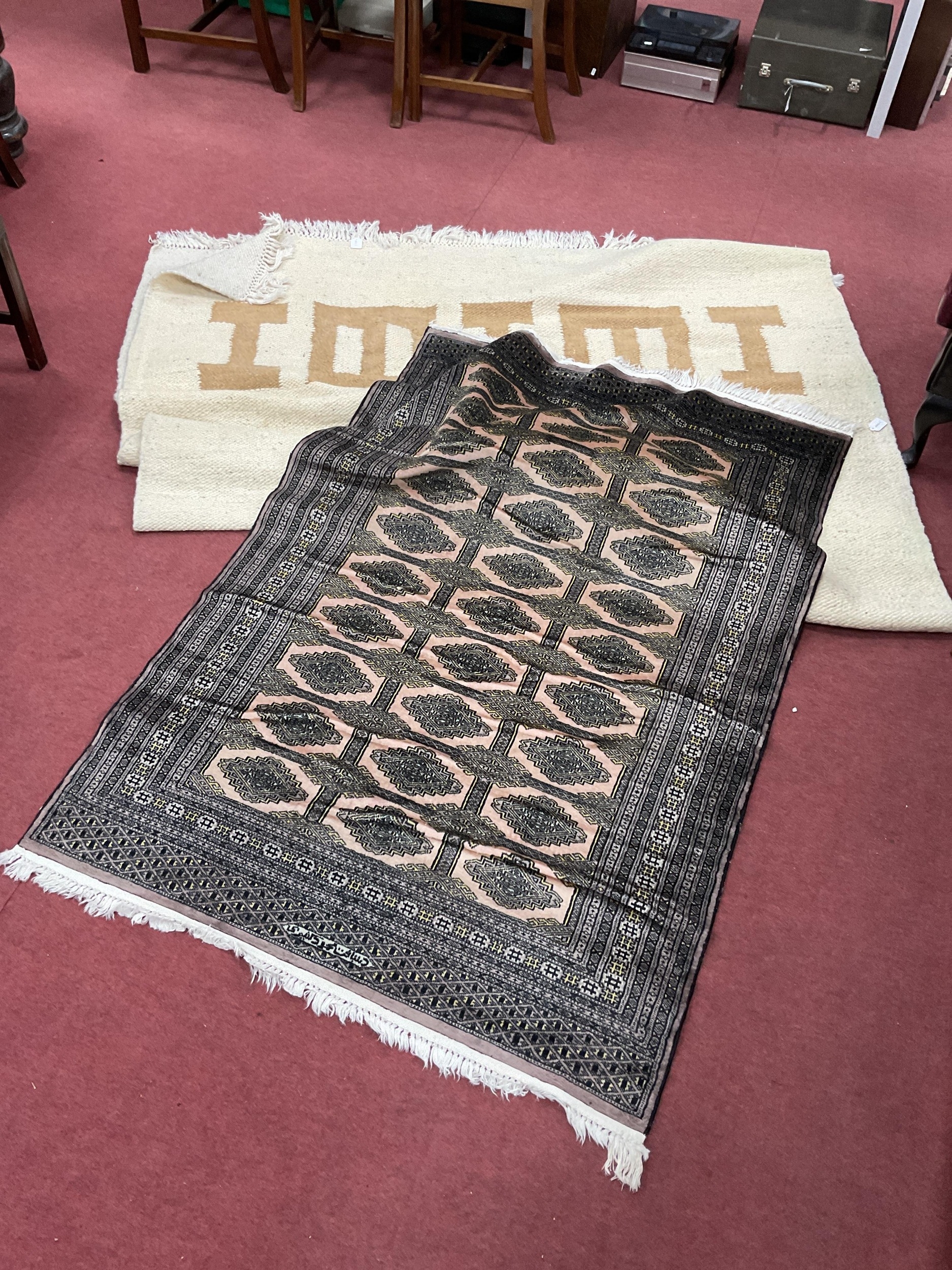 Two Rugs: Persian-patterned wool pile rug/runner with medallions, inscribed script and borders in beige tones (approx. 120x185cm), and a large cream field example with geometric pattern in brown (approx. 195x310cm). (2)