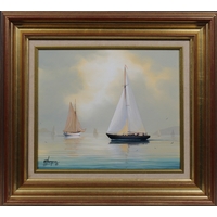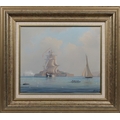 Tim Franklin Ross Thompson (British, b.1951), A Frigate of the late eighteenth century and other vessels in a light breeze in St Peter Port HarbourSigned, oil on canvas, 24.5cm x 29.5cm