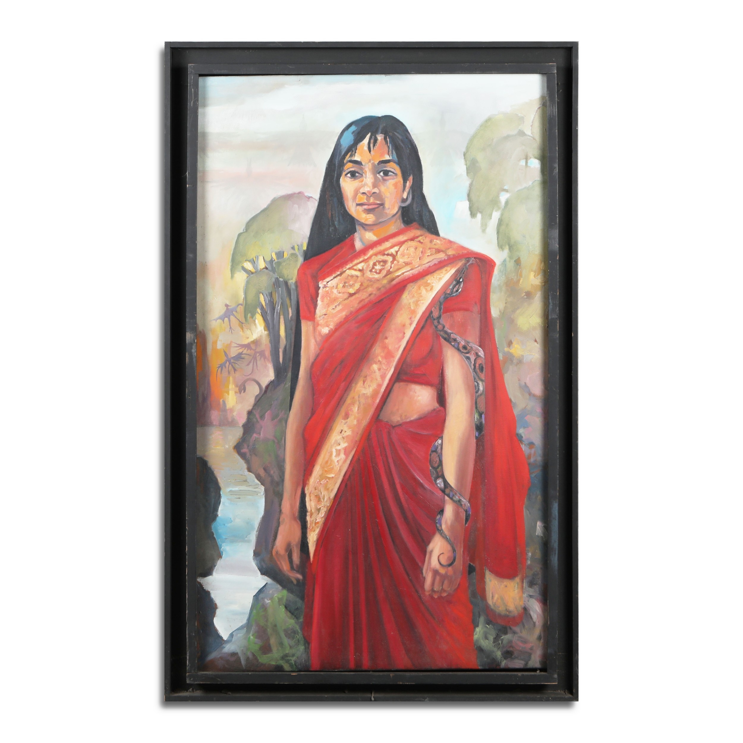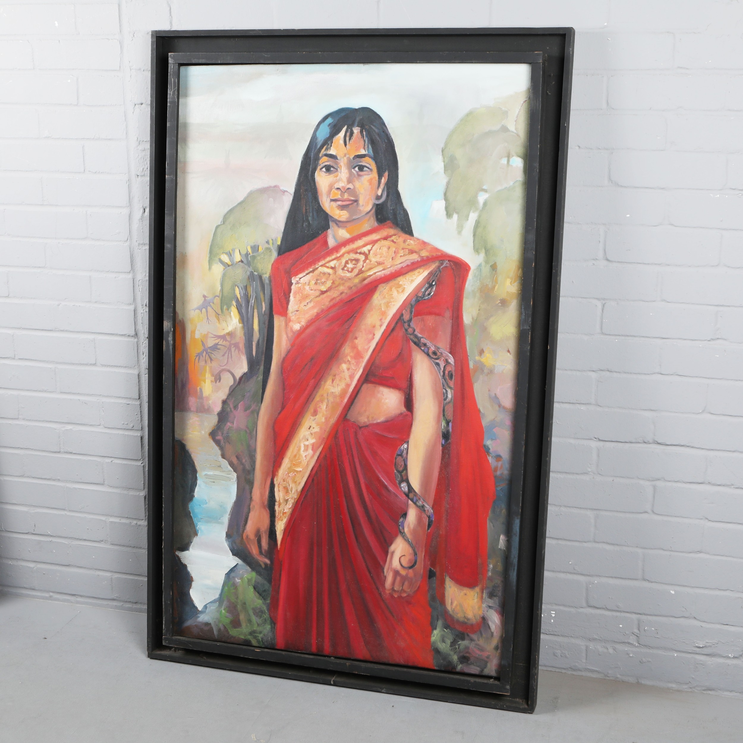 ROBERT ORMESHER (20TH CENTURY BRITISH). PORTRAIT OF AN INDIAN GIRL WITH SNAKE. oil on canvas, 140cm x 89cm, framed.