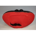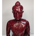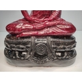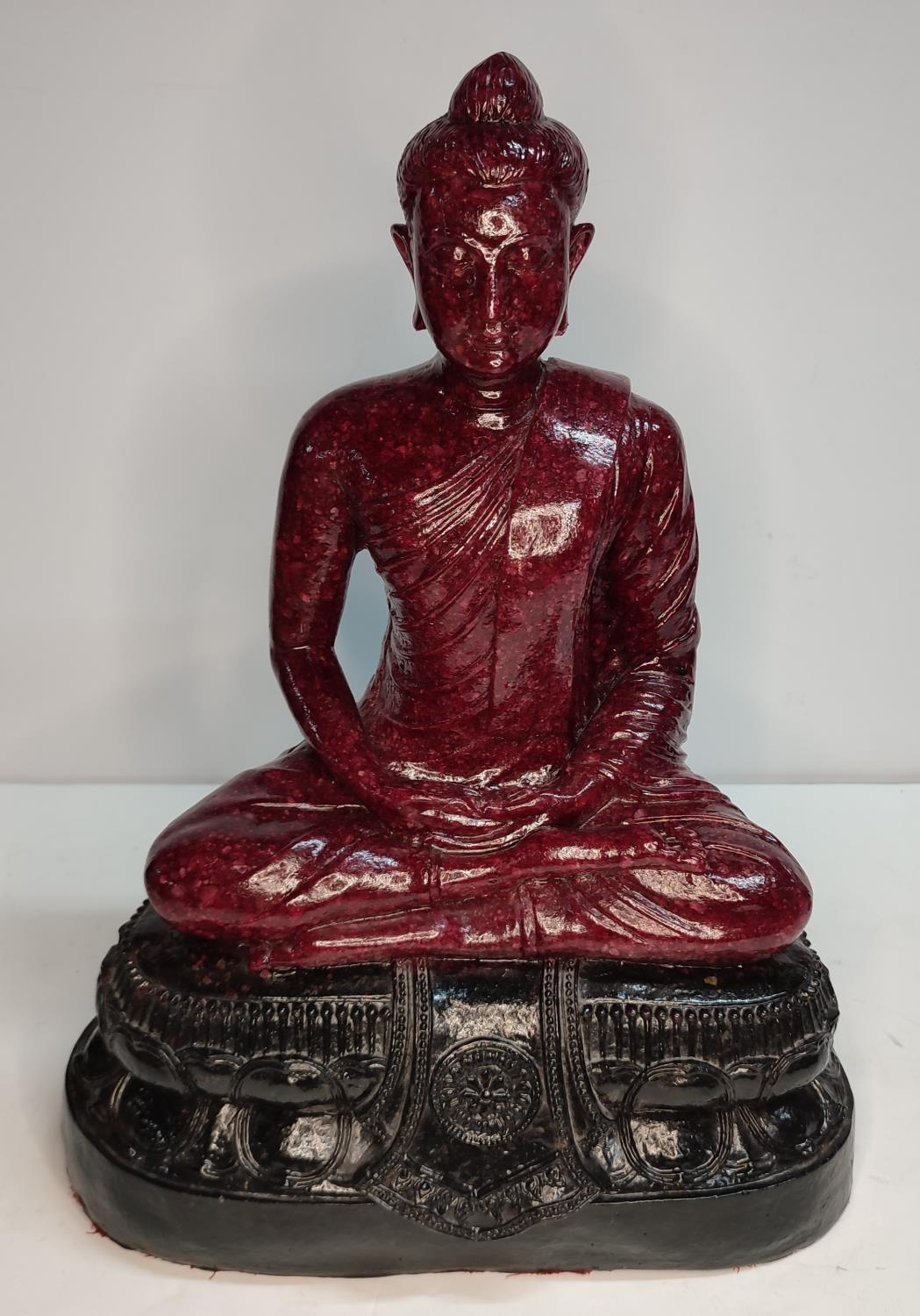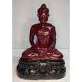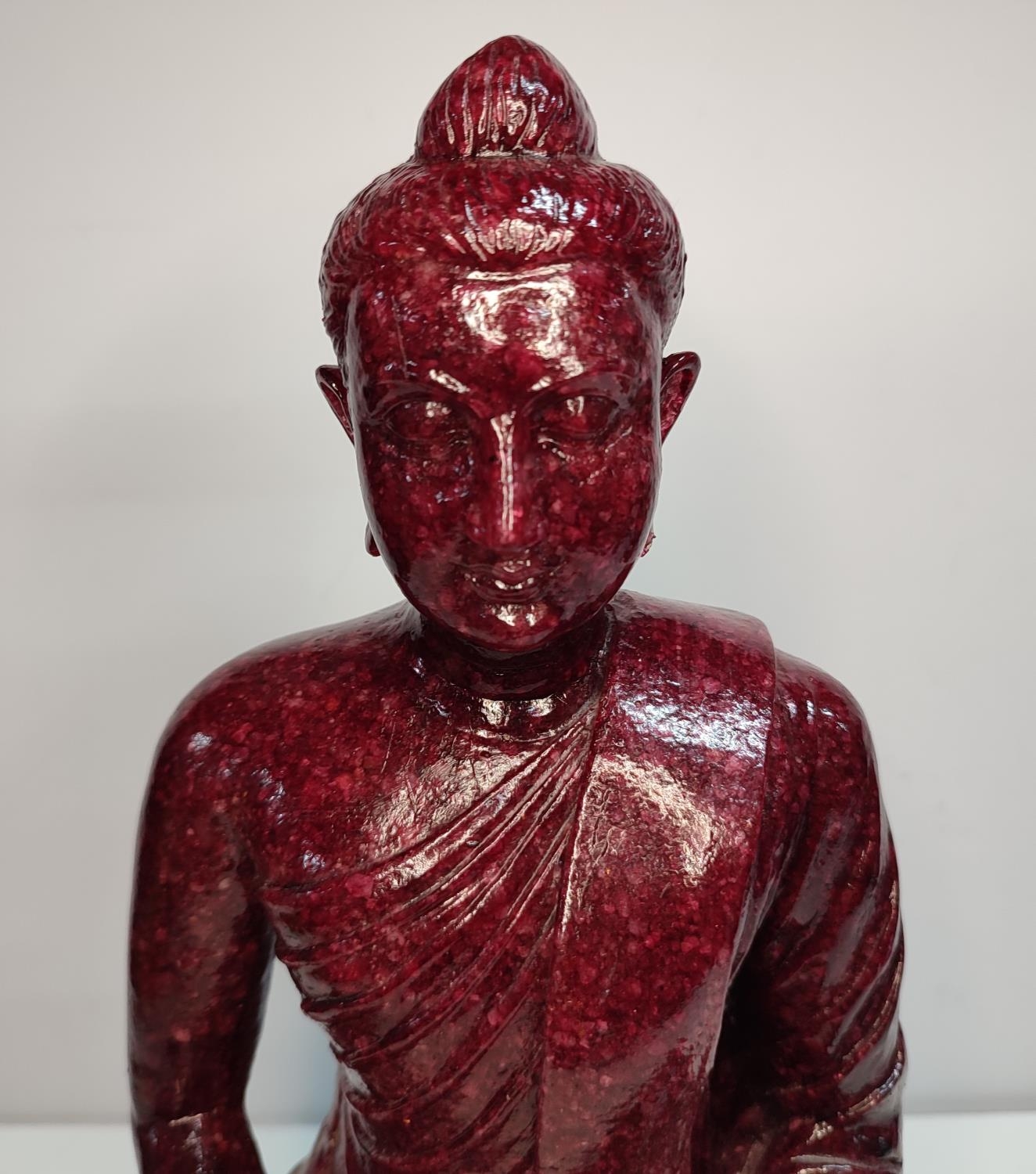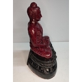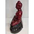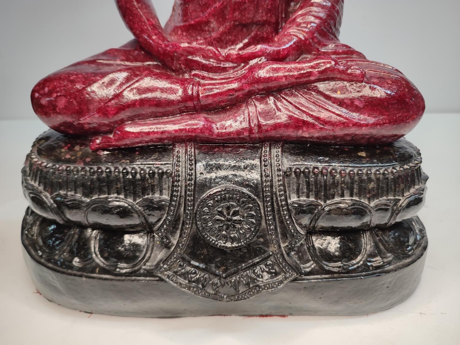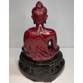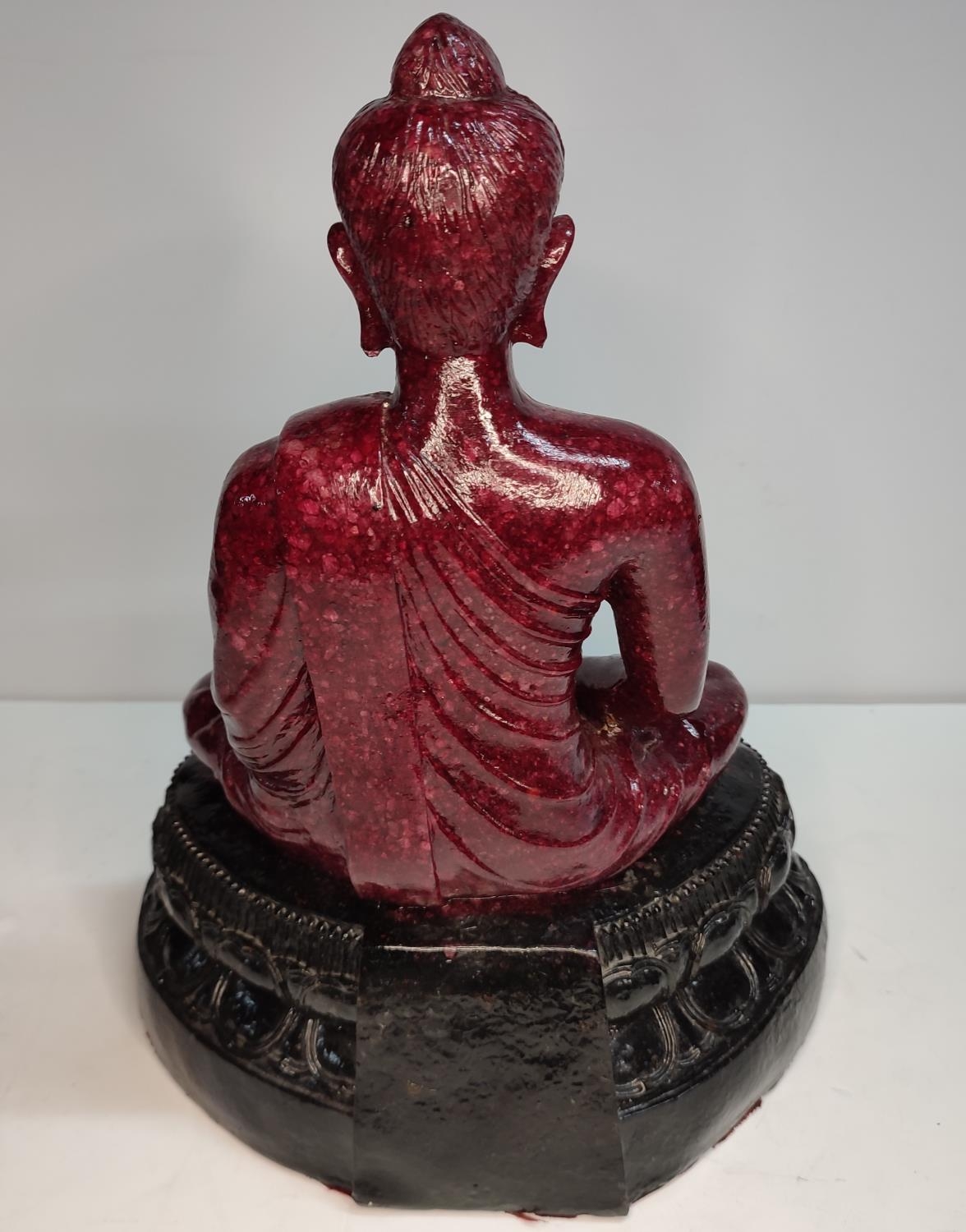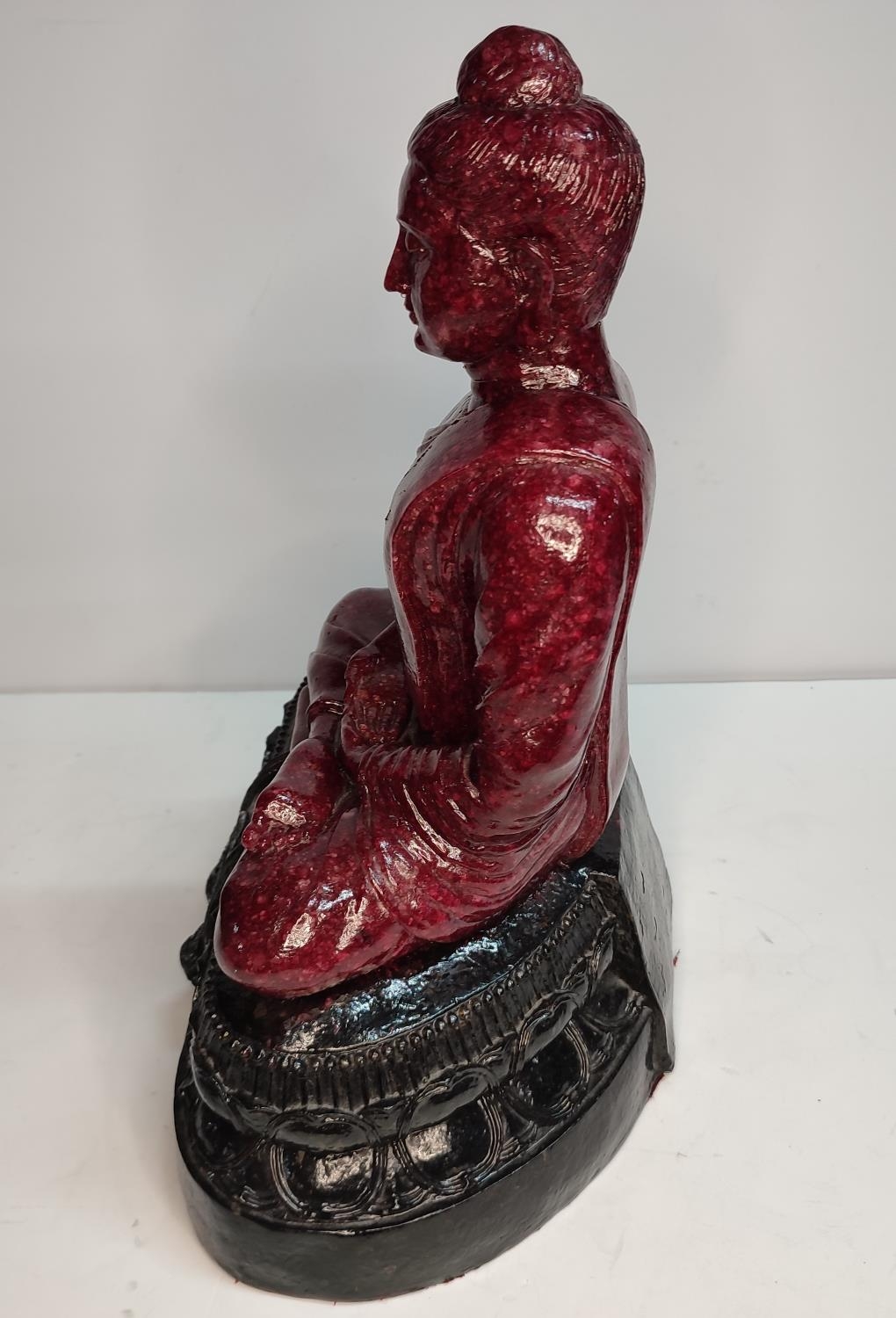 Extremely rare, large, Ruby-Zoisite carved seated Buddha sat on associated black Tschermakite,