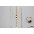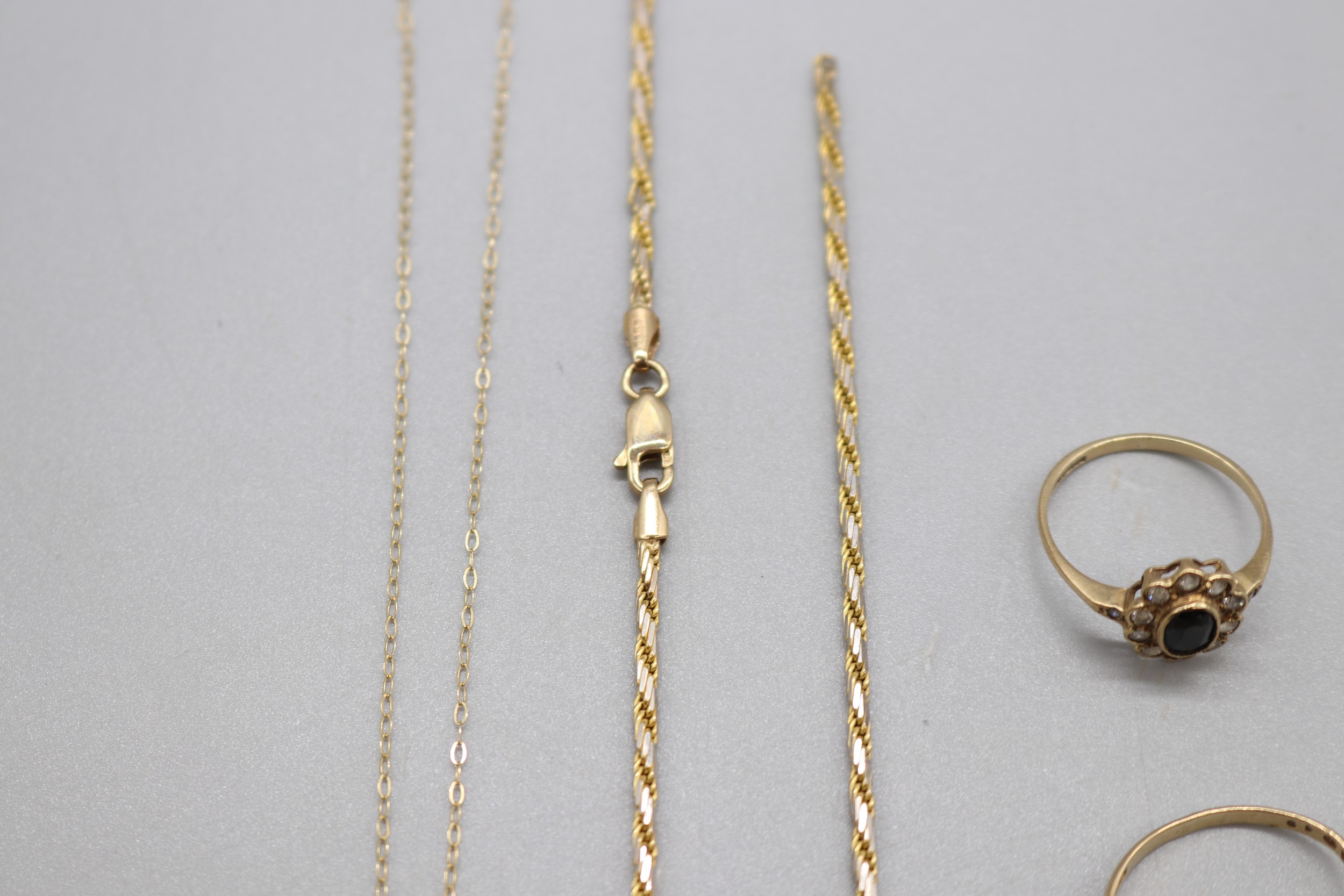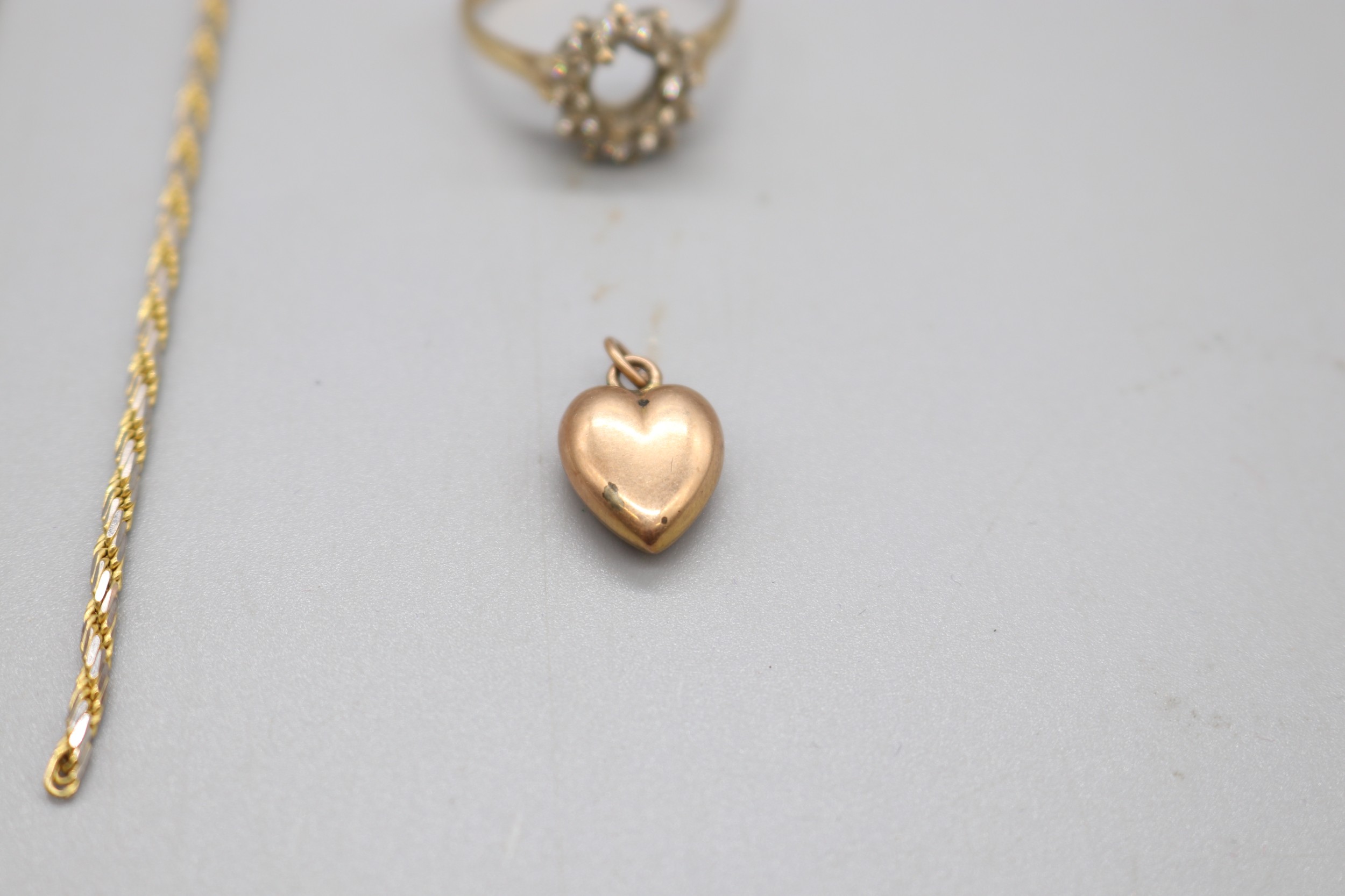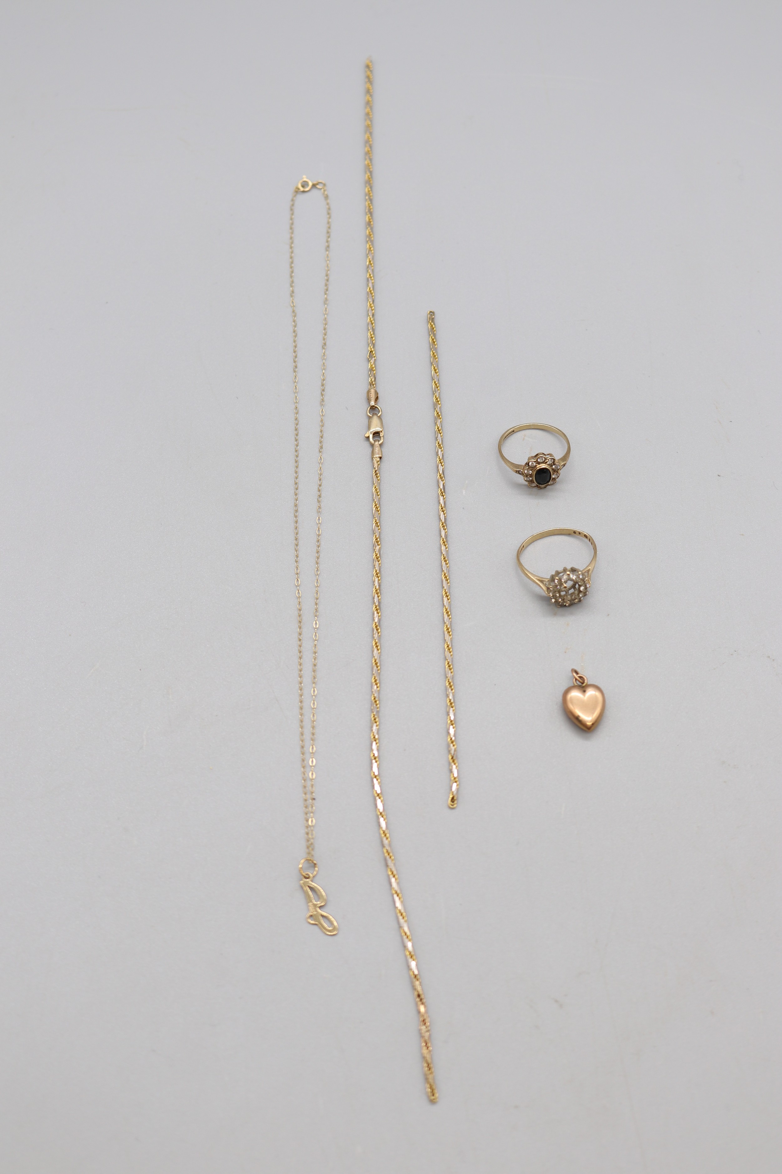 Lot of hallmarked 9ct yellow gold items, comprising an oval dark sapphire halo set ring with CZ white stones, size M, weight 1.48g; a 9ct yellow gold halo setting with CZ stones (centre stone missing), weight 1.89g; a stamped 9ct rose gold heart charm, weight 0.53g; a hallmarked 9ct yellow and white gold twisted rope link chain (with two breaks), weight 8.07g; and a 9ct yellow gold letter “J” pendant, stamped 9ct on a stamped 9ct yellow gold chain weight 0.65g