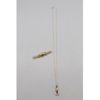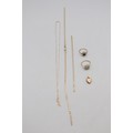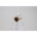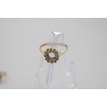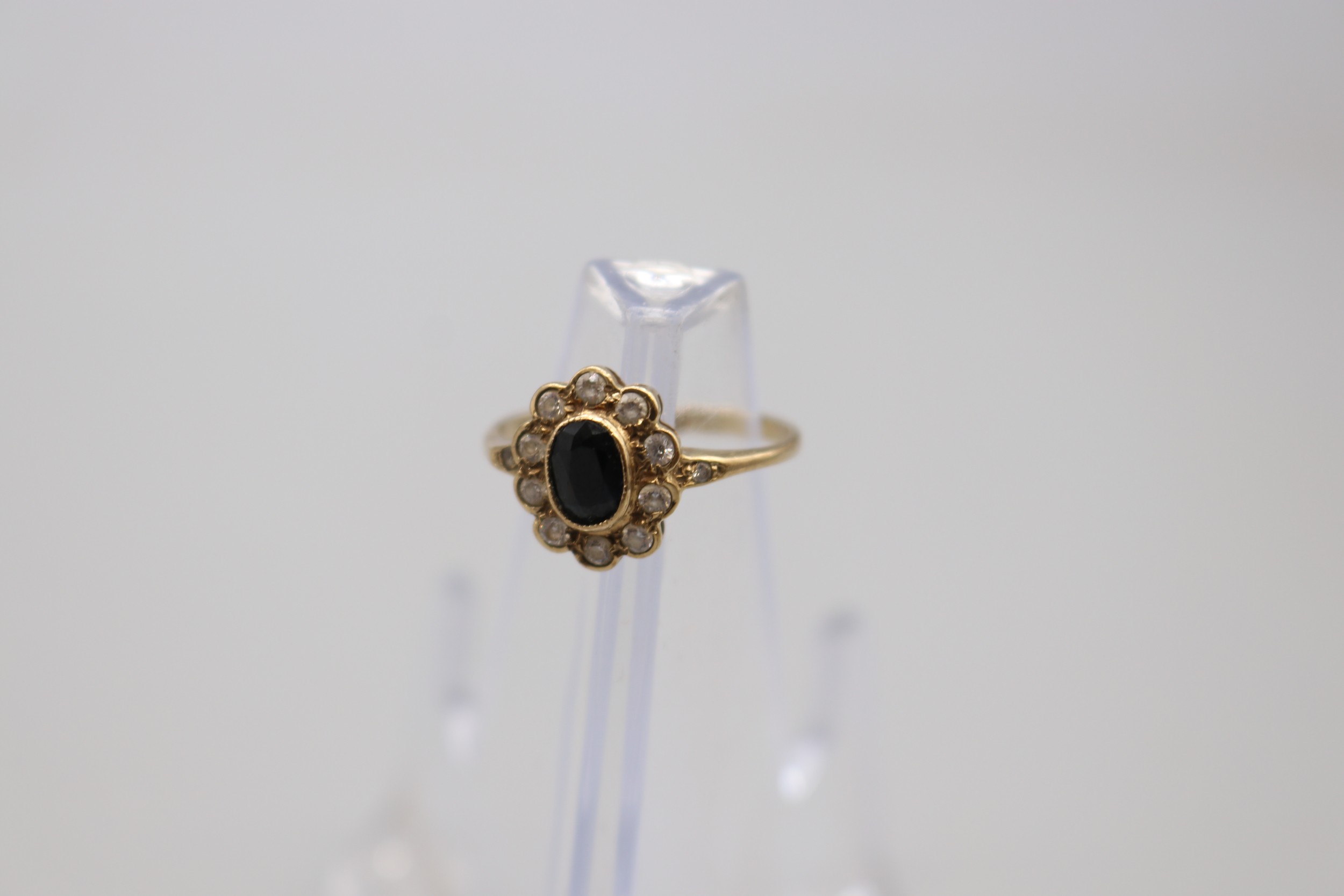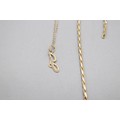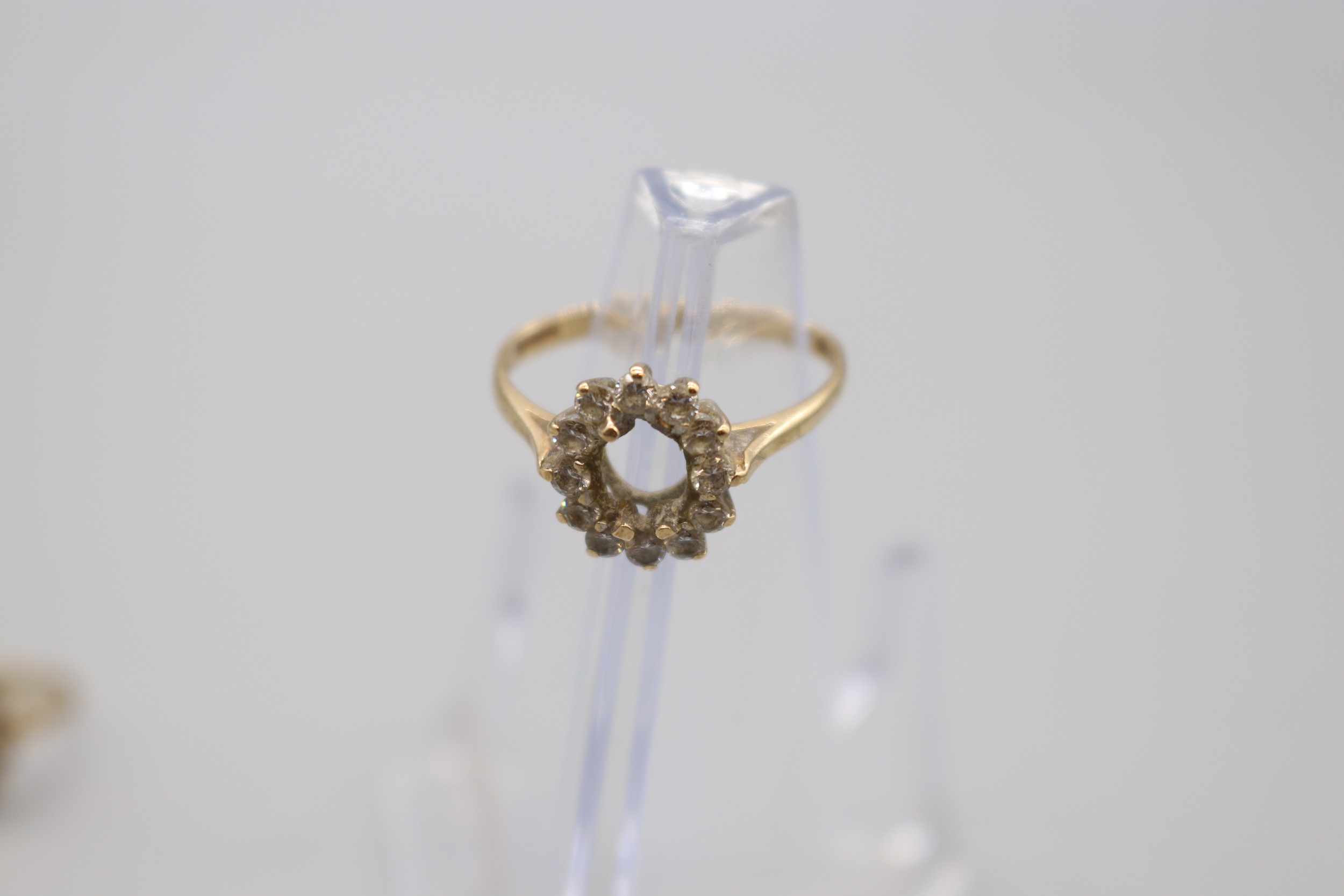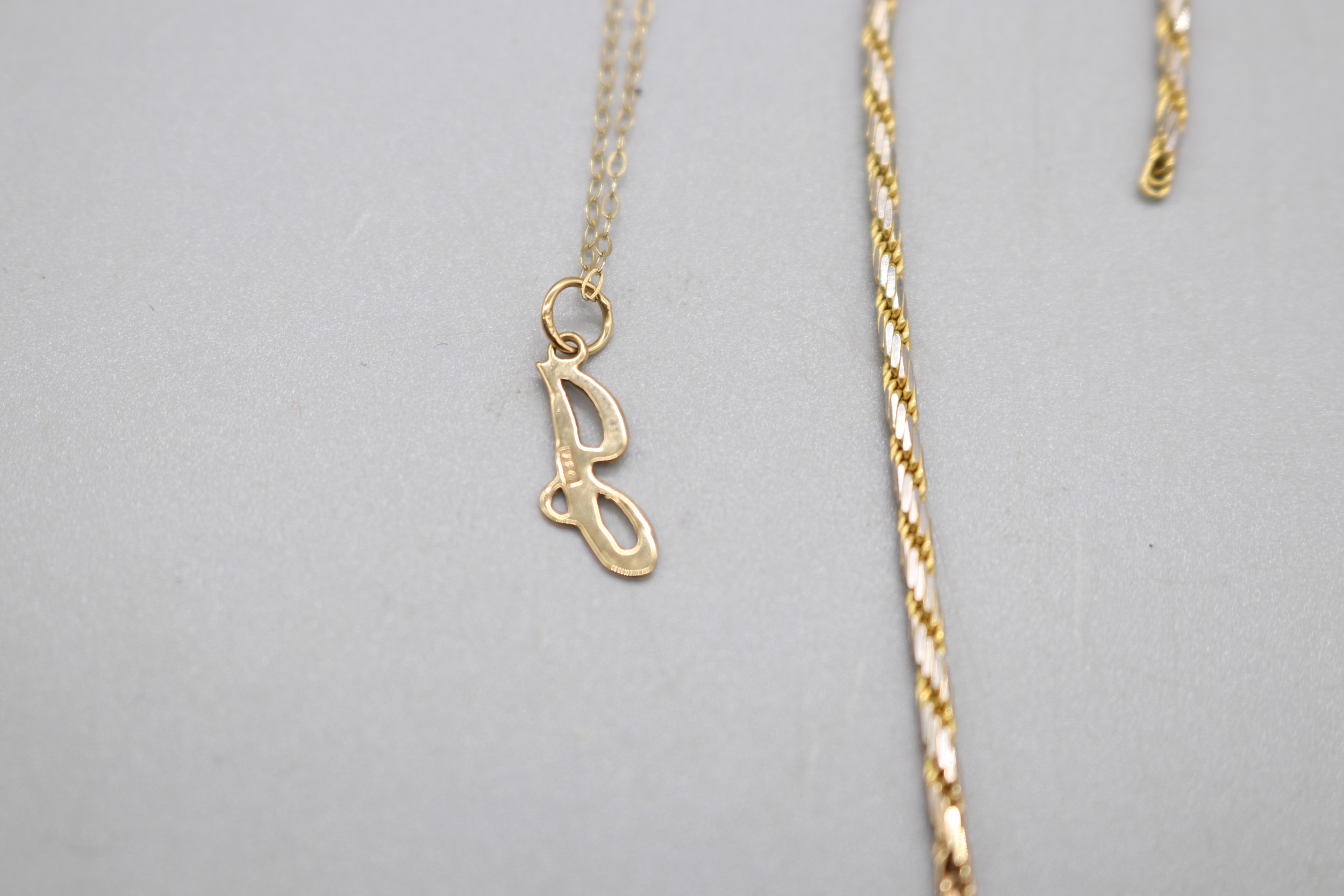 Lot of hallmarked 9ct yellow gold items, comprising an oval dark sapphire halo set ring with CZ white stones, size M, weight 1.48g; a 9ct yellow gold halo setting with CZ stones (centre stone missing), weight 1.89g; a stamped 9ct rose gold heart charm, weight 0.53g; a hallmarked 9ct yellow and white gold twisted rope link chain (with two breaks), weight 8.07g; and a 9ct yellow gold letter “J” pendant, stamped 9ct on a stamped 9ct yellow gold chain weight 0.65g