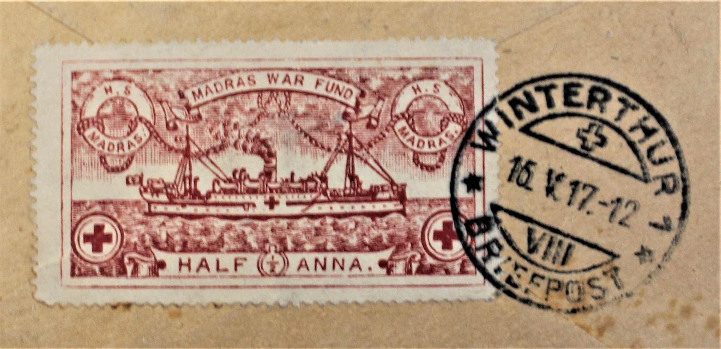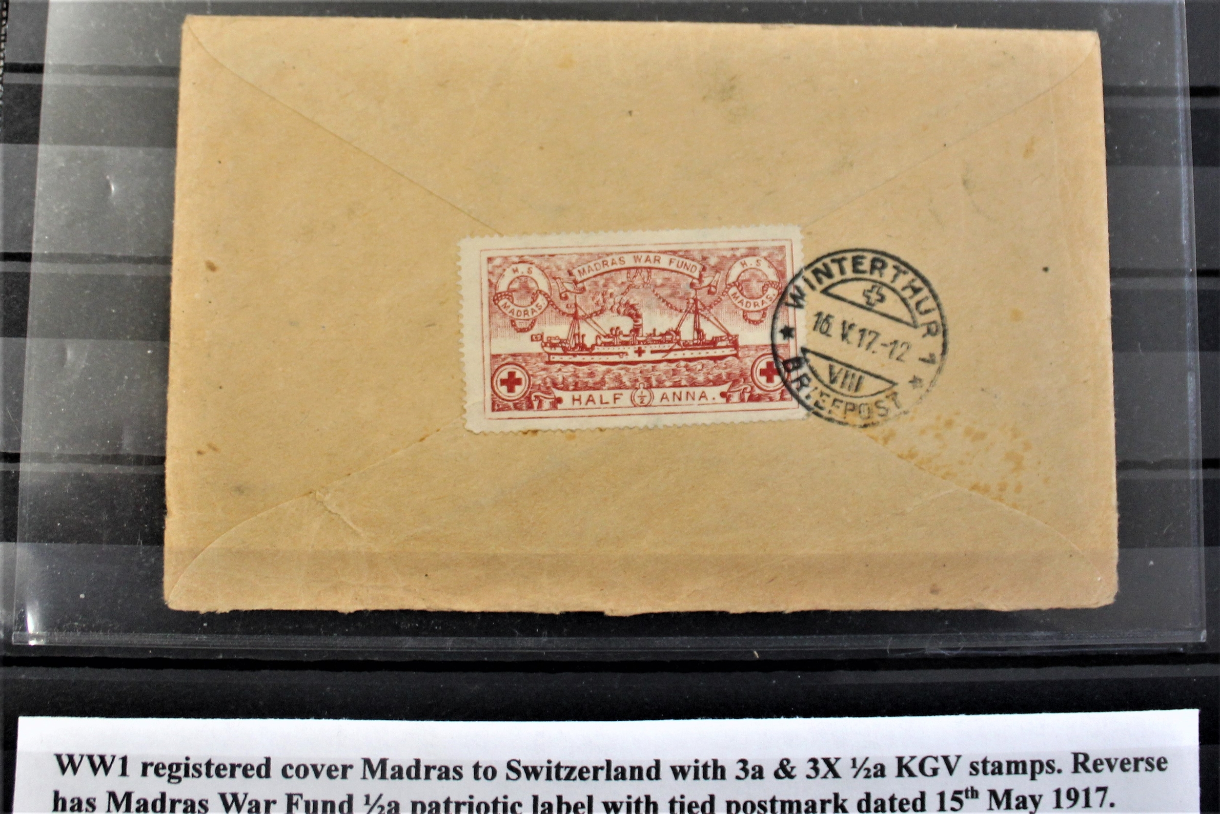 Patriotic and Propaganda Cinderella Labels - 1917 dated cover posted India to Switzerland with 1/23 anna Madras War Fund label