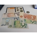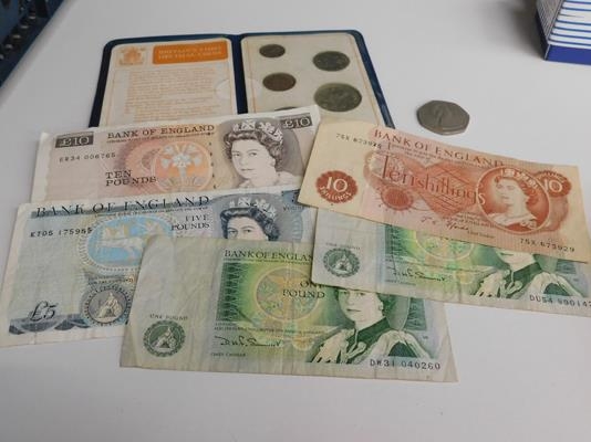 Collection of coins & bank notes £10, £5, £1 + 10 shilling