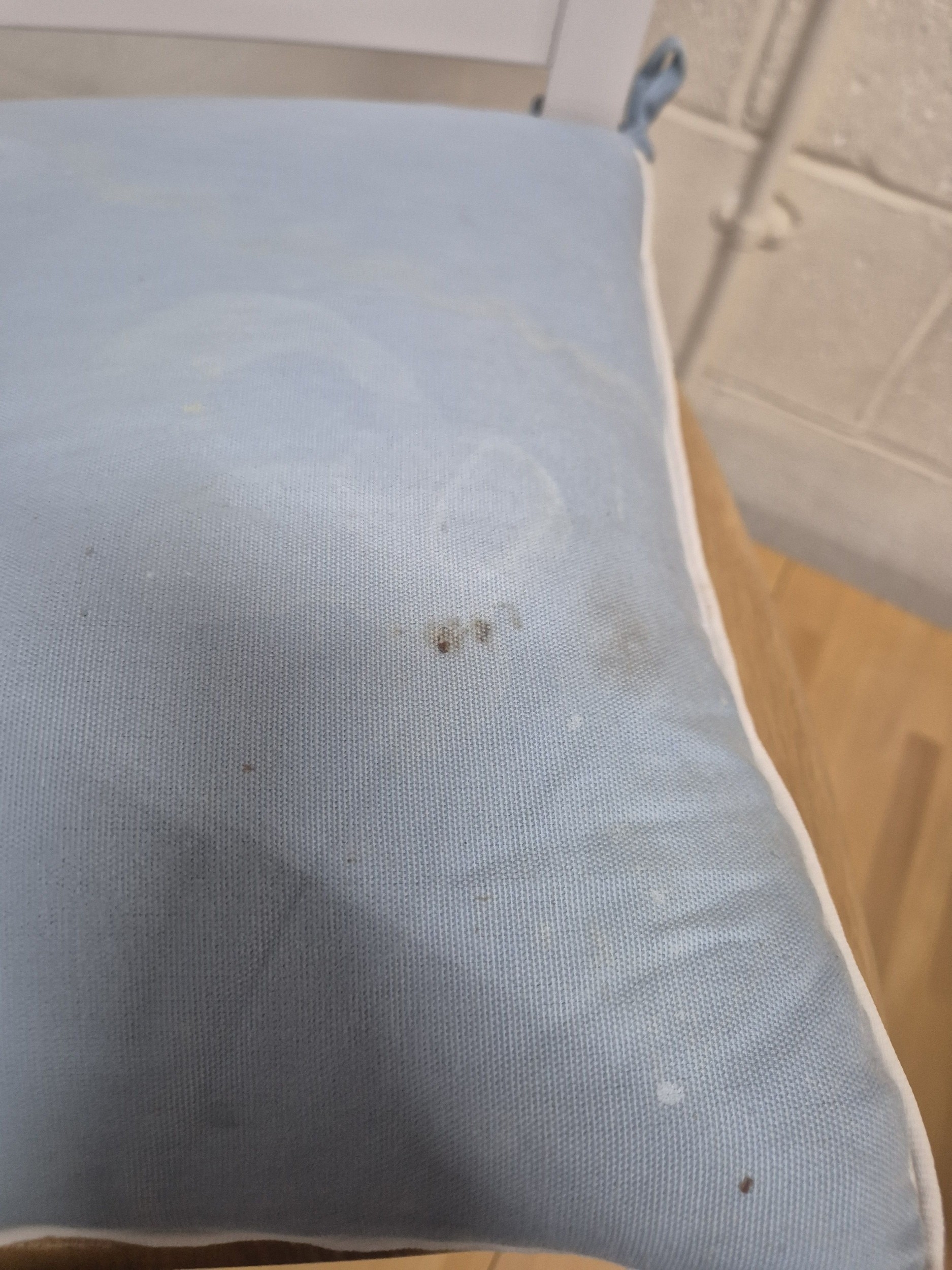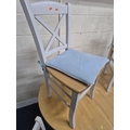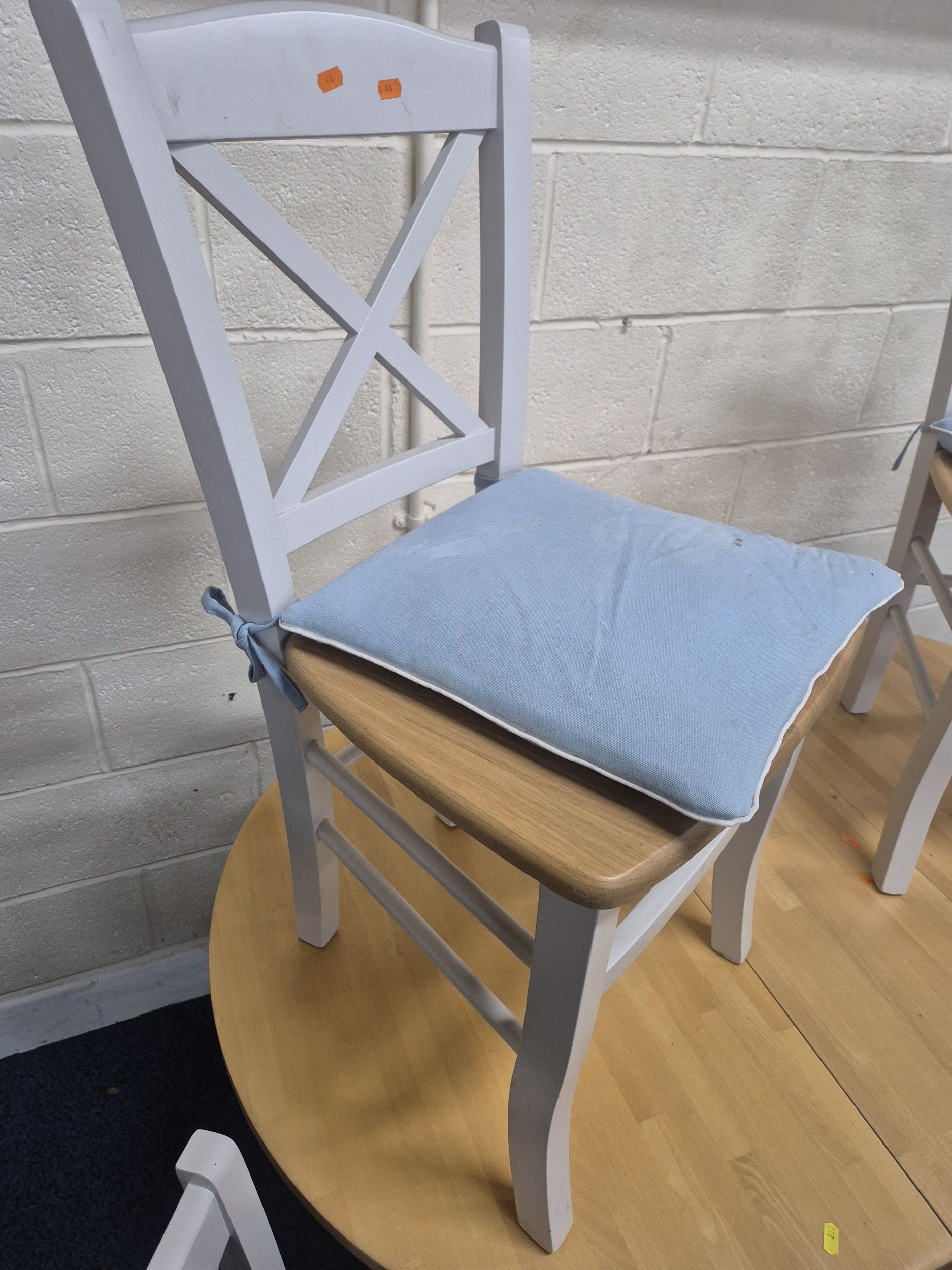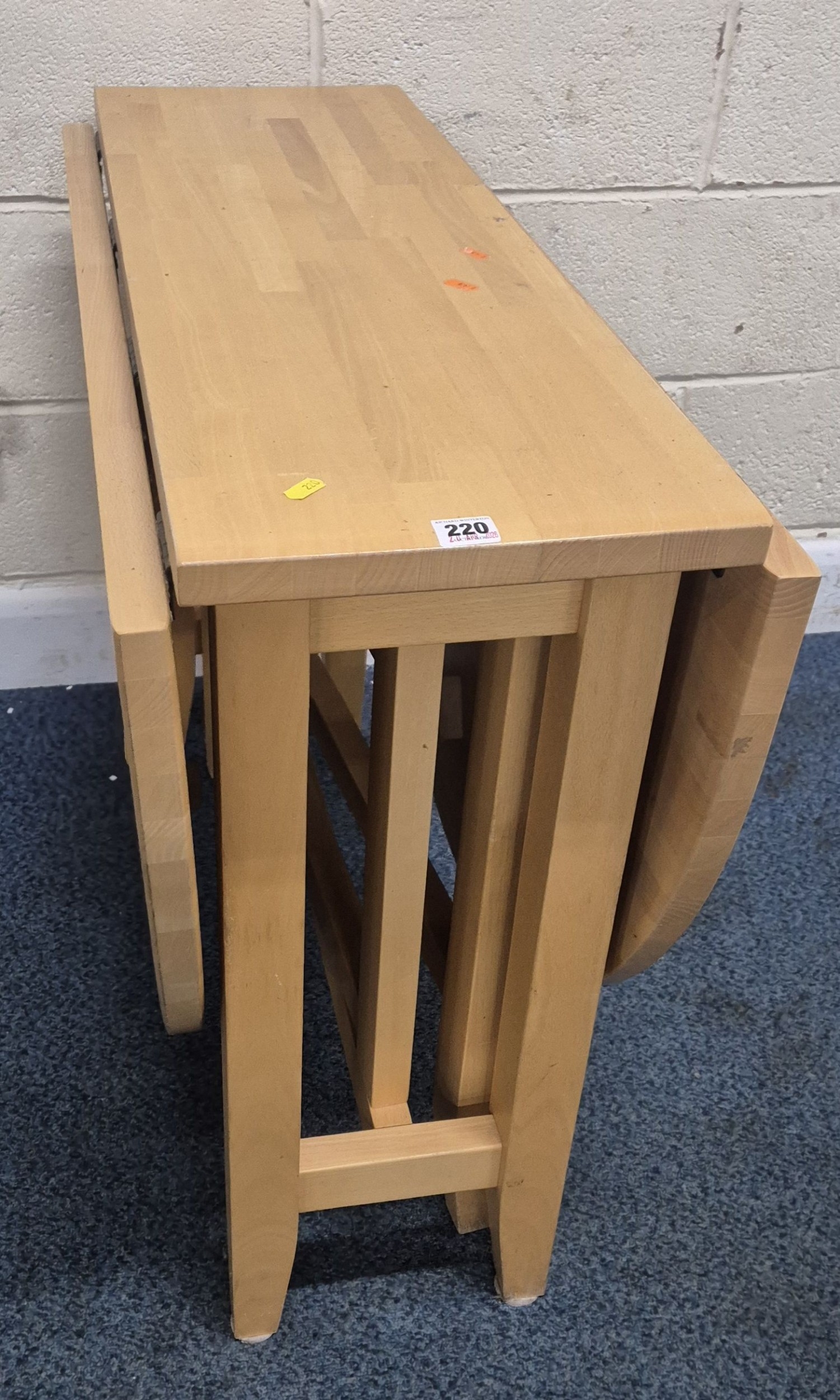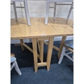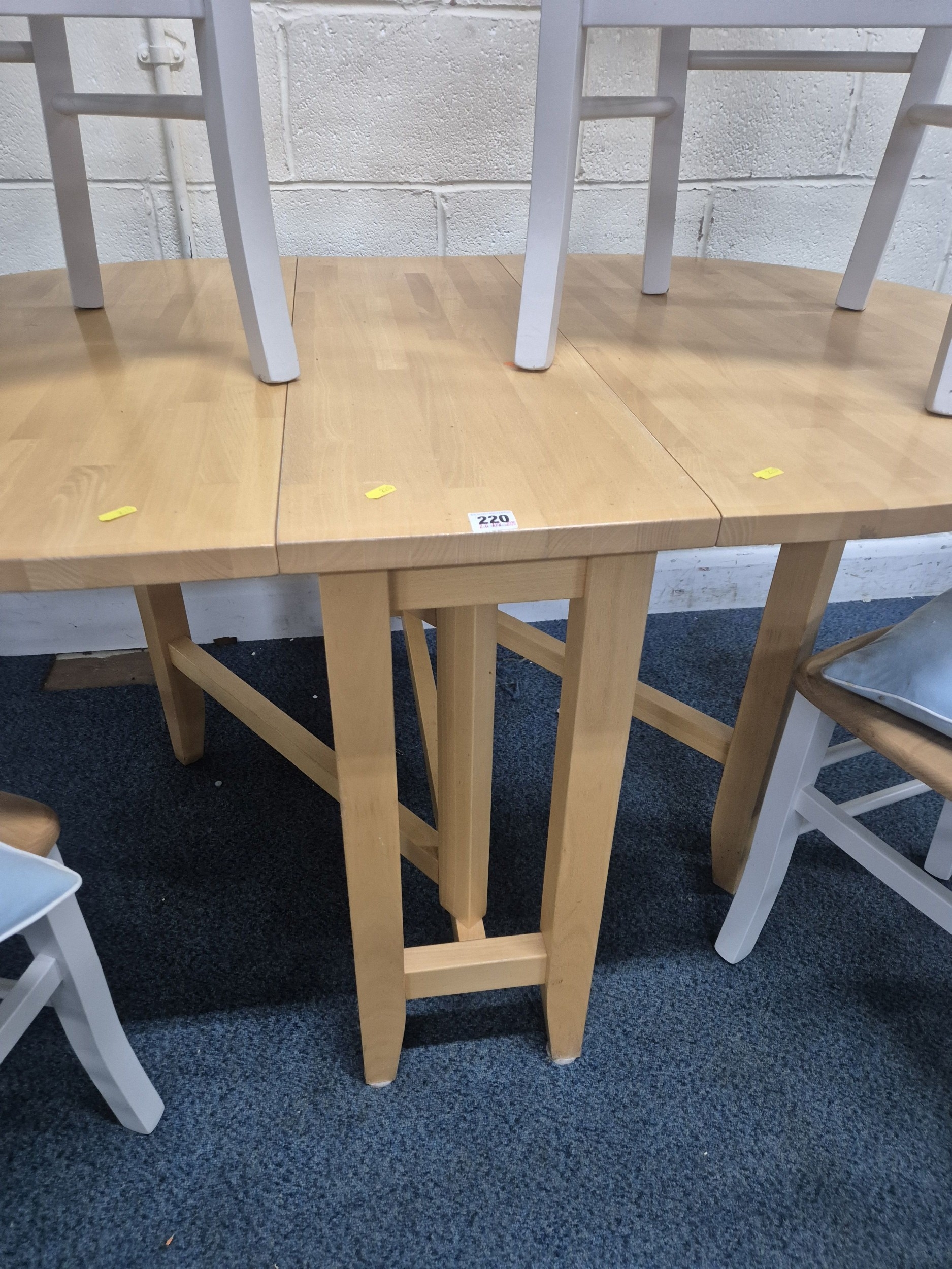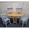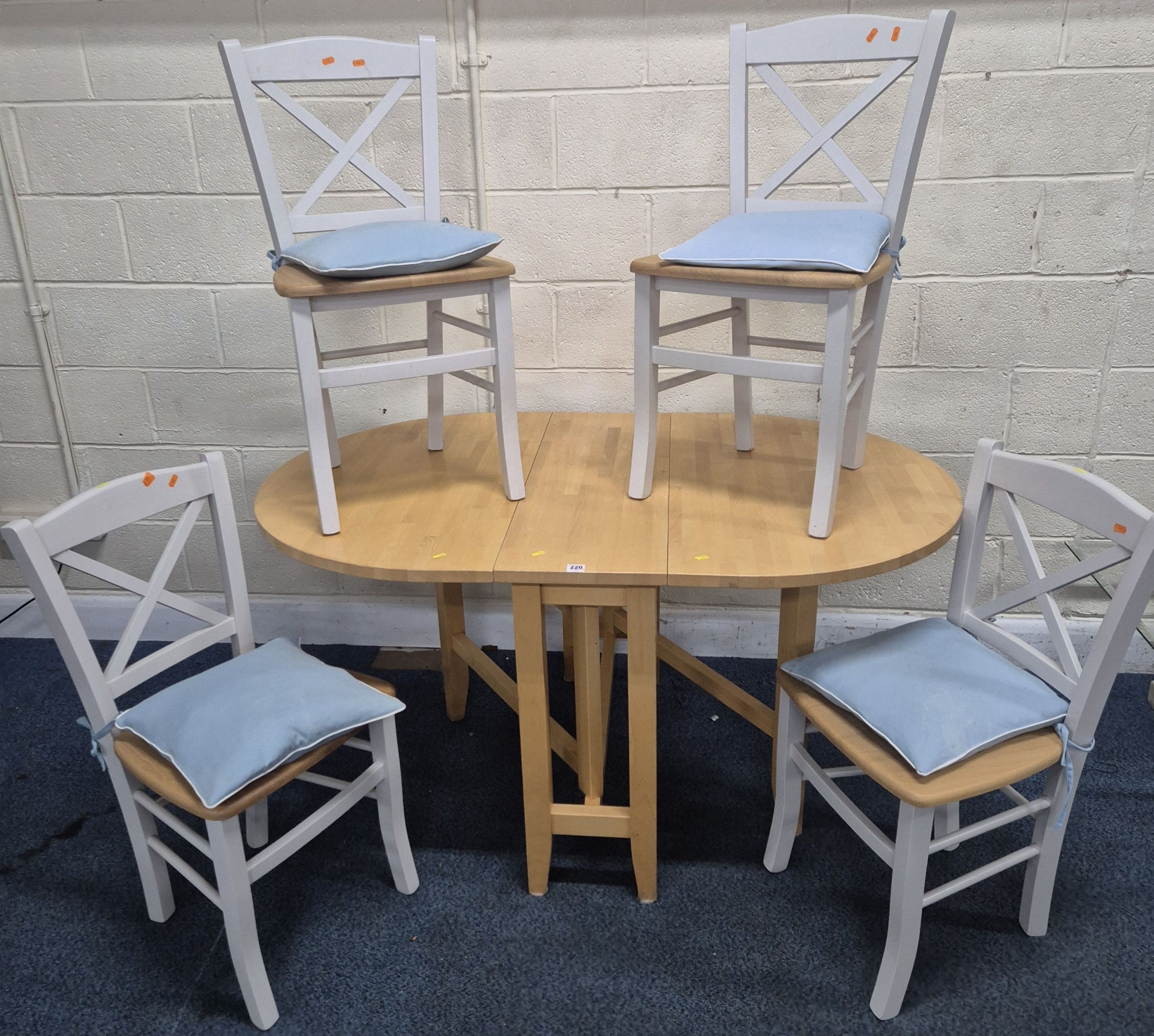 A MODERN BEECH OVAL GATE LEG TABLE, open width 146cm x closed width 38cm x depth 92cm x height 76cm, along with a set of four chairs, condition report: general signs of wear and usage, cushions need a clean (5)