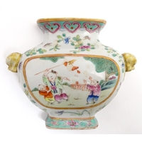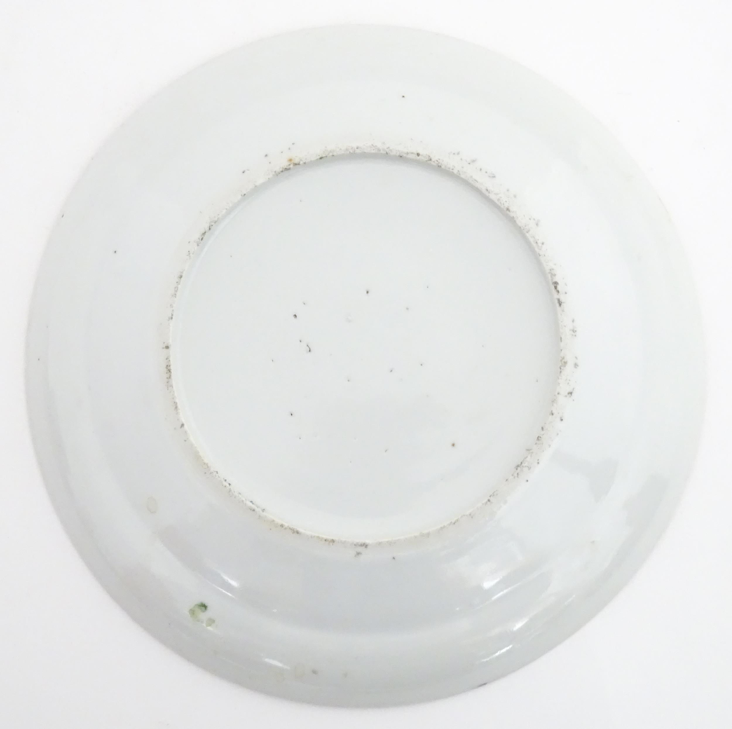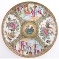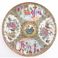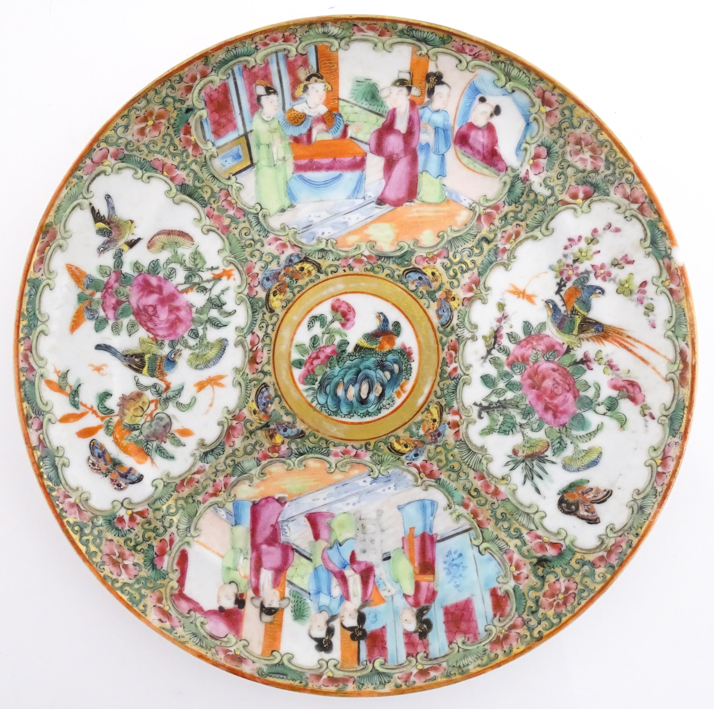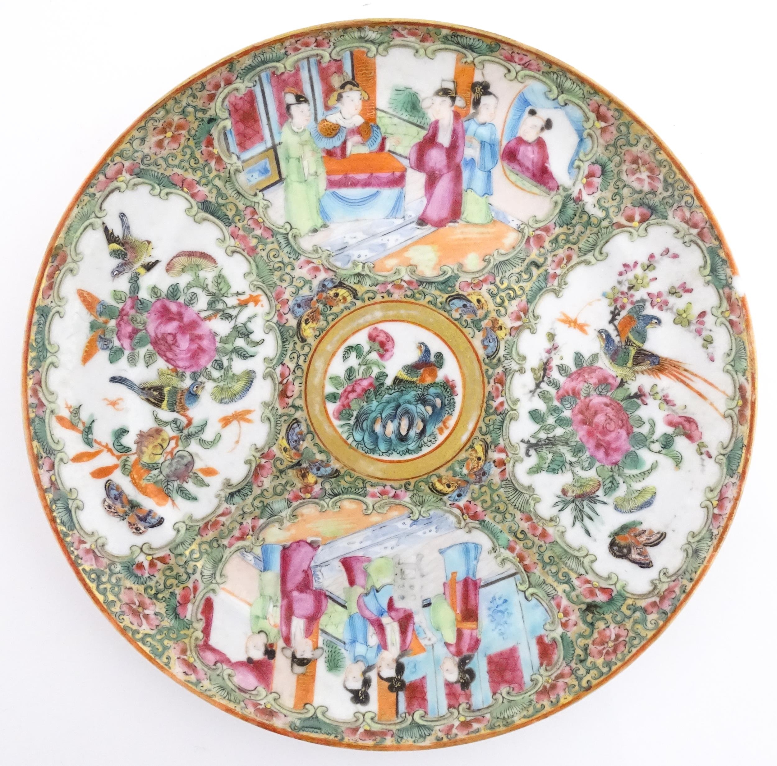 A Chinese / Cantonese famille rose plate decorated with figures, bird, butterflies and flowers. Approx. 9 1/2" diameter