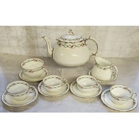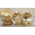 An Art Deco Tuscan tea service for six, decorated with an intricate gold filigree pattern on a white ground, gilded, comprising teapot, sugar bowl, milk jug, six teacups & saucers, six sideplates & a sandwich plate