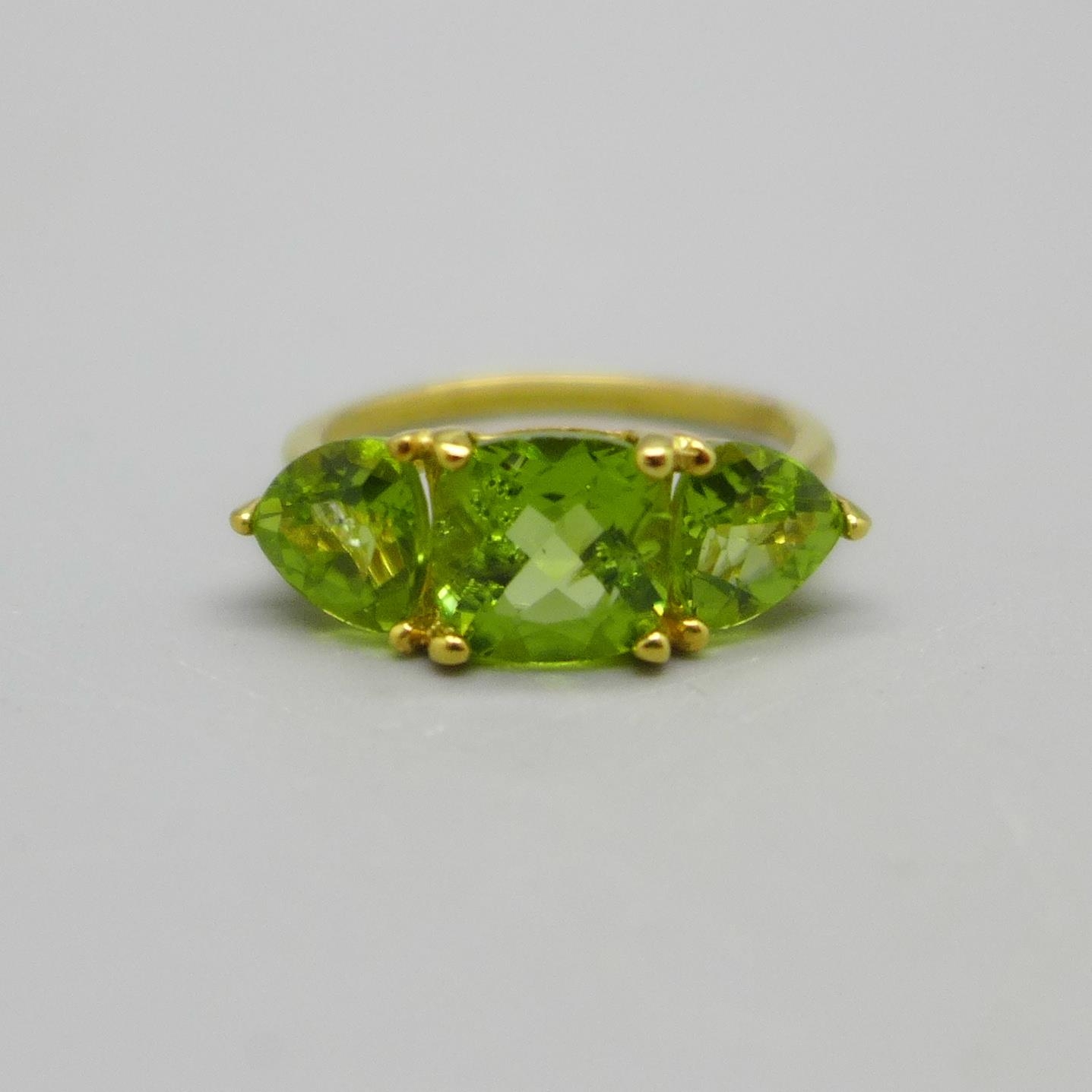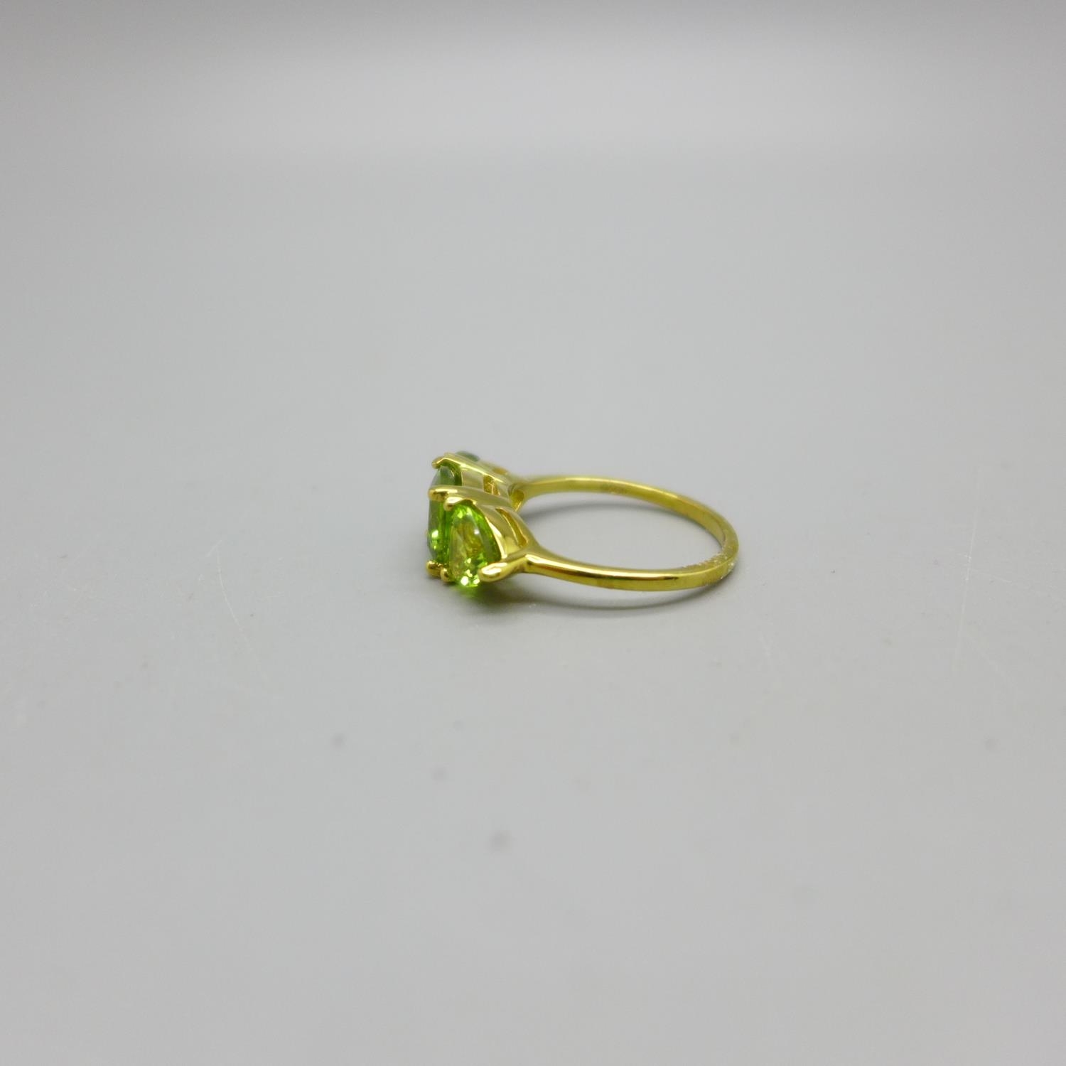 A silver gilt and peridot trilogy ring, K