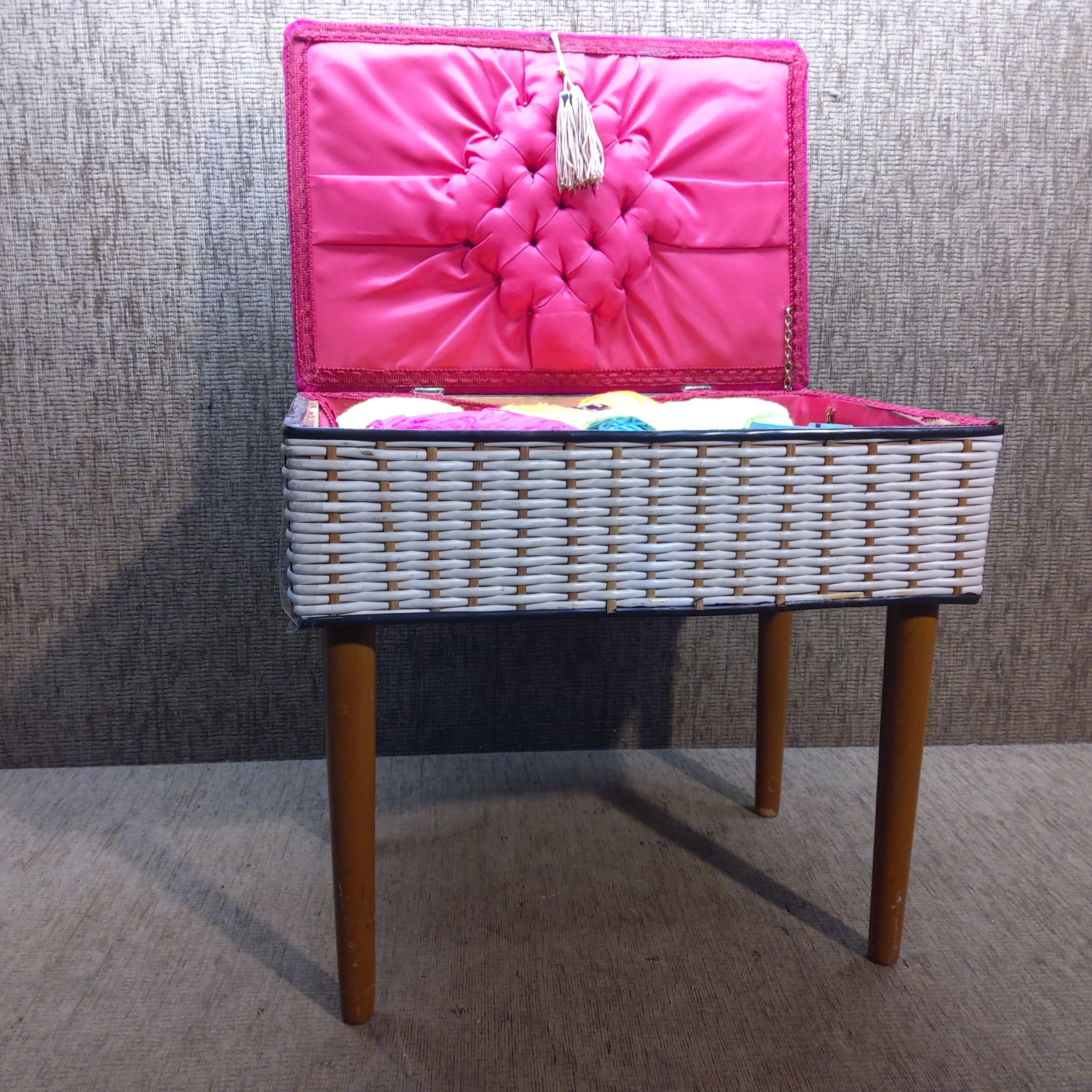 Sewing box stool with contents.