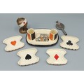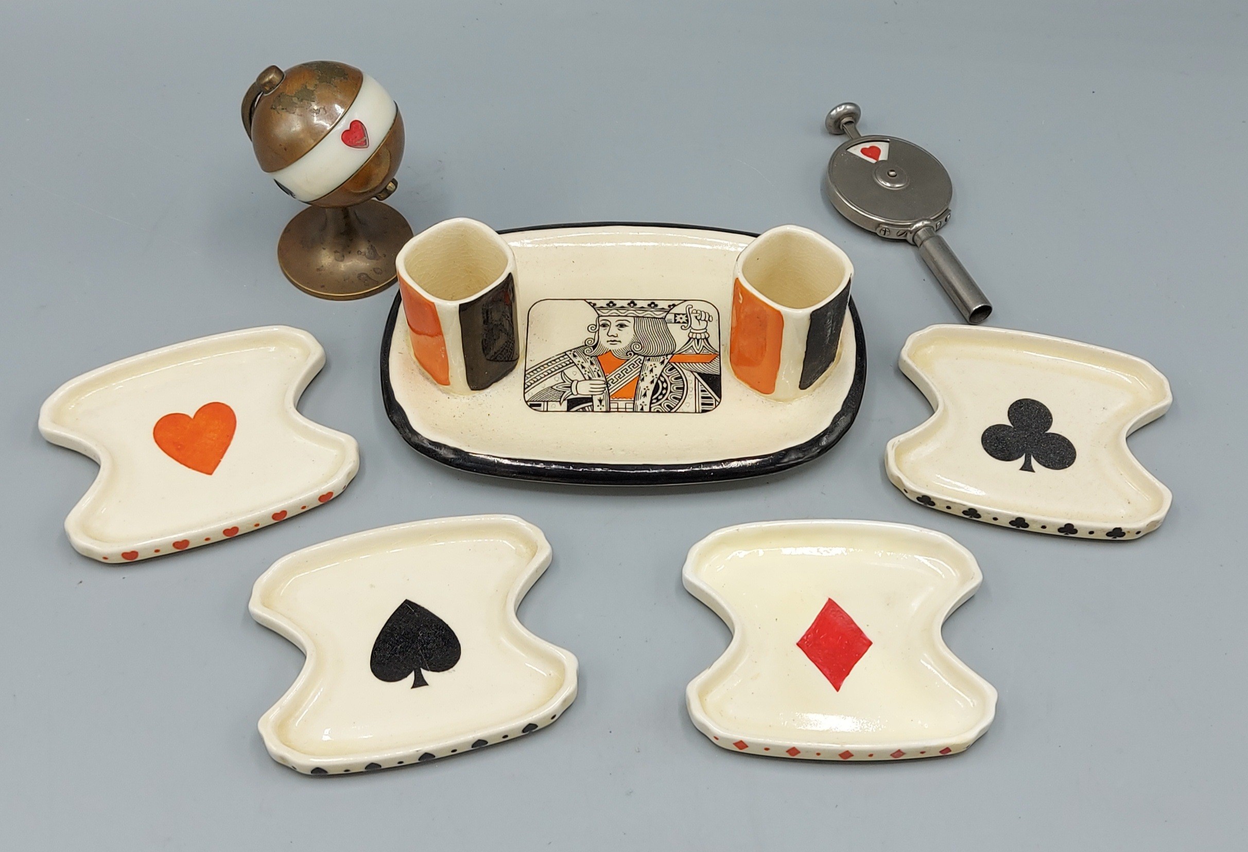 A Royal Doulton bridge set number D5096, comprising of dishes and two match holders all decorated with card suits together with two bridge markers