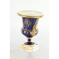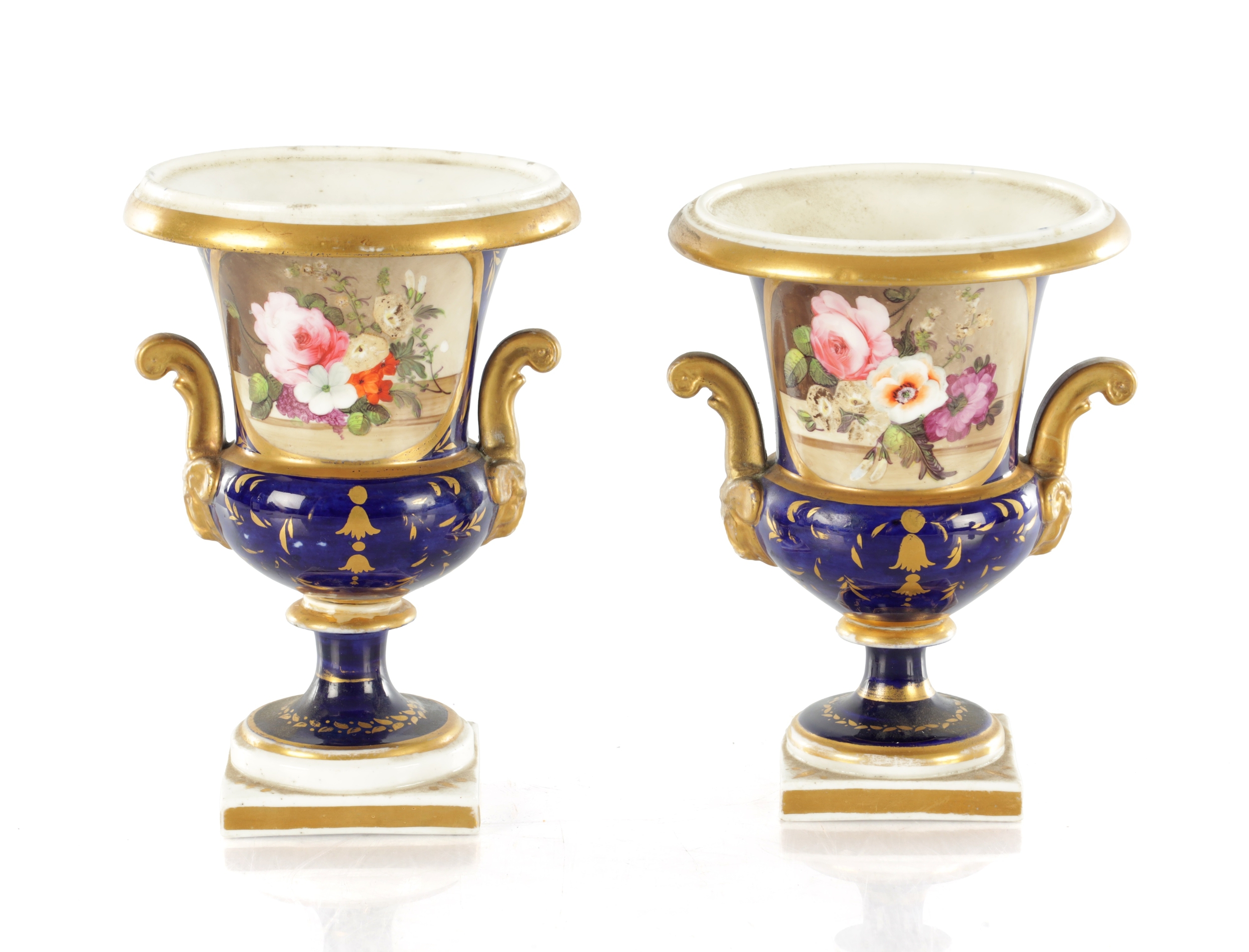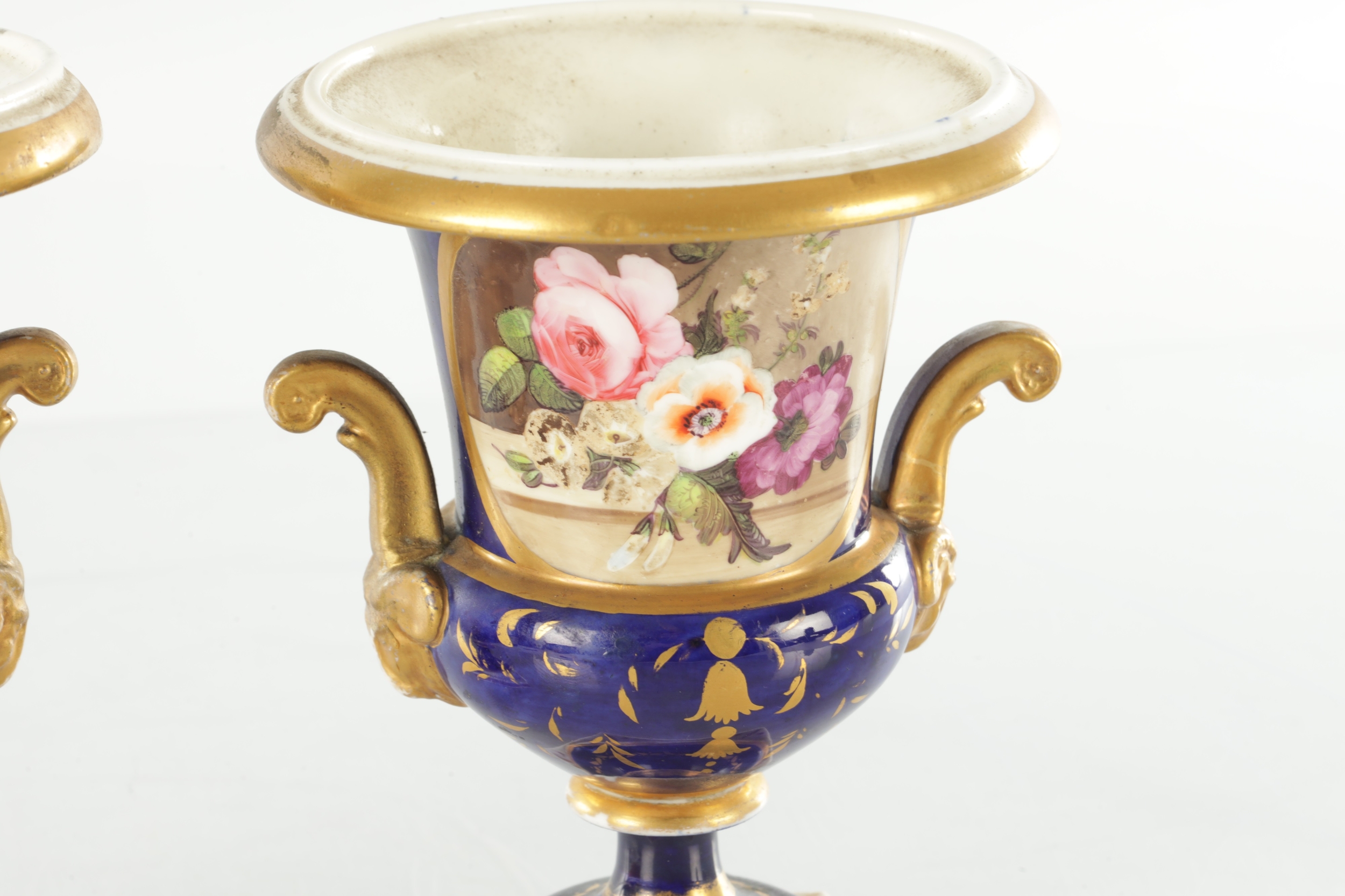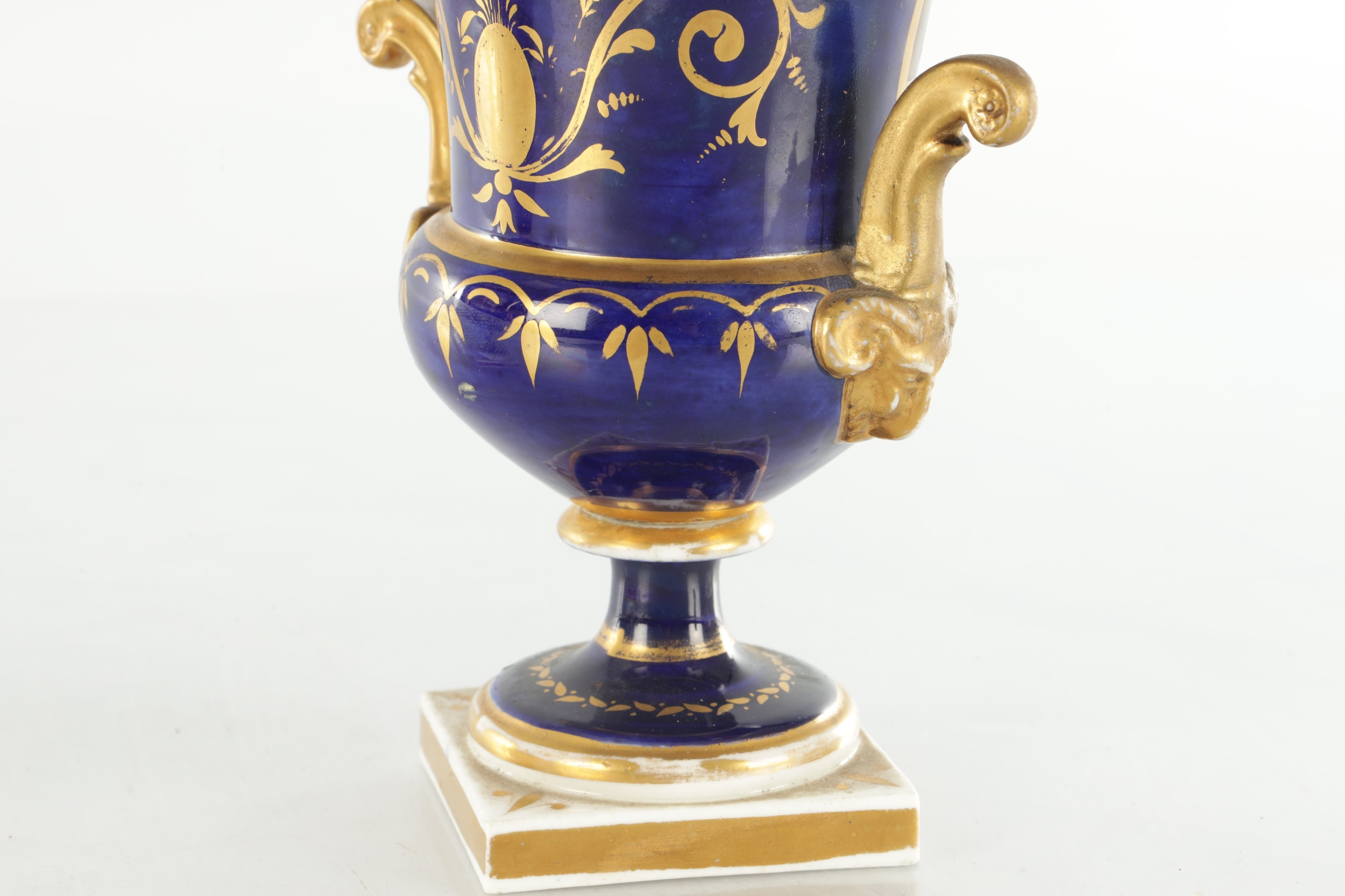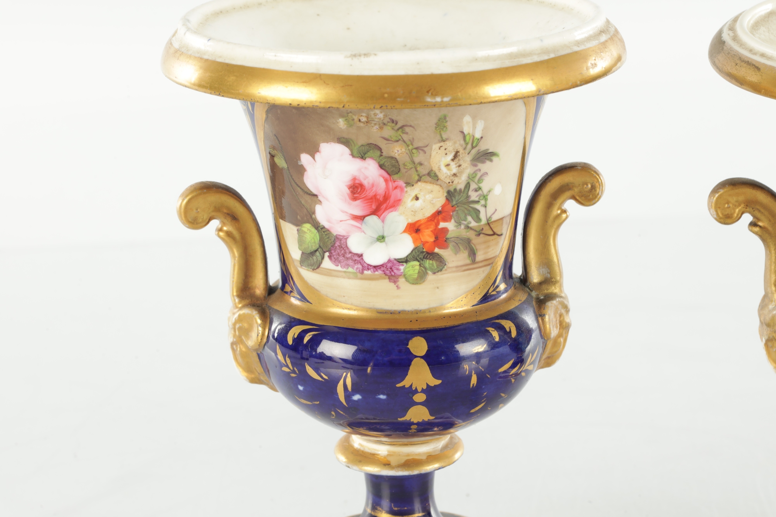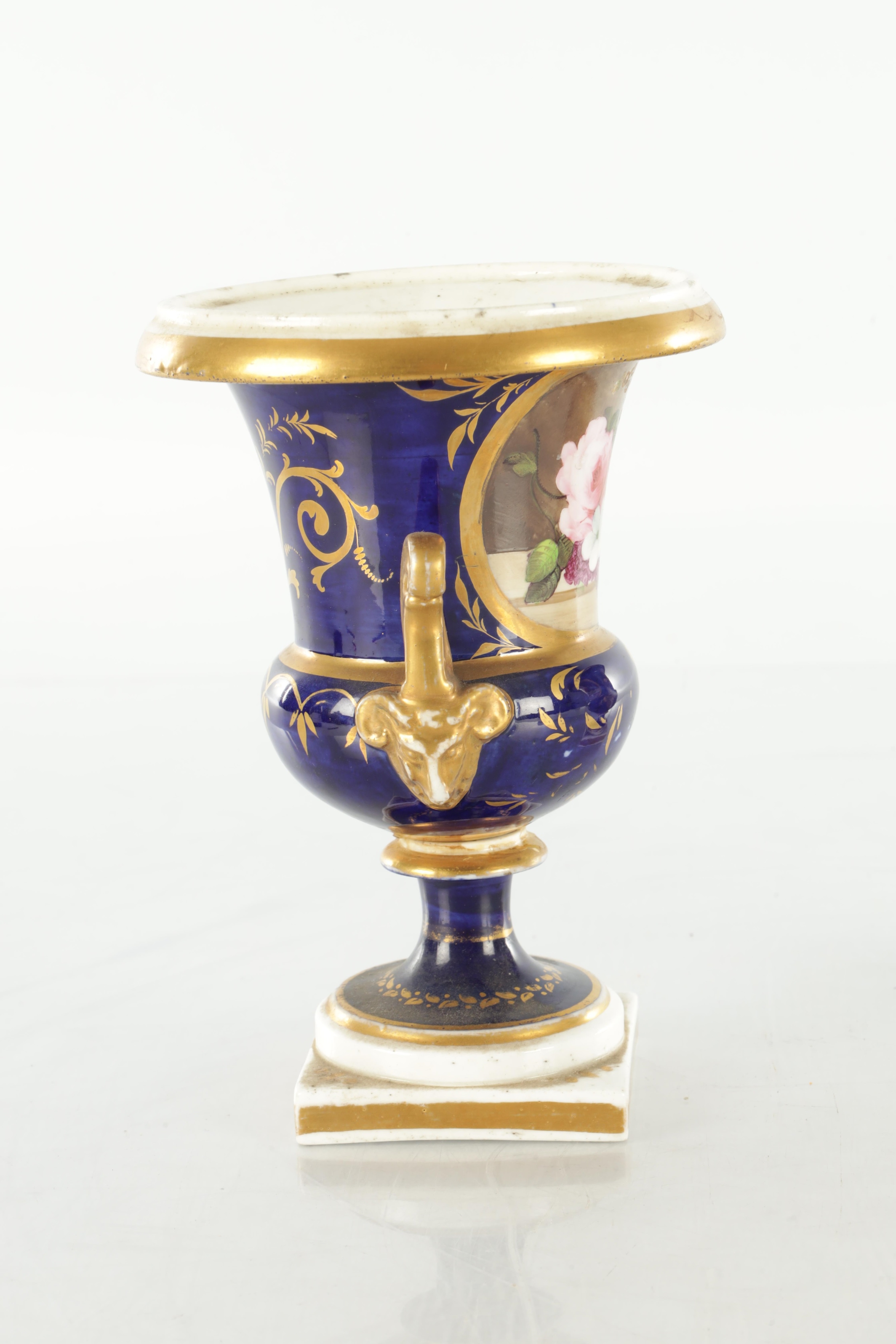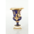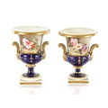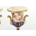 A PAIR OF 19TH CENTURY DERBY URN SHAPED VASES on royal blue ground with gilt highlights and painted flowers (17cm high )