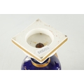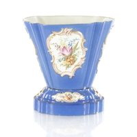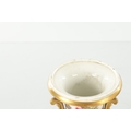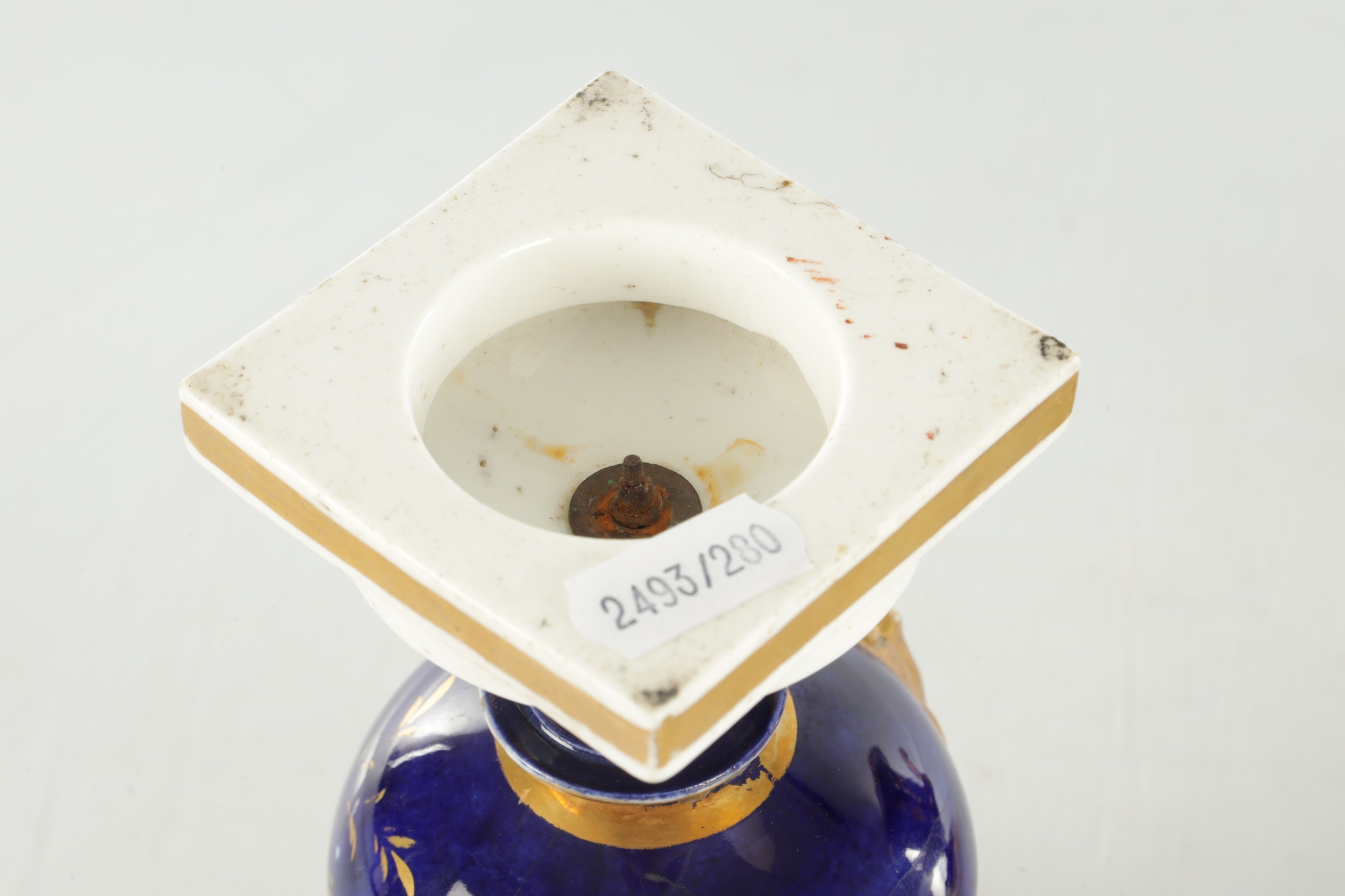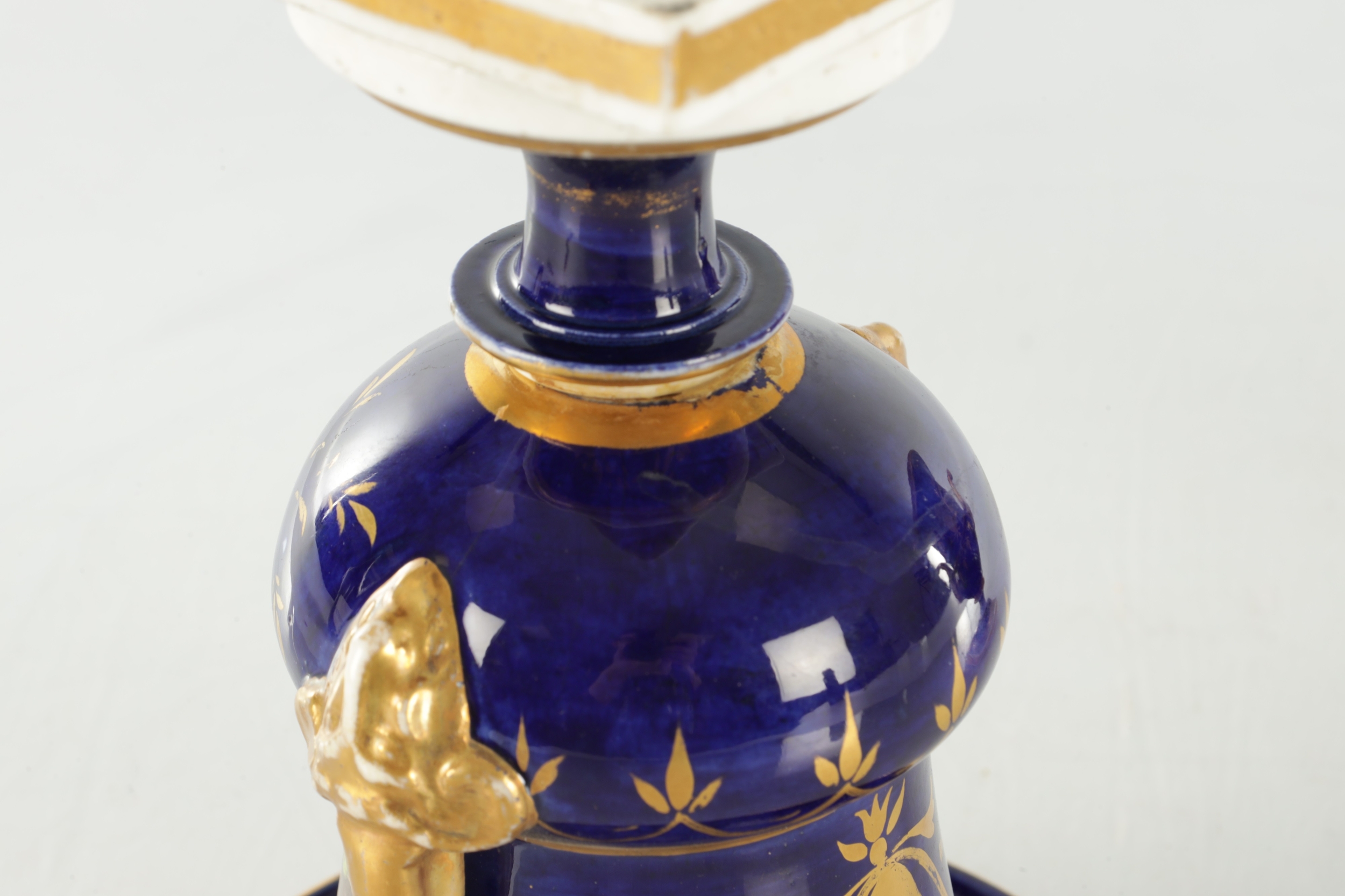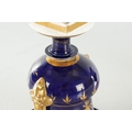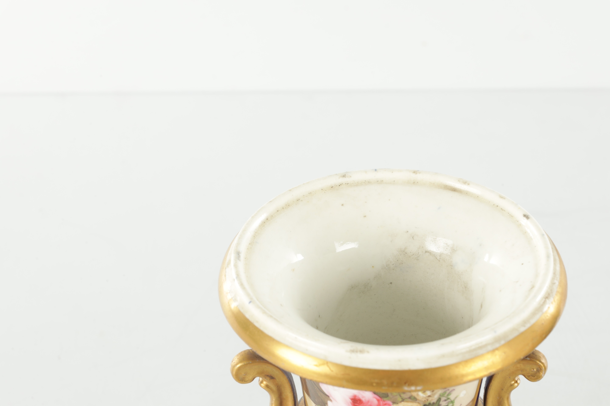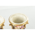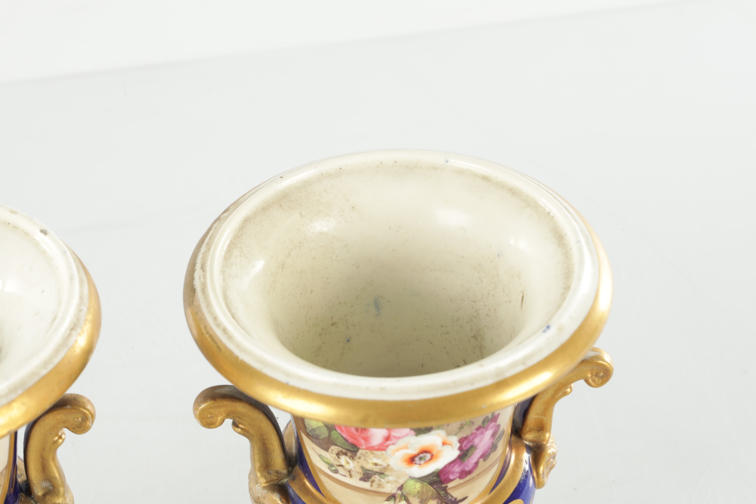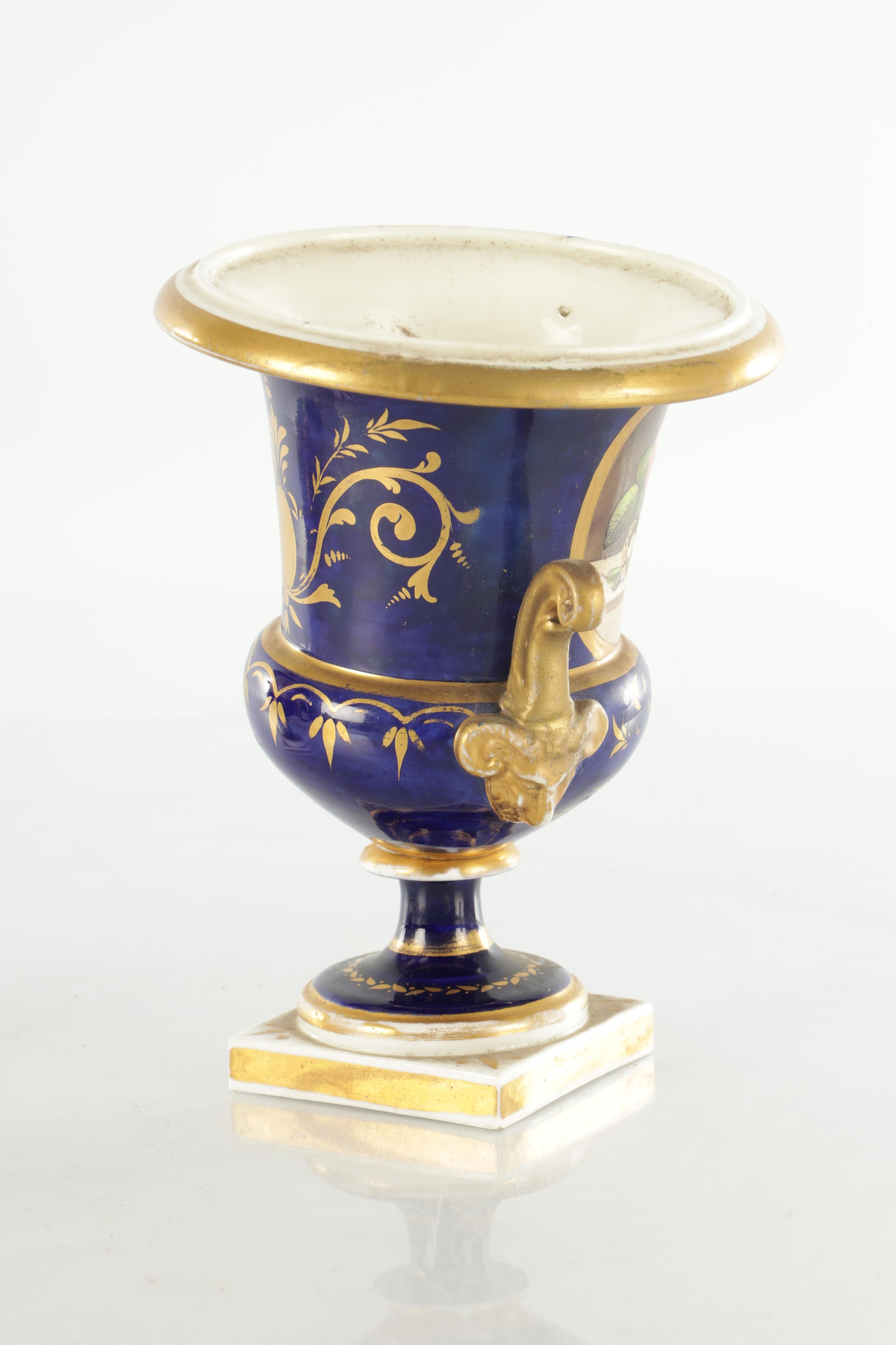 A PAIR OF 19TH CENTURY DERBY URN SHAPED VASES on royal blue ground with gilt highlights and painted flowers (17cm high )