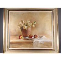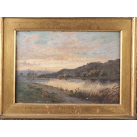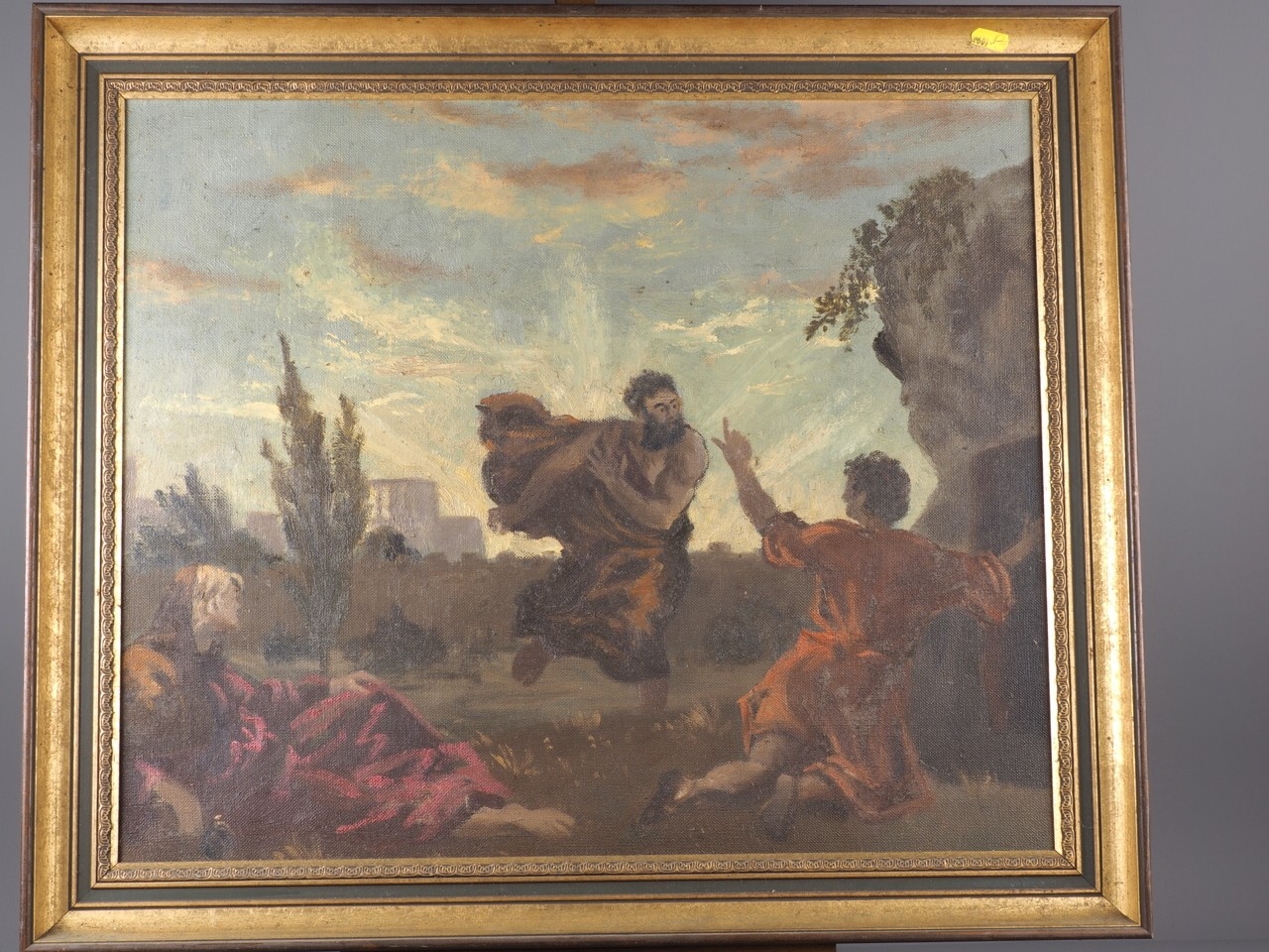 A contemporary oil on canvas depicting a classical scene, 19” x 23”, in gilt frame