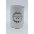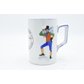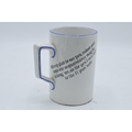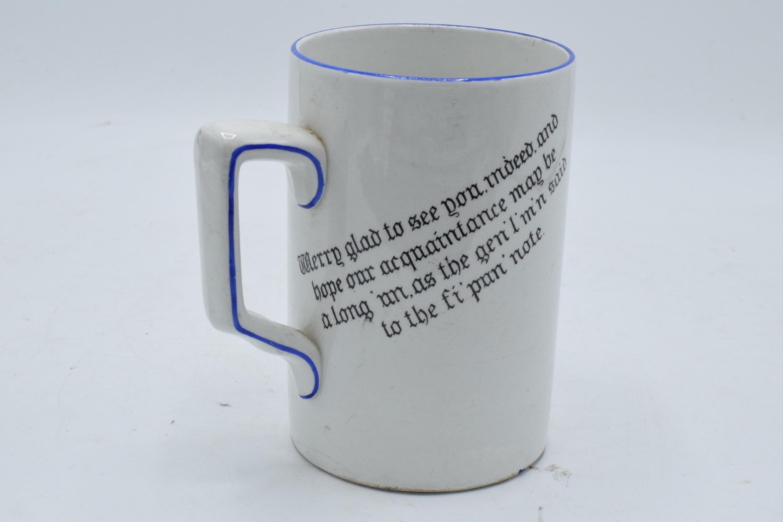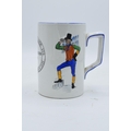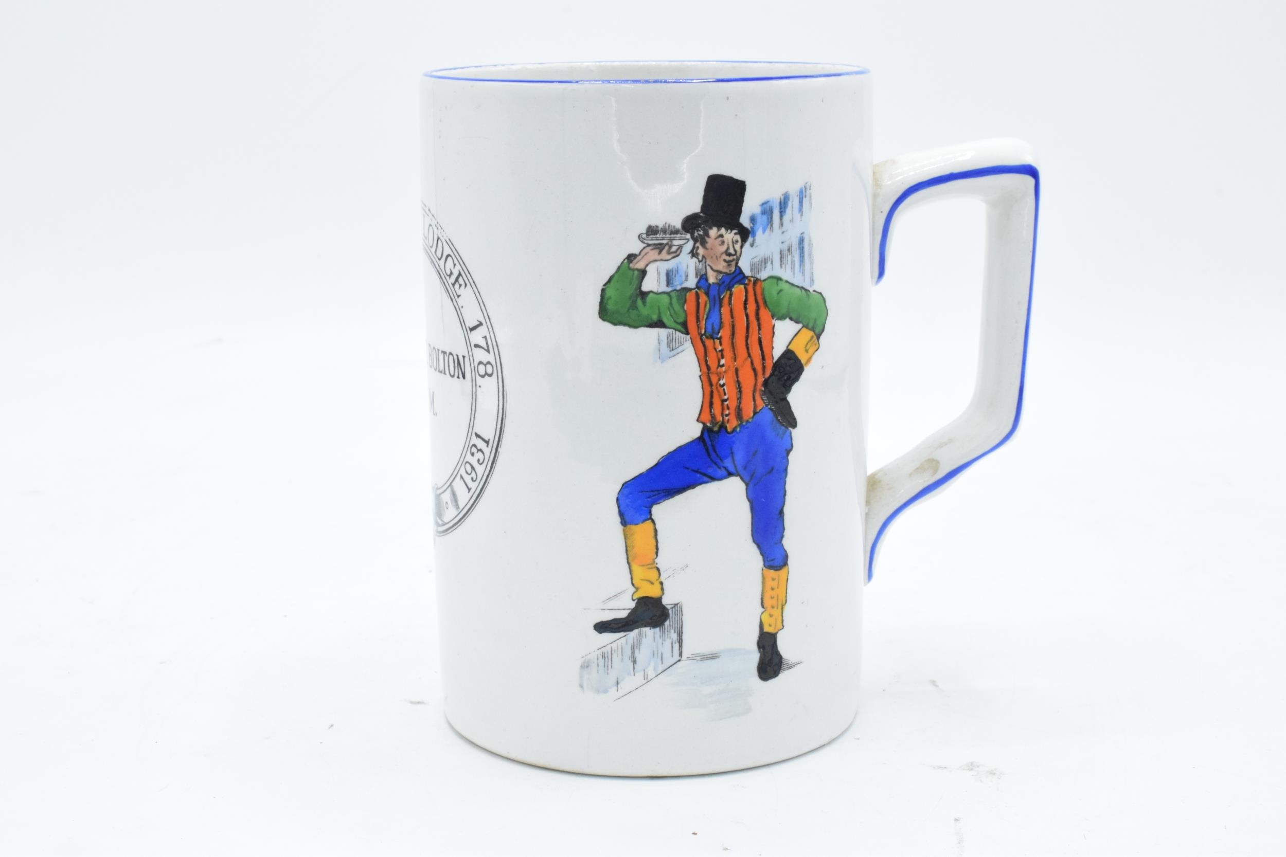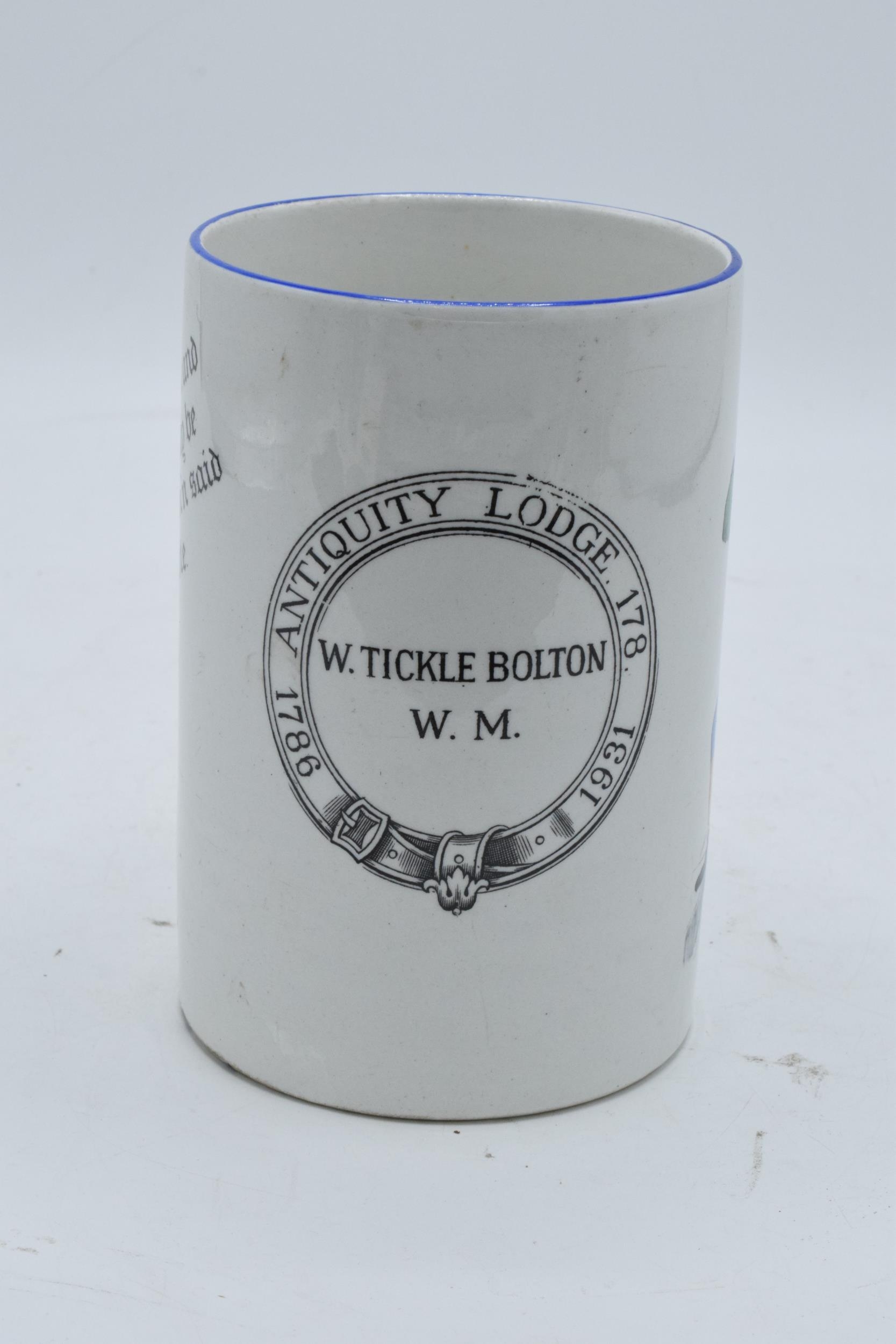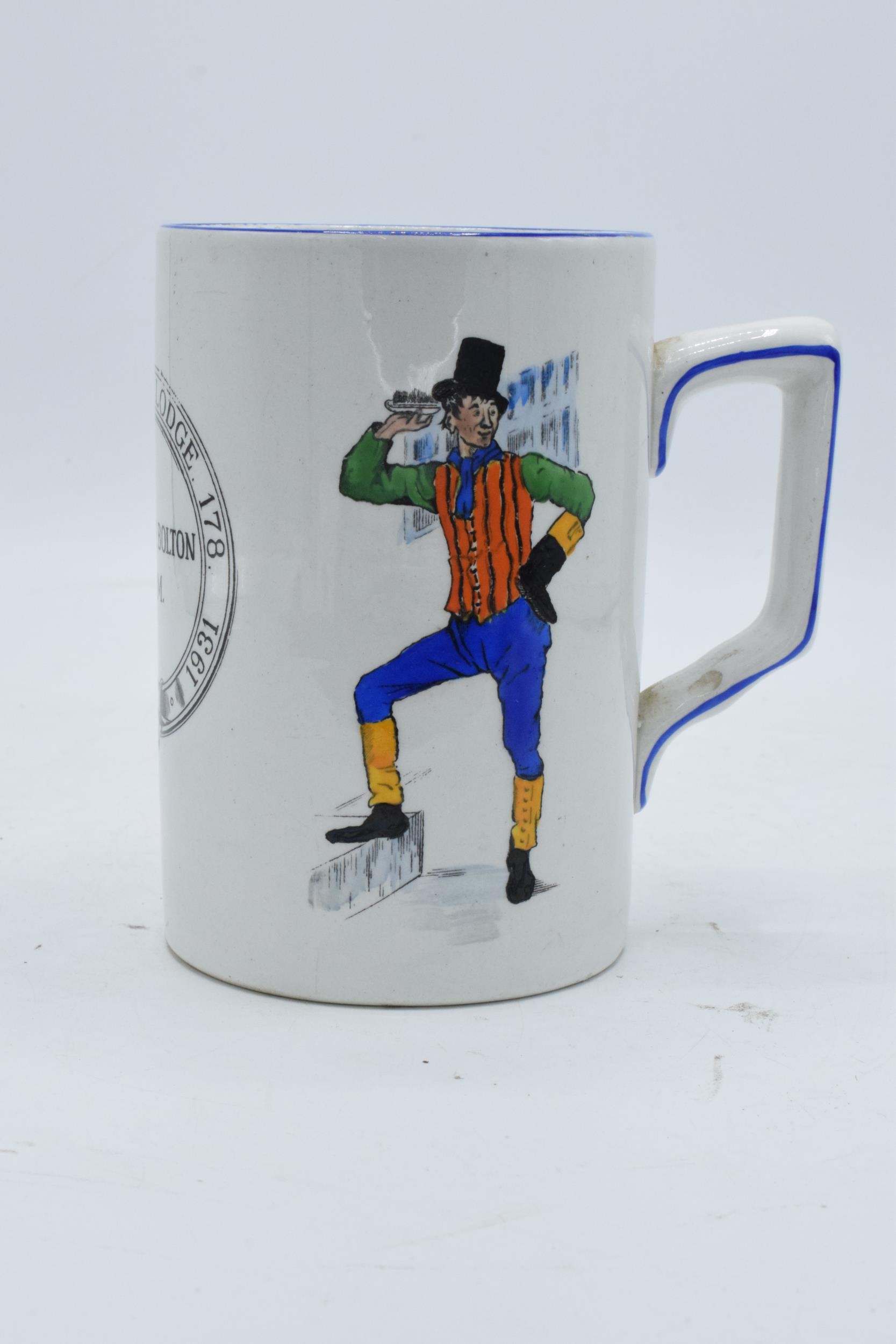 A Green and Co pottery mug decorated with a spritely character '1786 Antiquity Lodge 178 1931 W. Tickle Bolton W.M' and a verse to rear 'Merry glad to see you indeed, and hope our acquaintance may be along'un as the gen'l'm'n said to the fi'pan note'. In good condition with no obvious damage or restoration. 13cm tall.