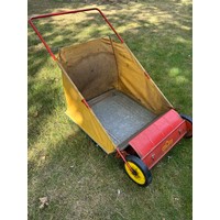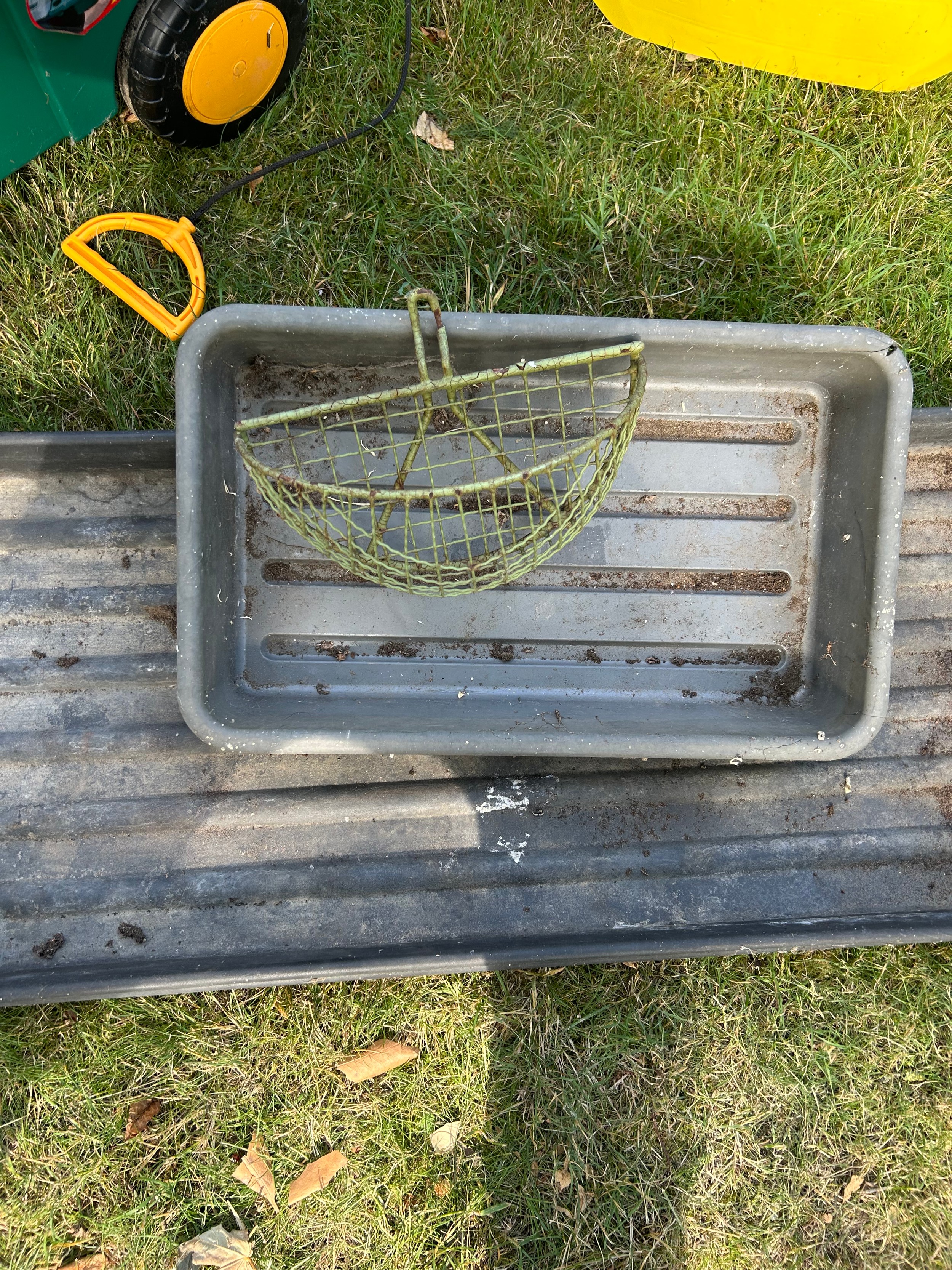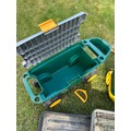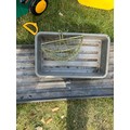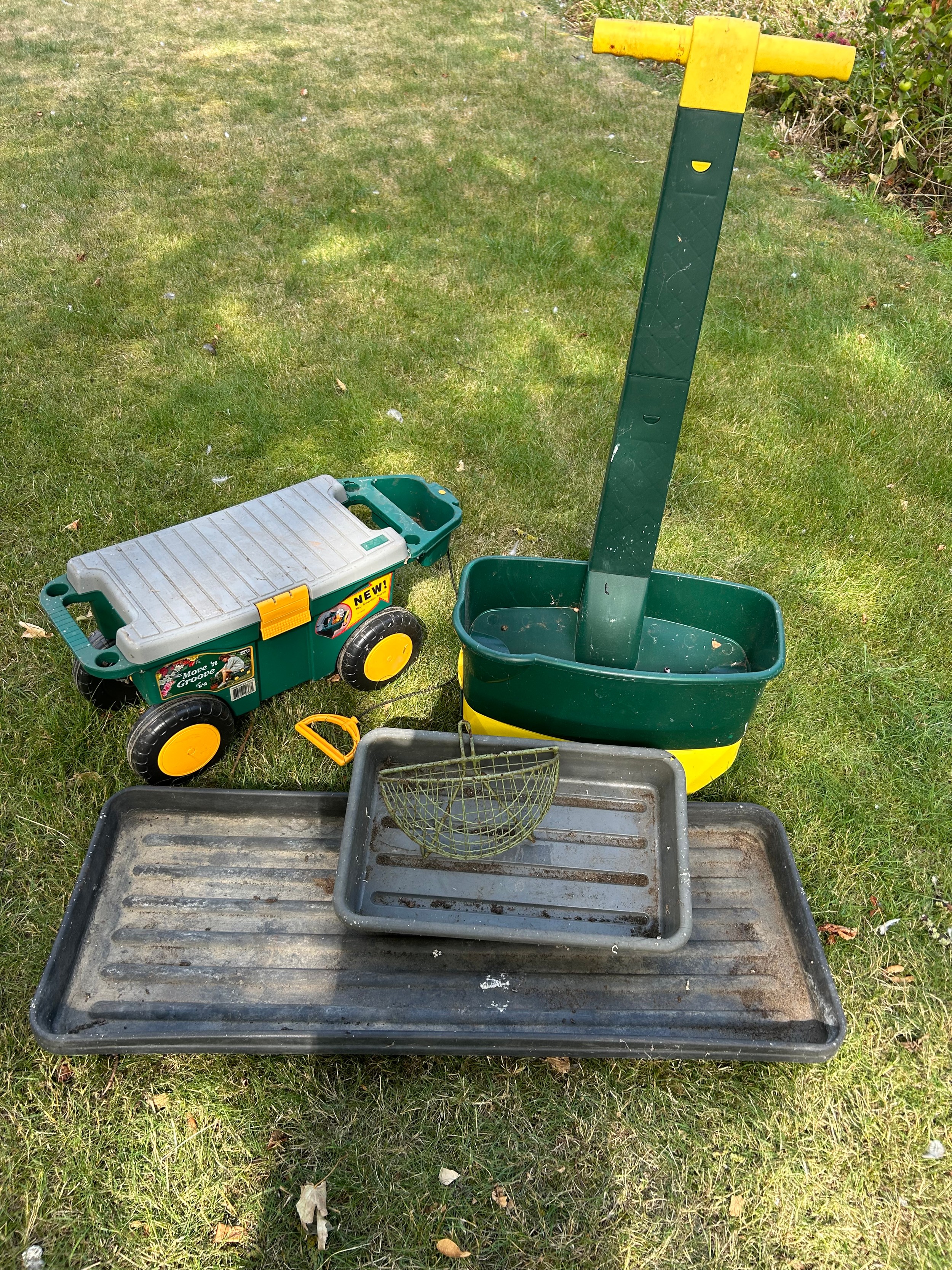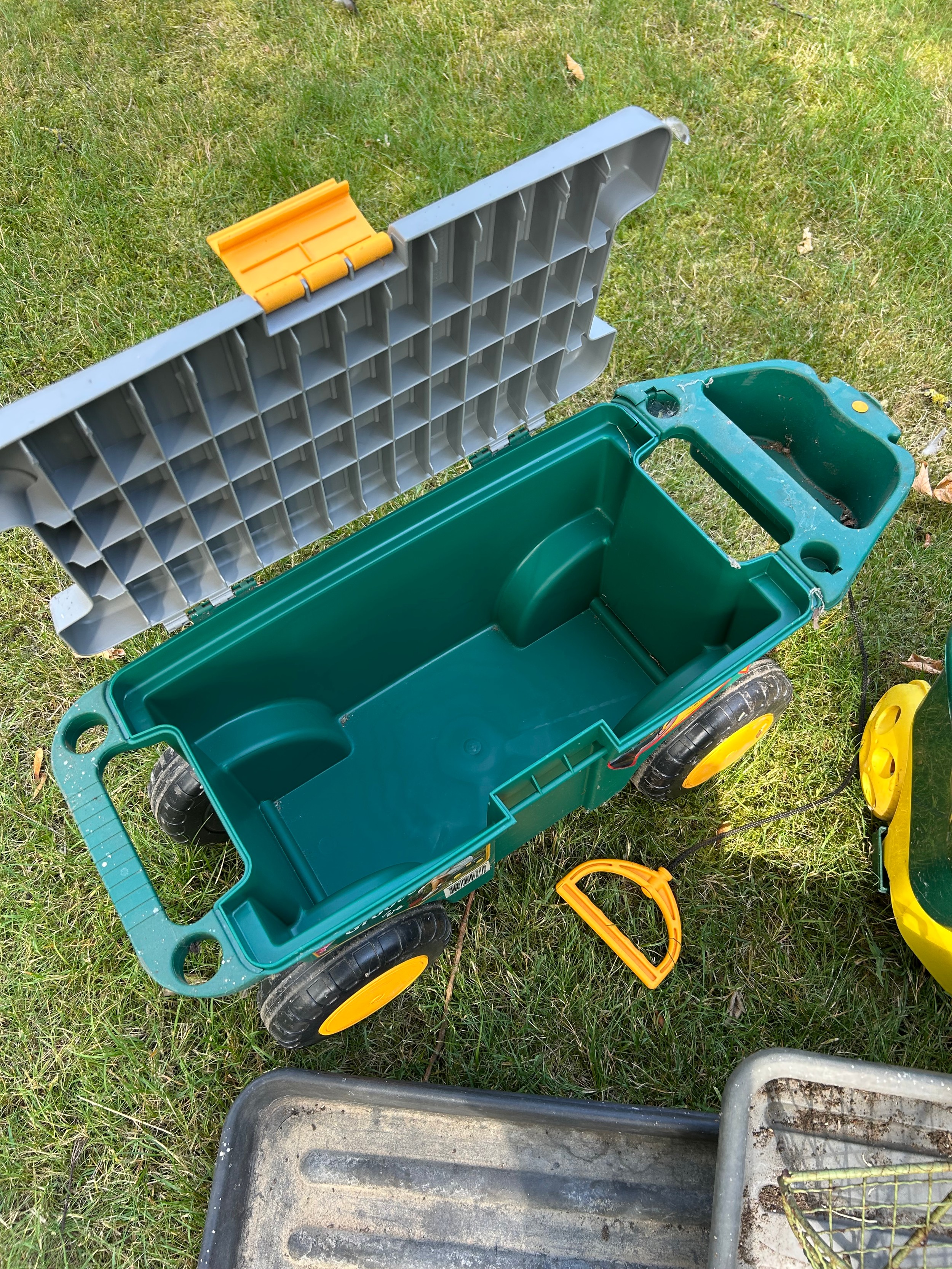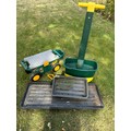 ‘Move n Groove’ garden tool box trolley seat, a lawn seed / fertiliser spreader by evergreen, plastic trays for greenhouse and a wire wall pocket