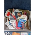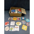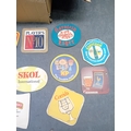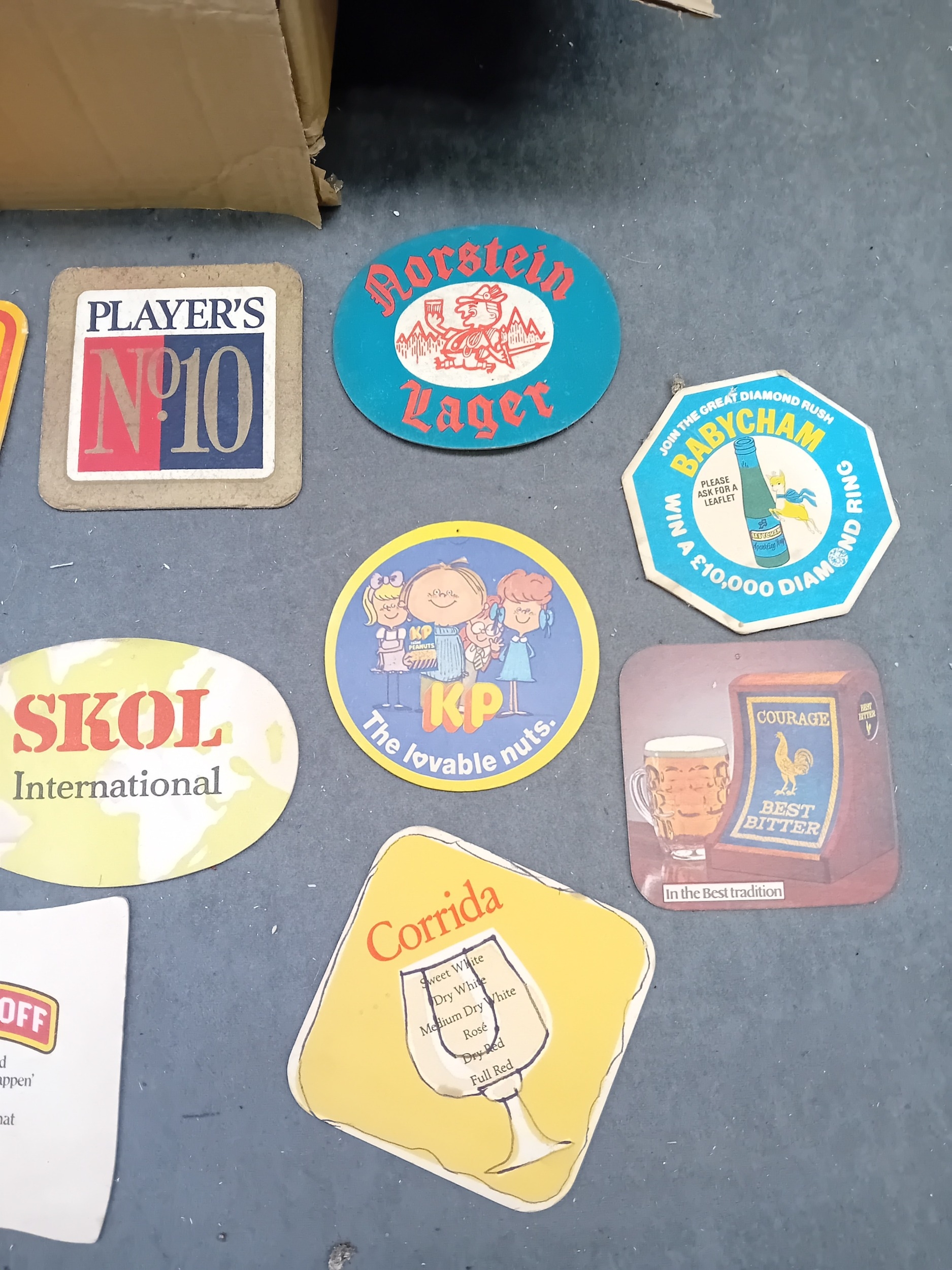 A collection of vintage paperboard beverage coasters or beer mats, dating from the mid-to-late 20th century. The collection comprises approximately two dozen coasters displayed on a surface, with a larger quantity stored in an open corrugated cardboard box. These promotional items predominantly feature brands from breweries, distilleries, and snack companies. Visible markings include 'SKOL International, ' 'Smirnoff, ' 'PLAYER'S N°10,' 'Holsten Lager, ' 'Babycham, ' 'KP' (with 'The lovable nuts.'), 'Courage Best Bitter, ' 'Merrydown MEAD, ' 'Corrida' wines, and 'USDAW' (Shop, Distributive & Allied Workers). One coaster for 'Astra Bräu' bears the German text 'Trink Astra Bräu. Das Original. Das einzig Wahre. Seit 1787.' which translates to 'Drink Astra Beer. The Original. The one and only. Since 1787.'