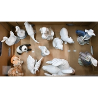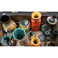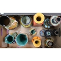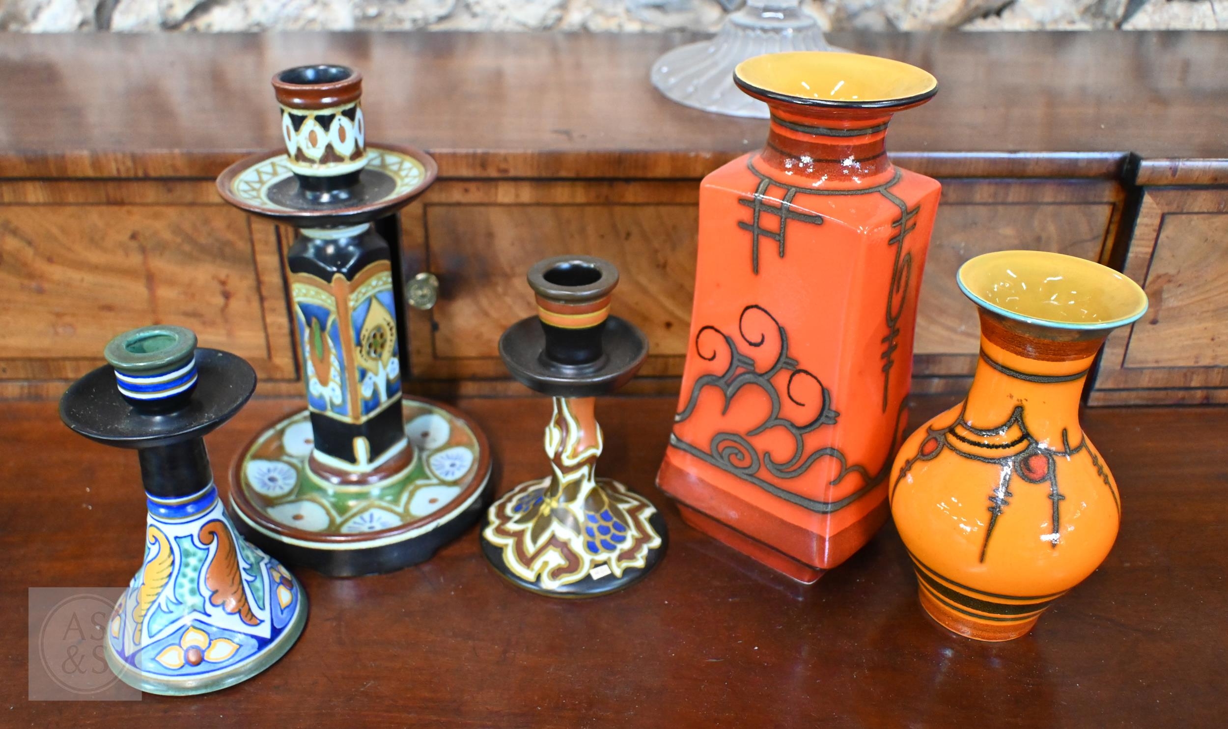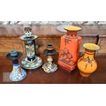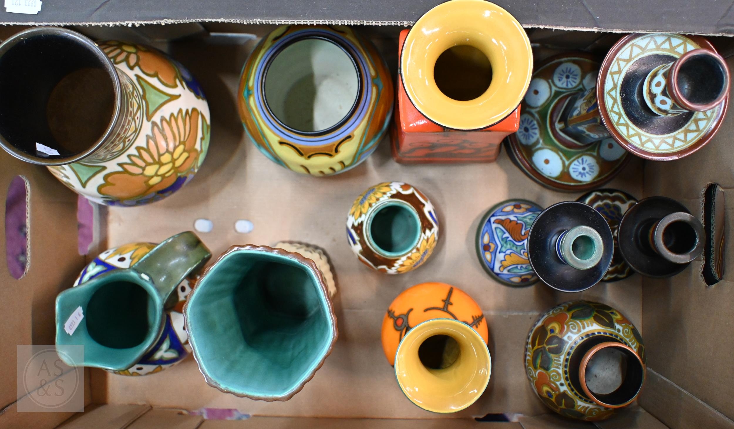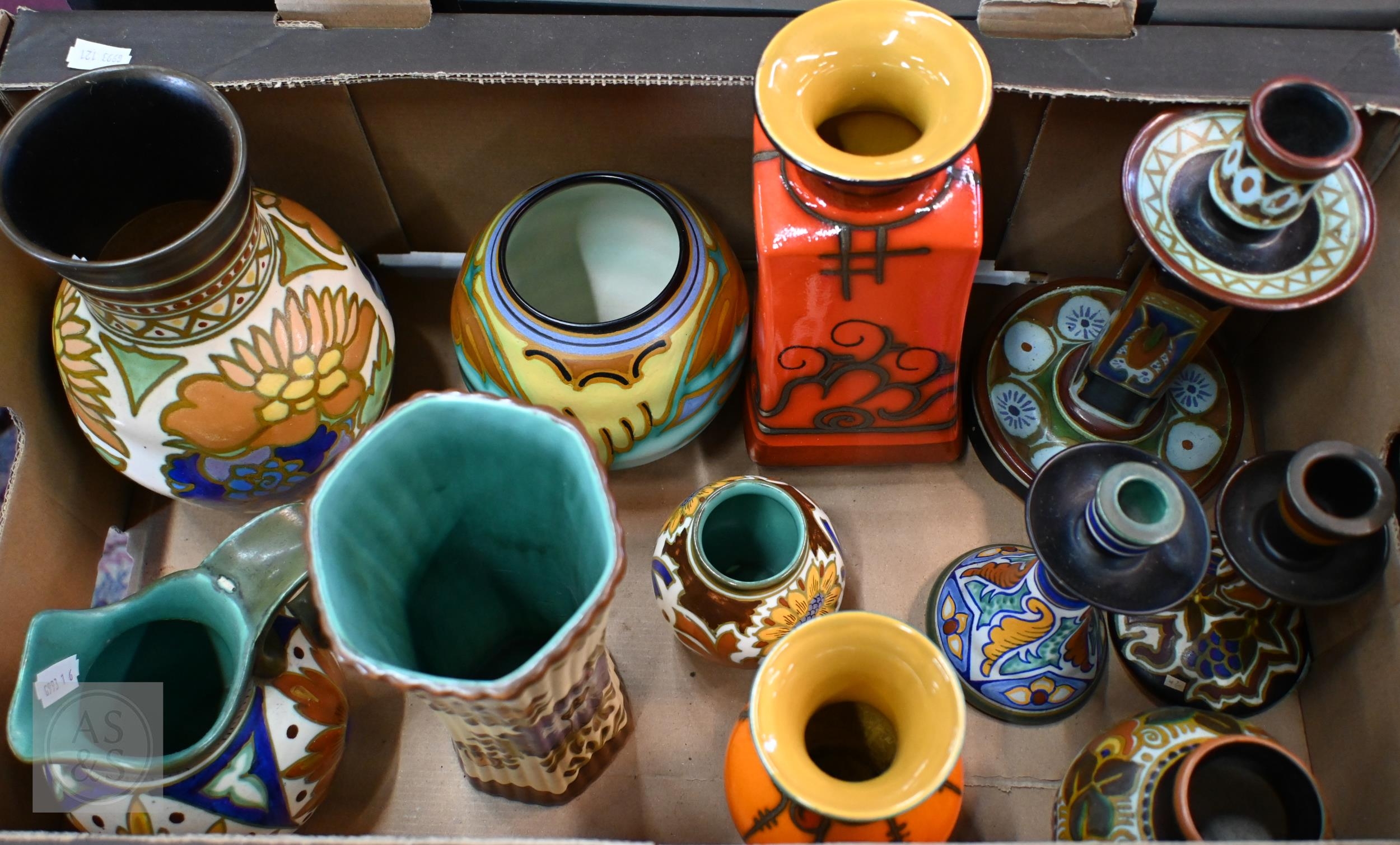 Three various Gouda pottery candlesticks, to/w seven vases and a jug (box)