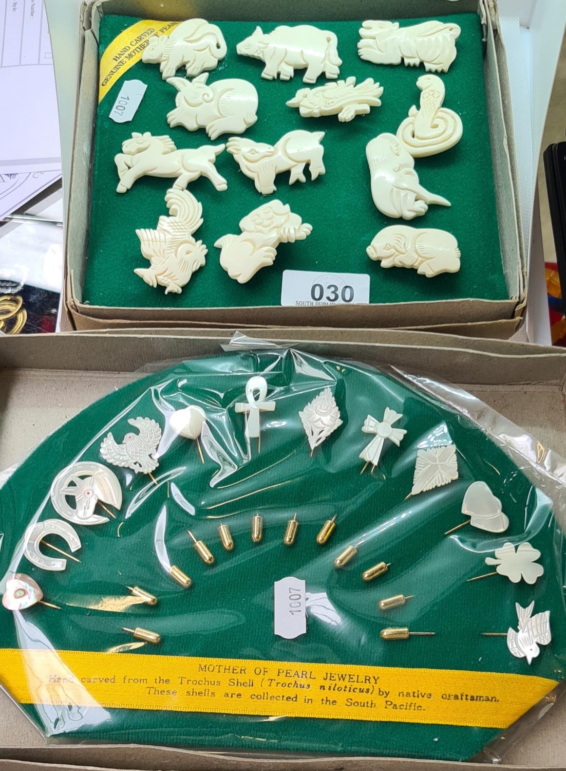 Two boxes of New old stock Broches inc Animals and mother of pearl examples hand carved from Trochus Shell by native craftmen in the South Pacific.