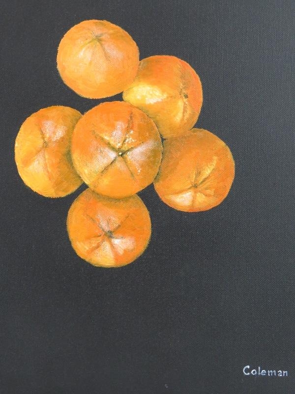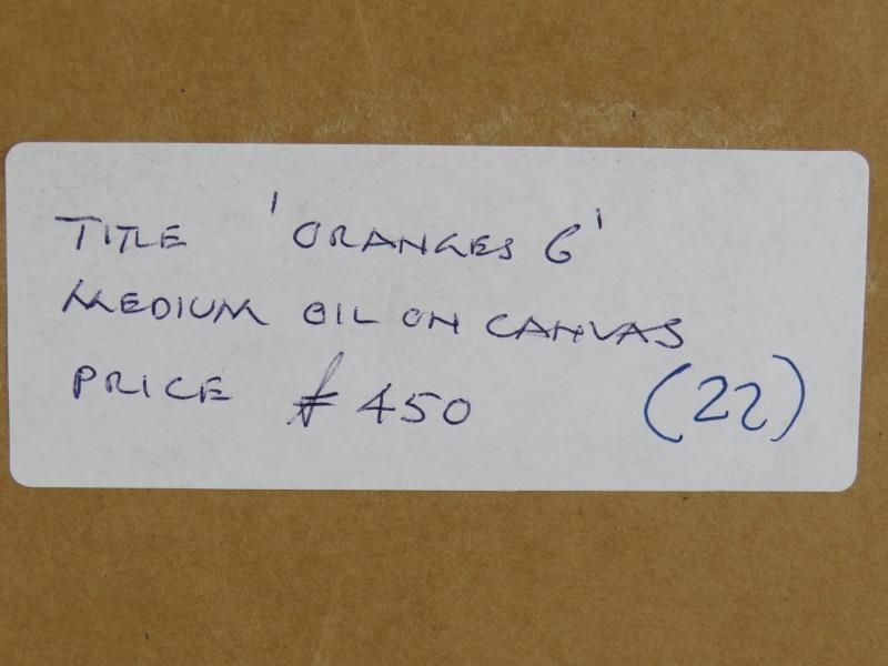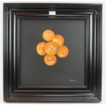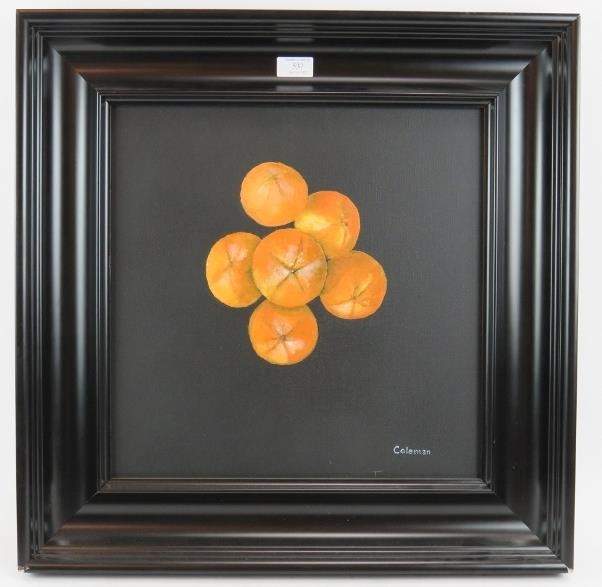 Rosie Coleman (Contemporary) - 'Oranges 6', oil on canvas, signed, handwritten label verso, 40cm x 40cm, framed.