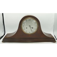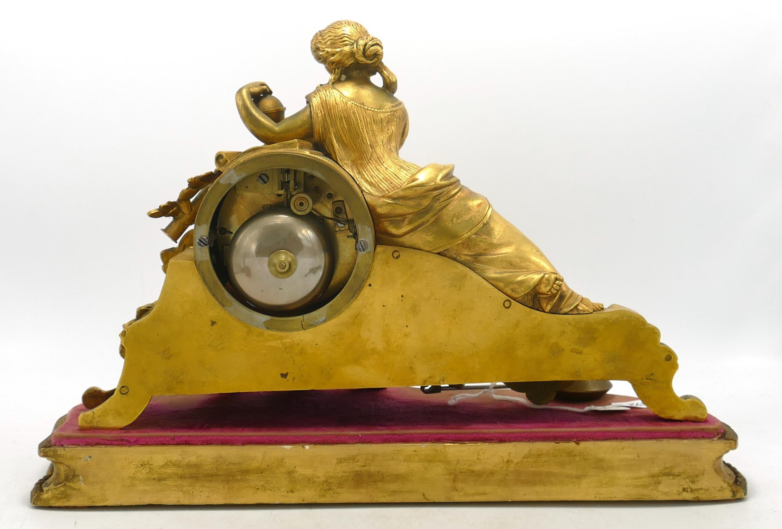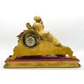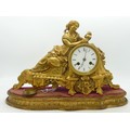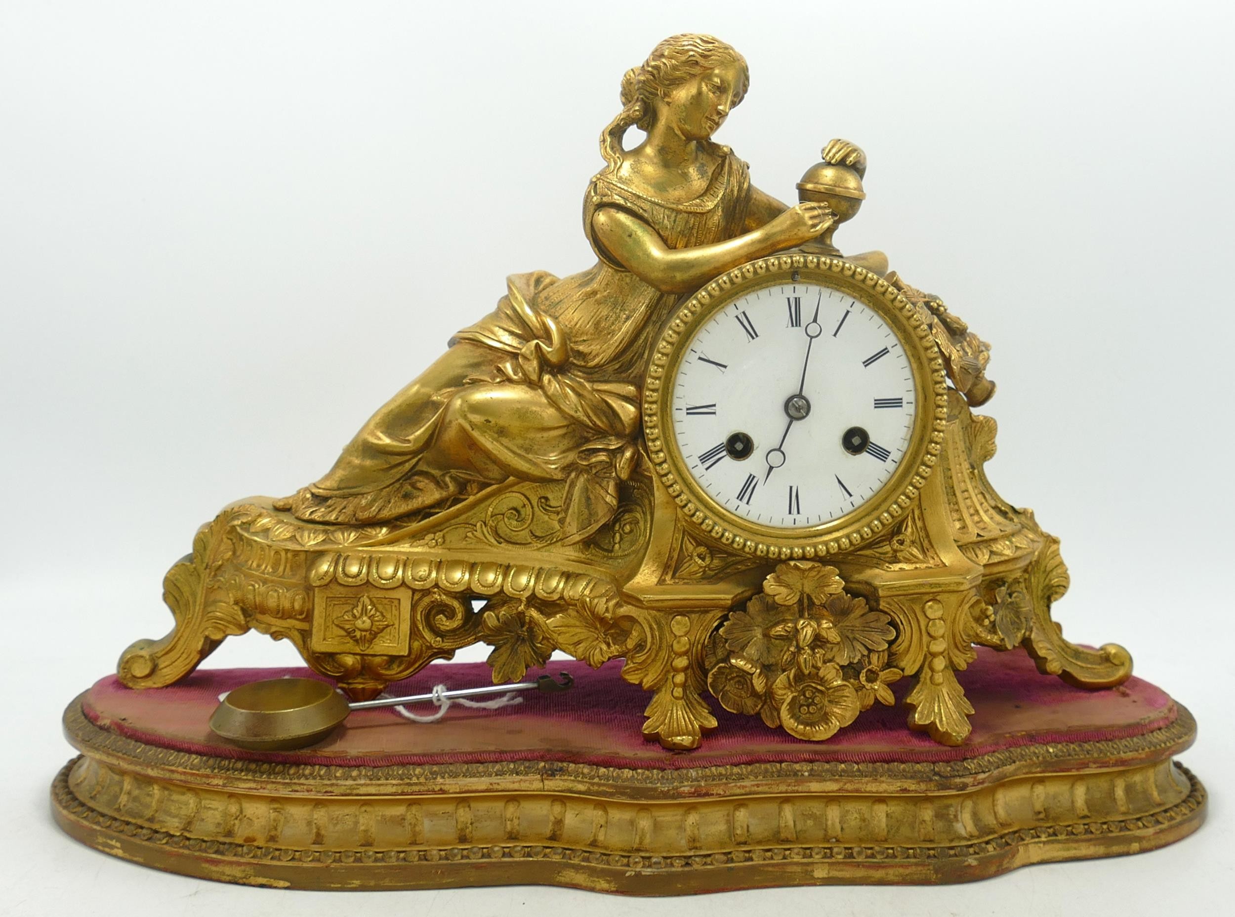 19th century French gilt metal mantle clock on plinth, missing glass & key, height 23cm.
