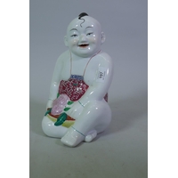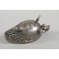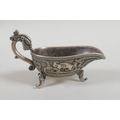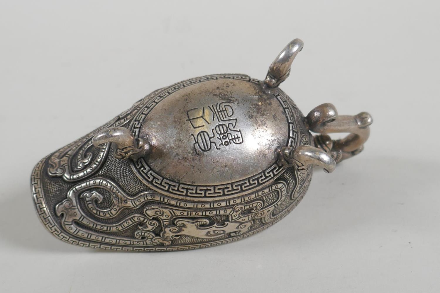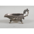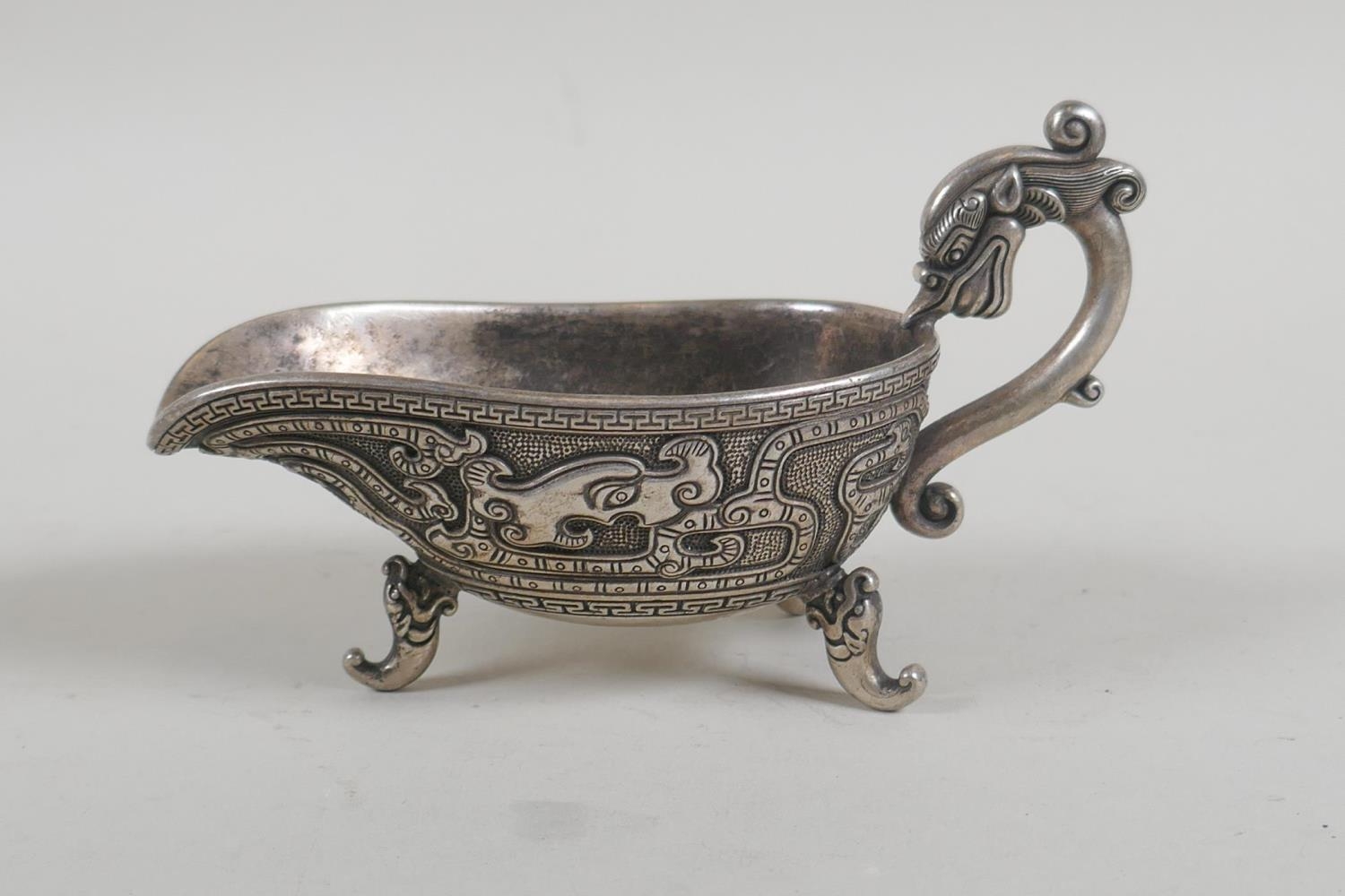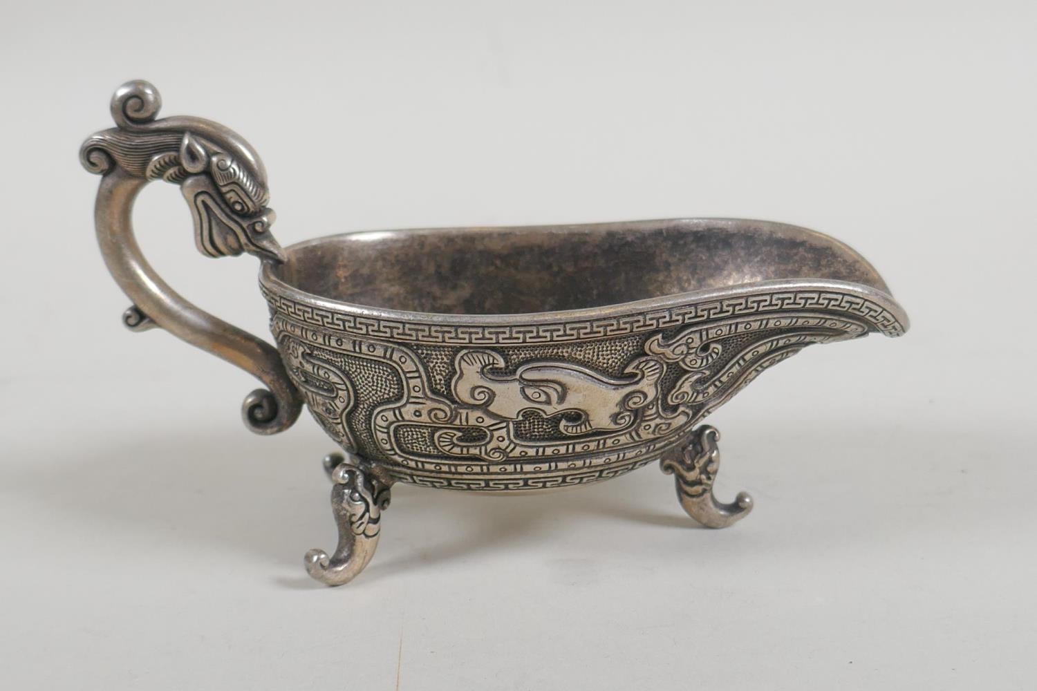 A Chinese white metal libation cup on tripod supports, seal mark to base, 13cm long