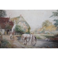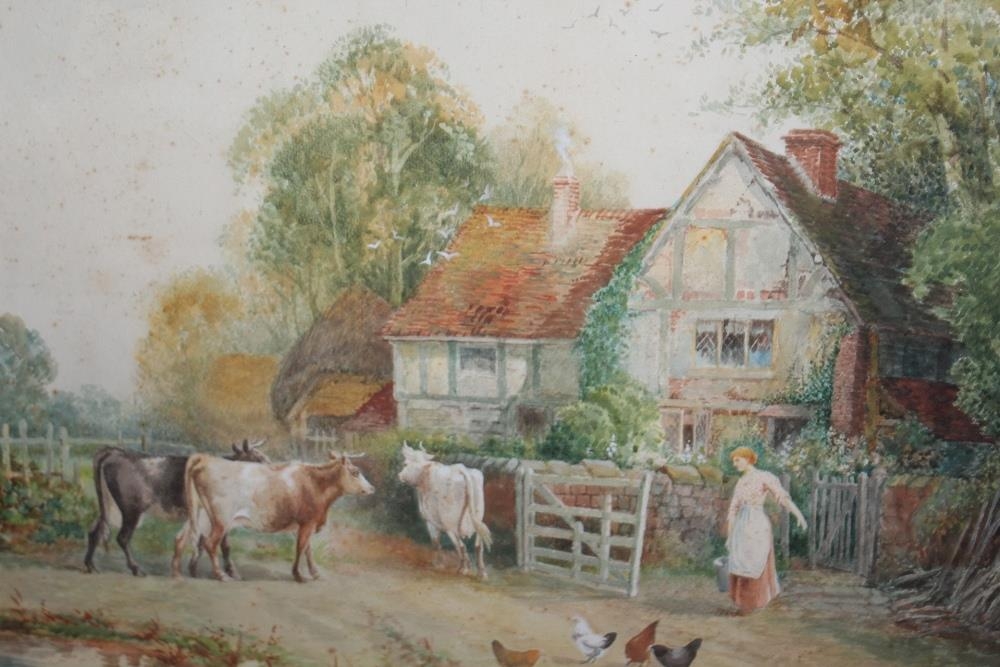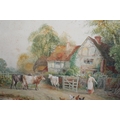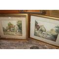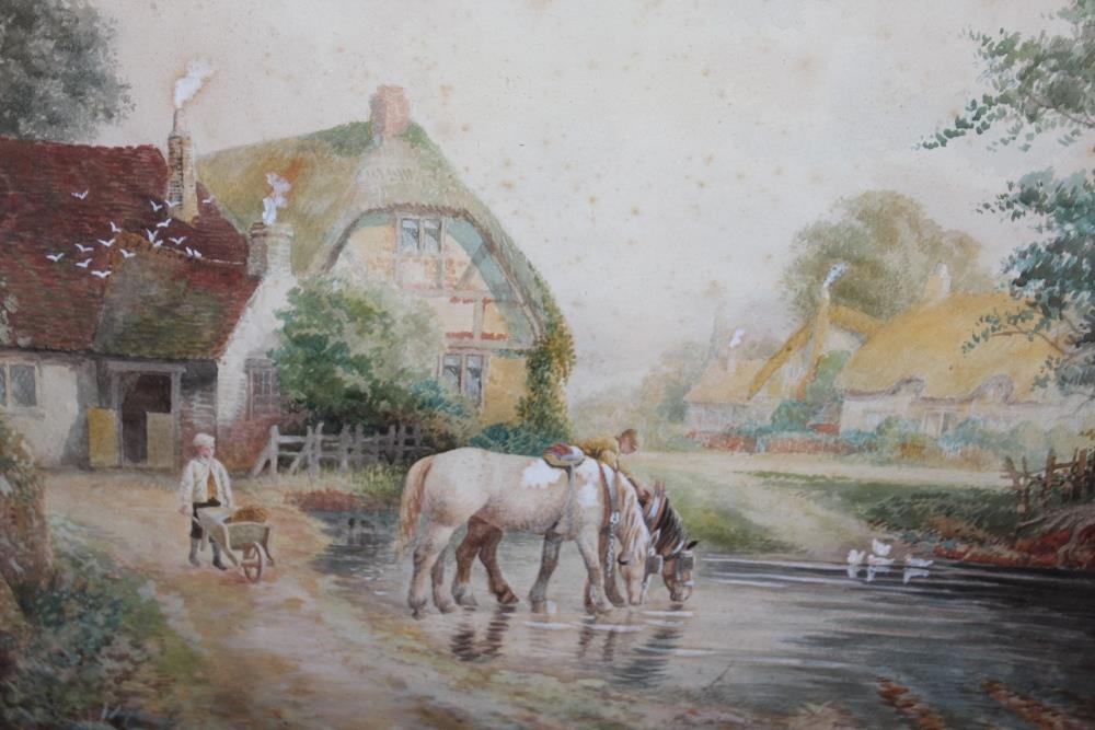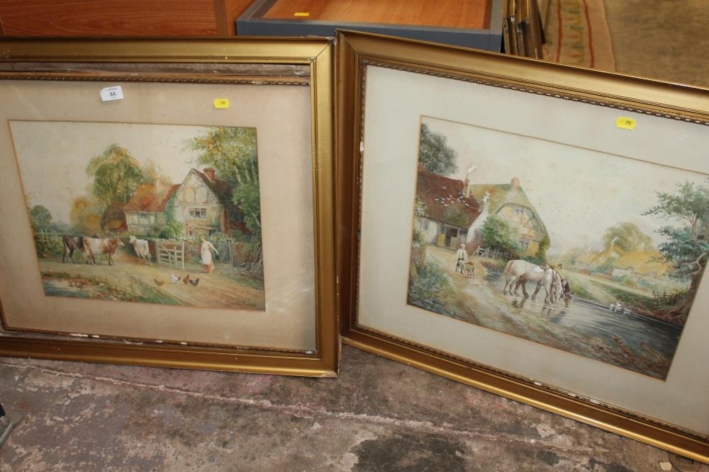 A PAIR OF GILT FRAMED AND GLAZED WATERCOLOURS OF COUNTRY SCENES WITH CATTLE AND HORSES SIGNED STANTON FORBES 35CM X 44CM - NOTE ONE LOOSE IN FRAME