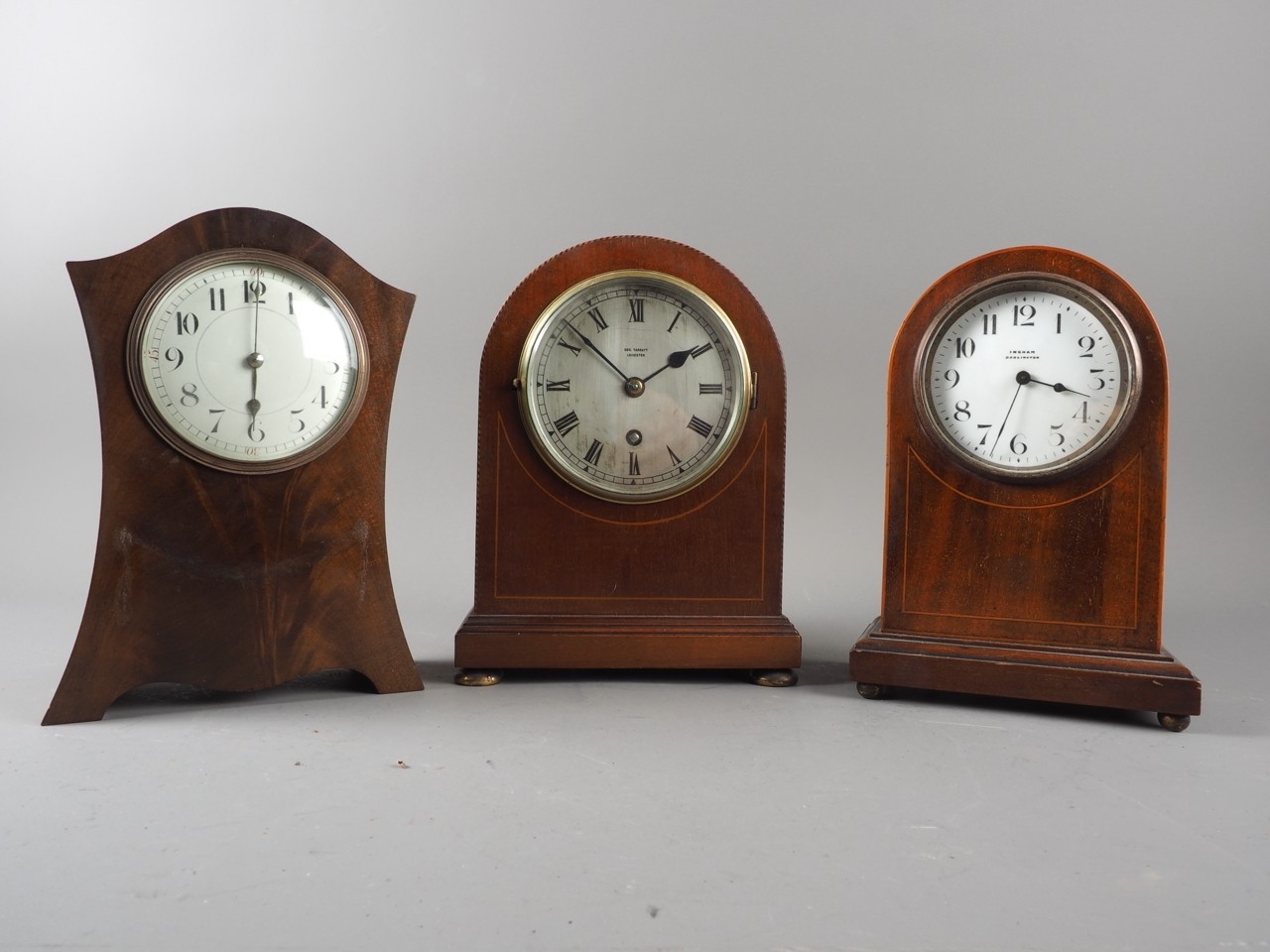 An Edwardian mahogany and inlaid dome topped mantel clock with silvered dial and Roman numerals, retailed by George Tarratt of Leicester, 8 3/4” high, and two other similar mantel clocks