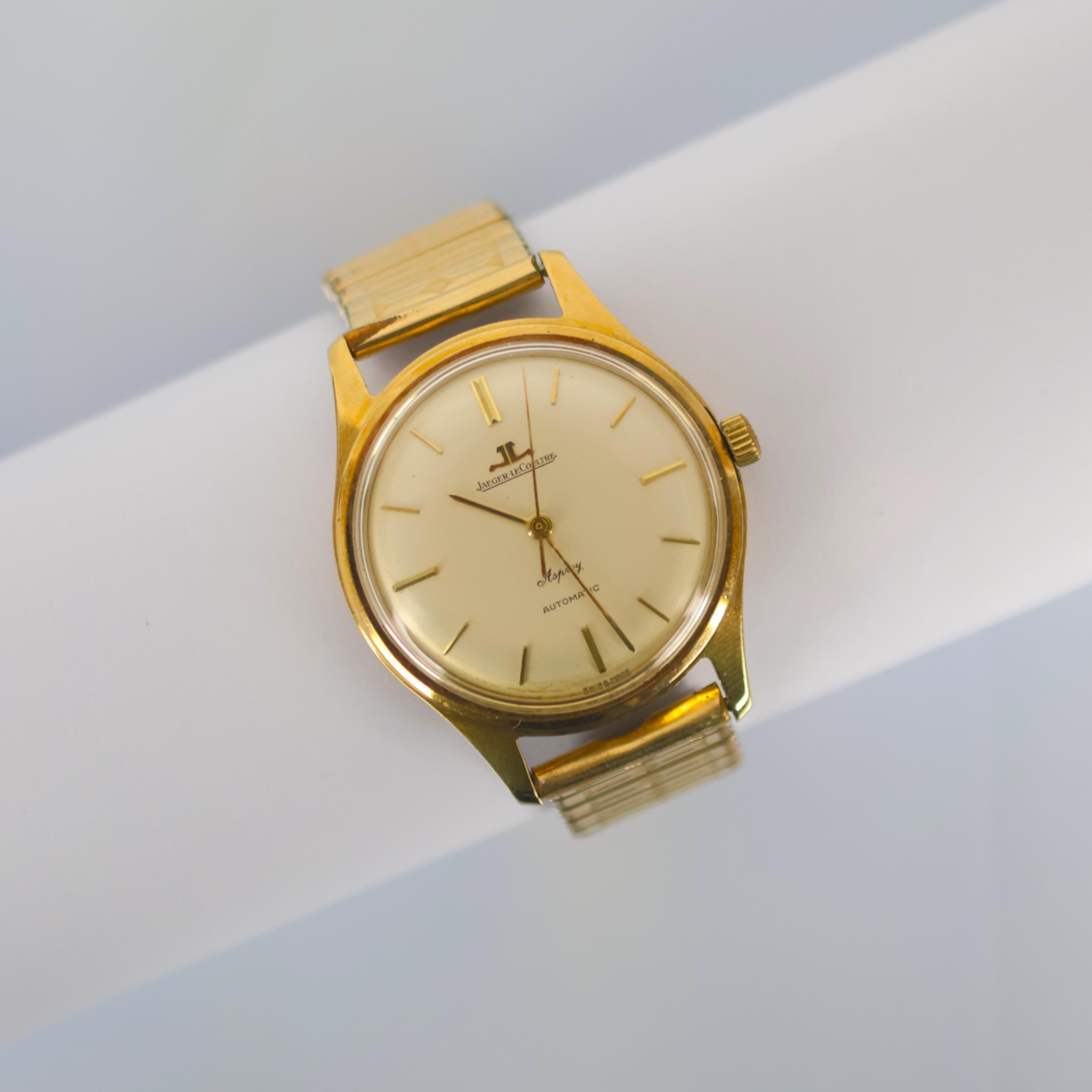 A late 20th century Jaeger Le Coultre 'Asprey' automatic wristwatch, the circular cream coloured dial with baton markers, set to 9ct gold case with presentation engraving to the reverse, 3.7cm wide (including associated crown) upon later expanding strap, gross weight 61gms (including movement and bracelet)