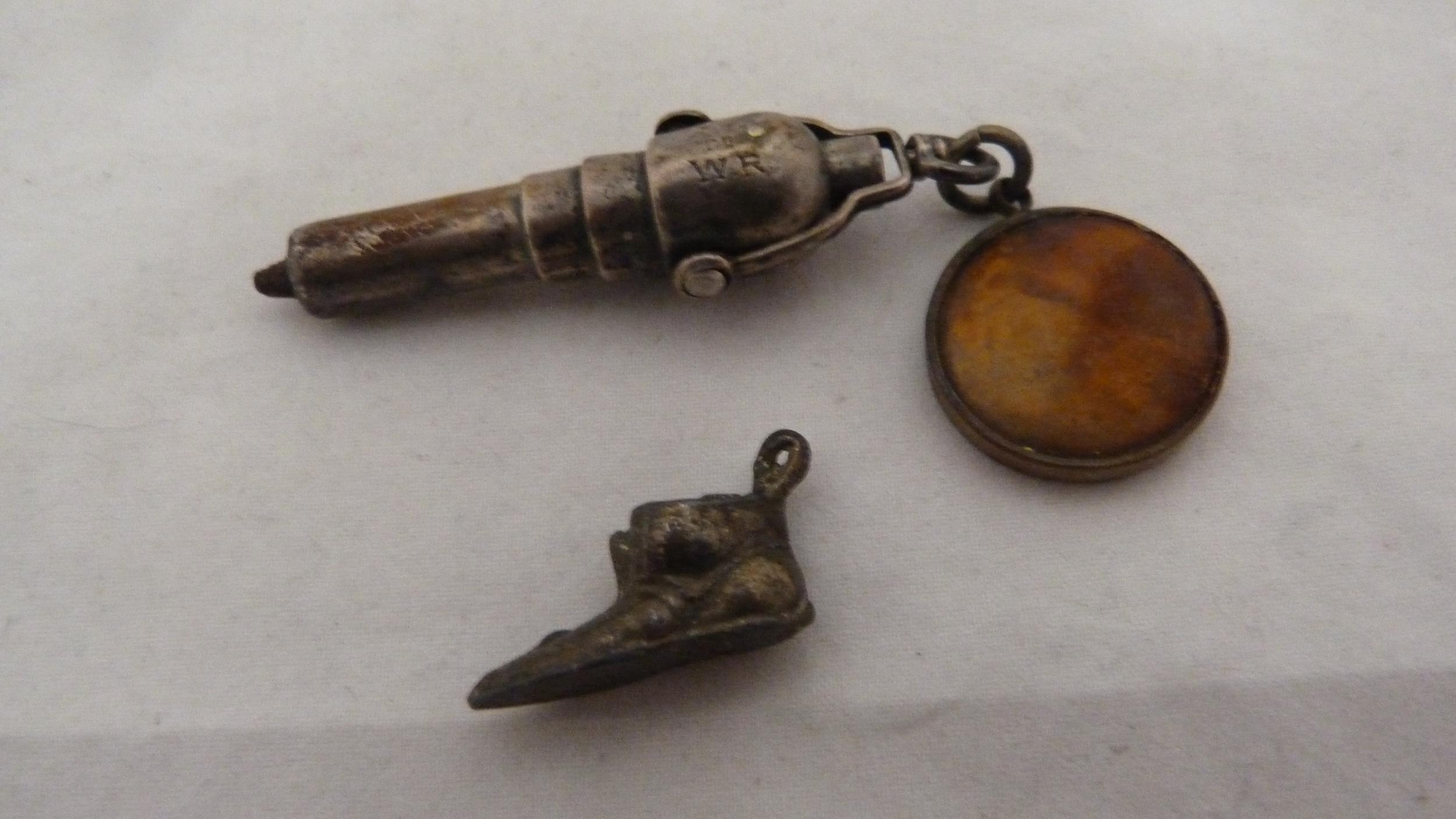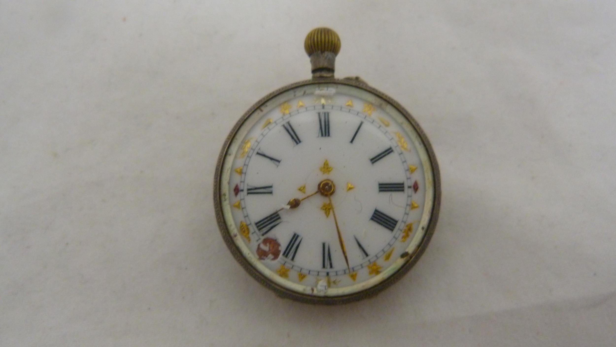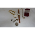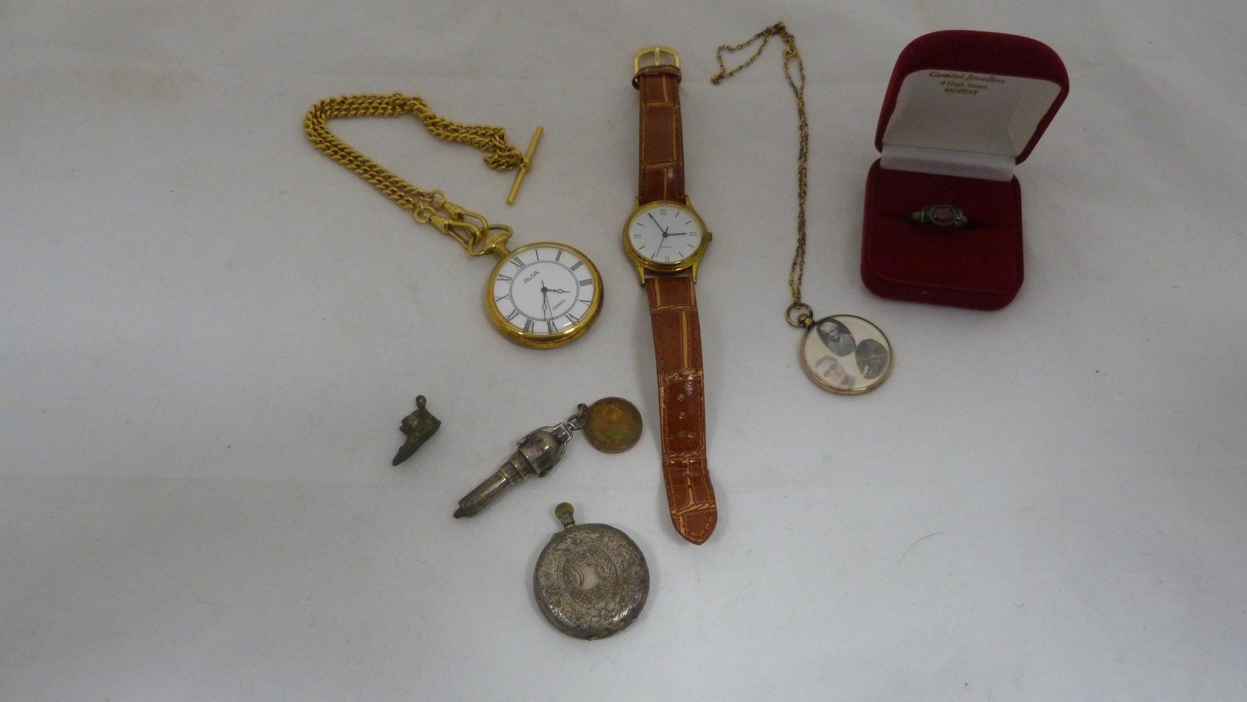 Victorian lady's silver-cased fob watch with enamel dial, 32g gross, rolled gold photo pendant on chain, fashion pocket watch on fashion watch guard, modern wristwatch, silver ring, charm and pendant.