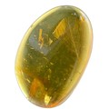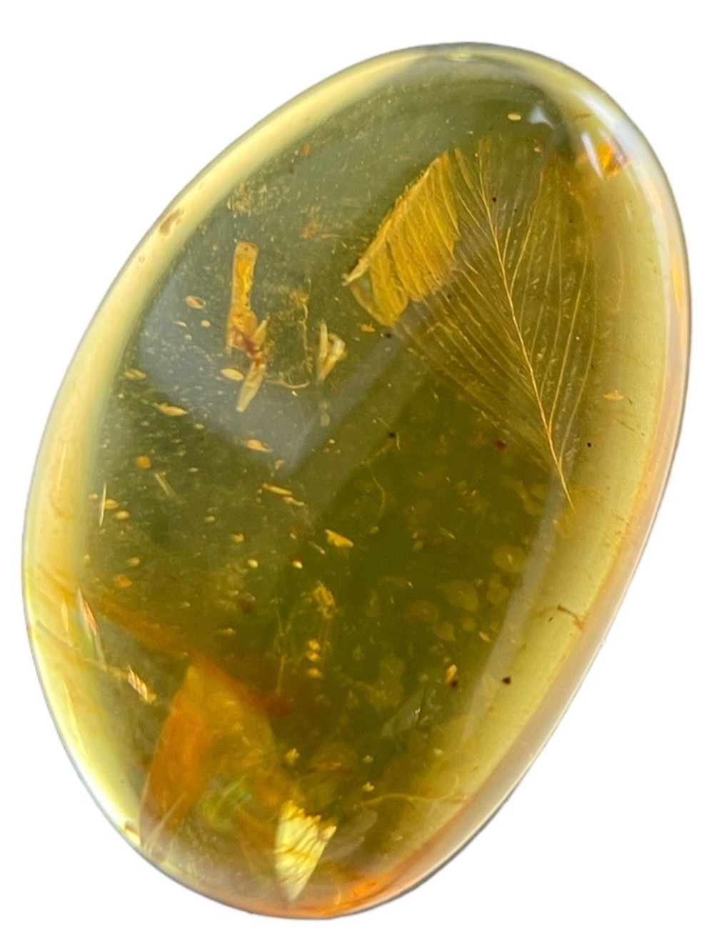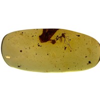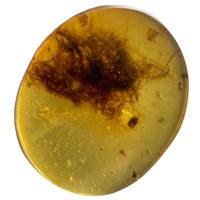 An extremely scarce complete feather in dinosaur-aged amber. Found in the Cretaceous deposits circa 99 million years old in the amber mines in Kachin, Myanmar.This was a time when feathered dinosaurs outnumbered avians. The specimen shows a very clear view of the feathers vanes.