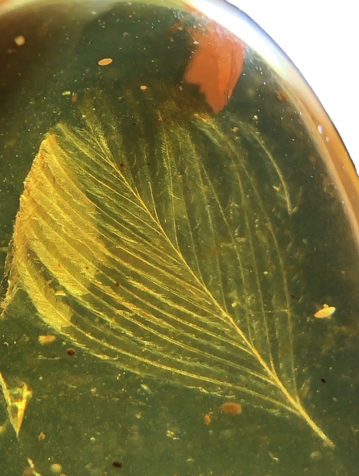 A VERY RARE DINOSAUR FEATHER FOSSIL IN BURMESE AMBER,