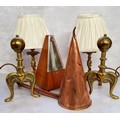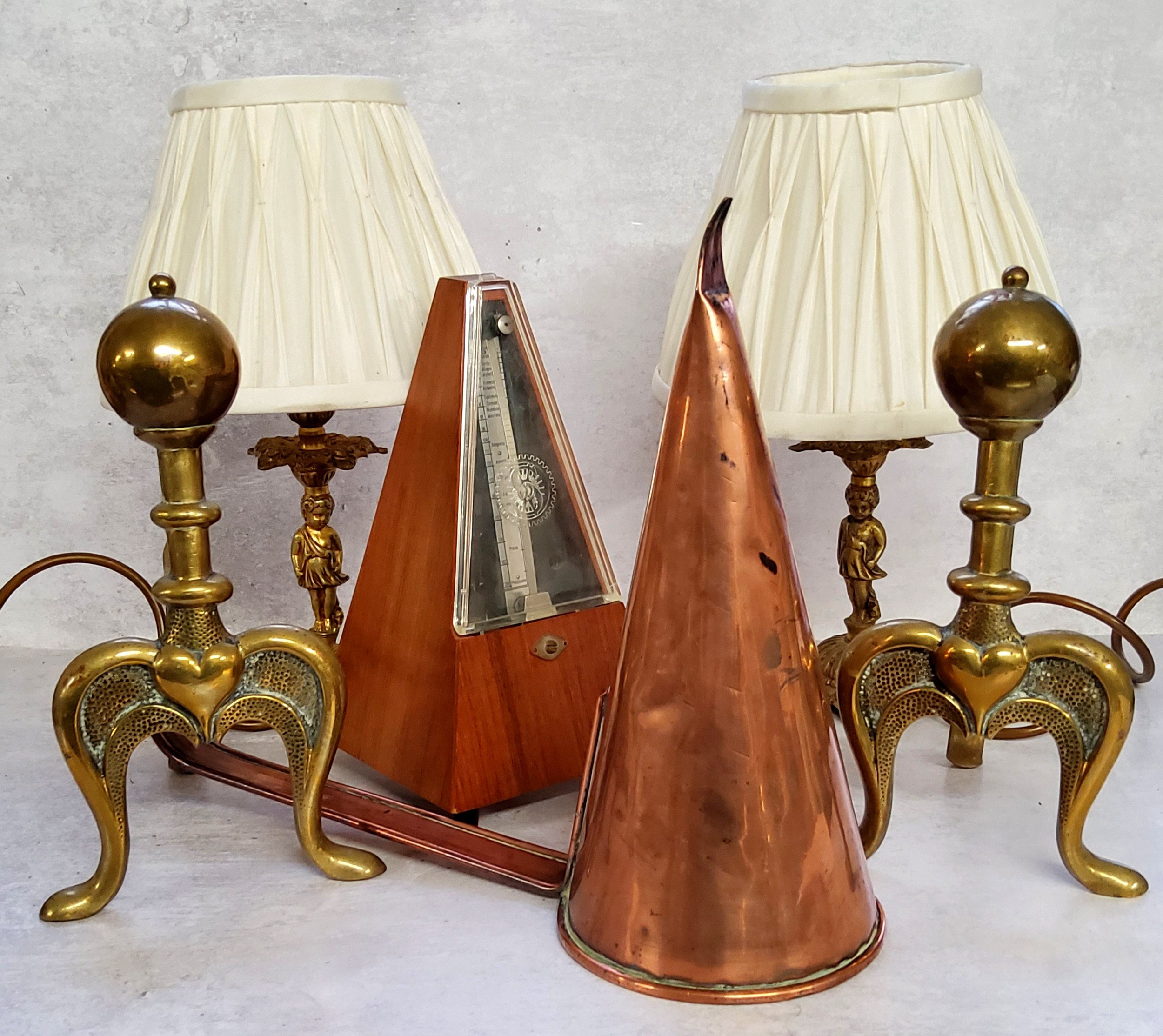 Boxes & Objects - a pair of Arts & Crafts fire dogs; conical grain measure; a pair of gilt metal table lamps of putti; a German Democratic Republic metronome (6)