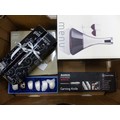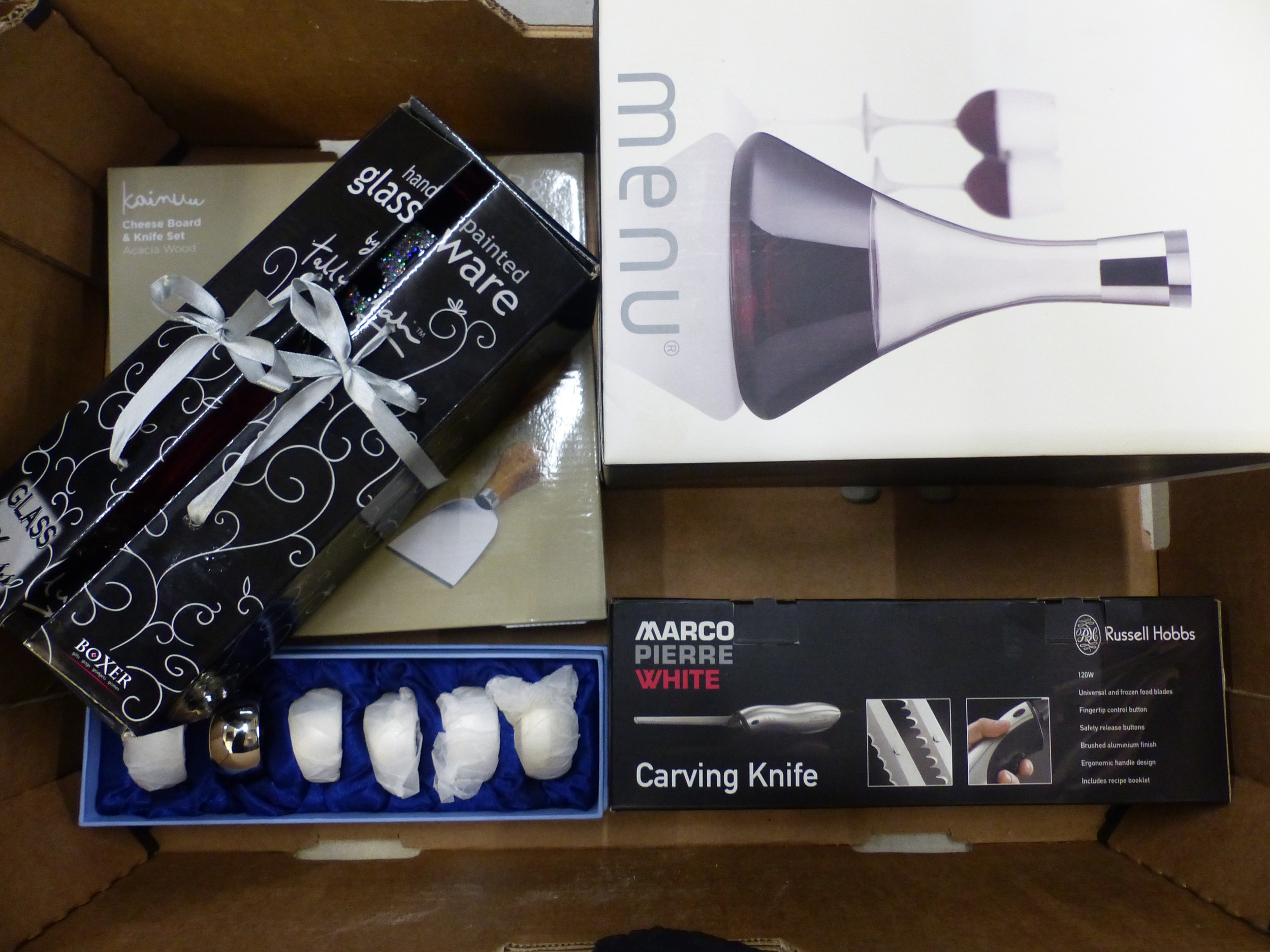 A collection of boxed items: silver-plated napkin ring set, wine decanter, cheese board set, hand-painted wine glass and a Marco Pierre White electric carving knife (1 tray).
