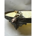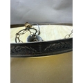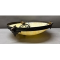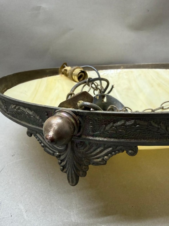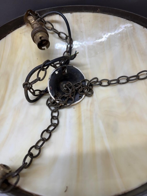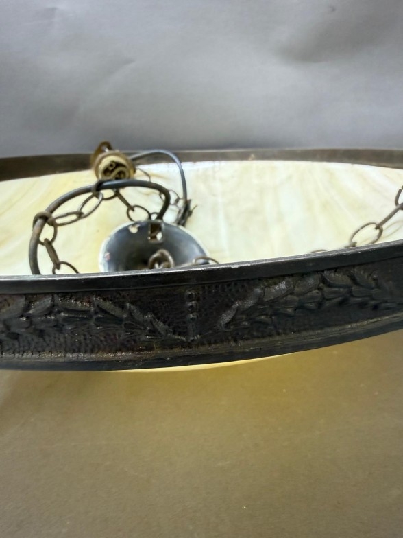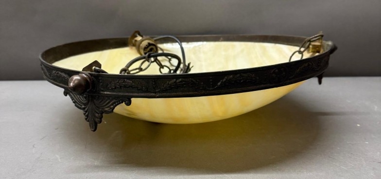 An Art Deco-style brass ceiling light with an alabaster glass bowl