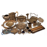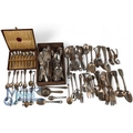 Collection of Silverplated Cutlery, a good selection of period cutlery - spoons, forks, tea strainer and teaspoons, mustard spoons, enamelled HMS Furious teaspoon, etc (box of)