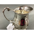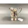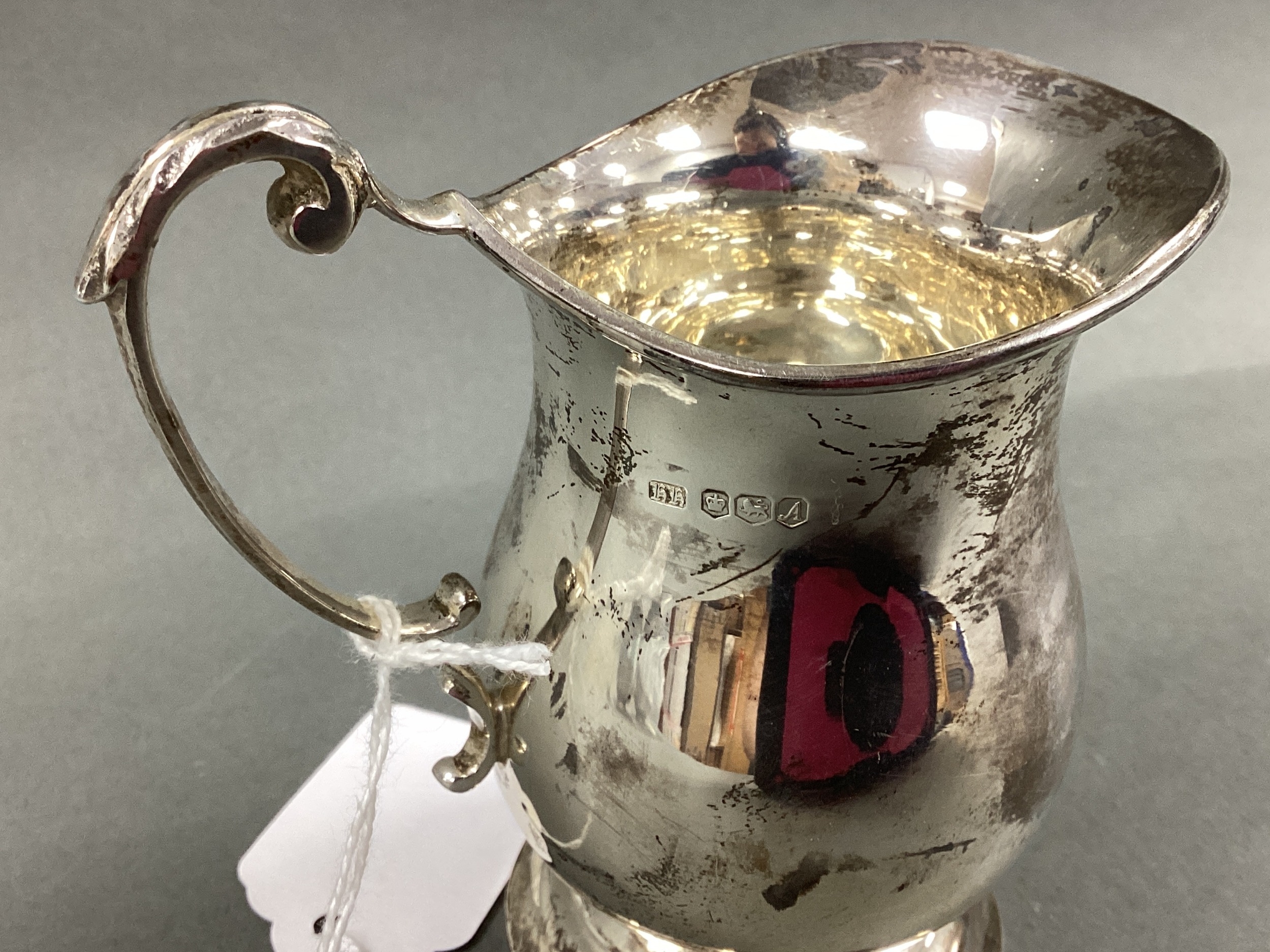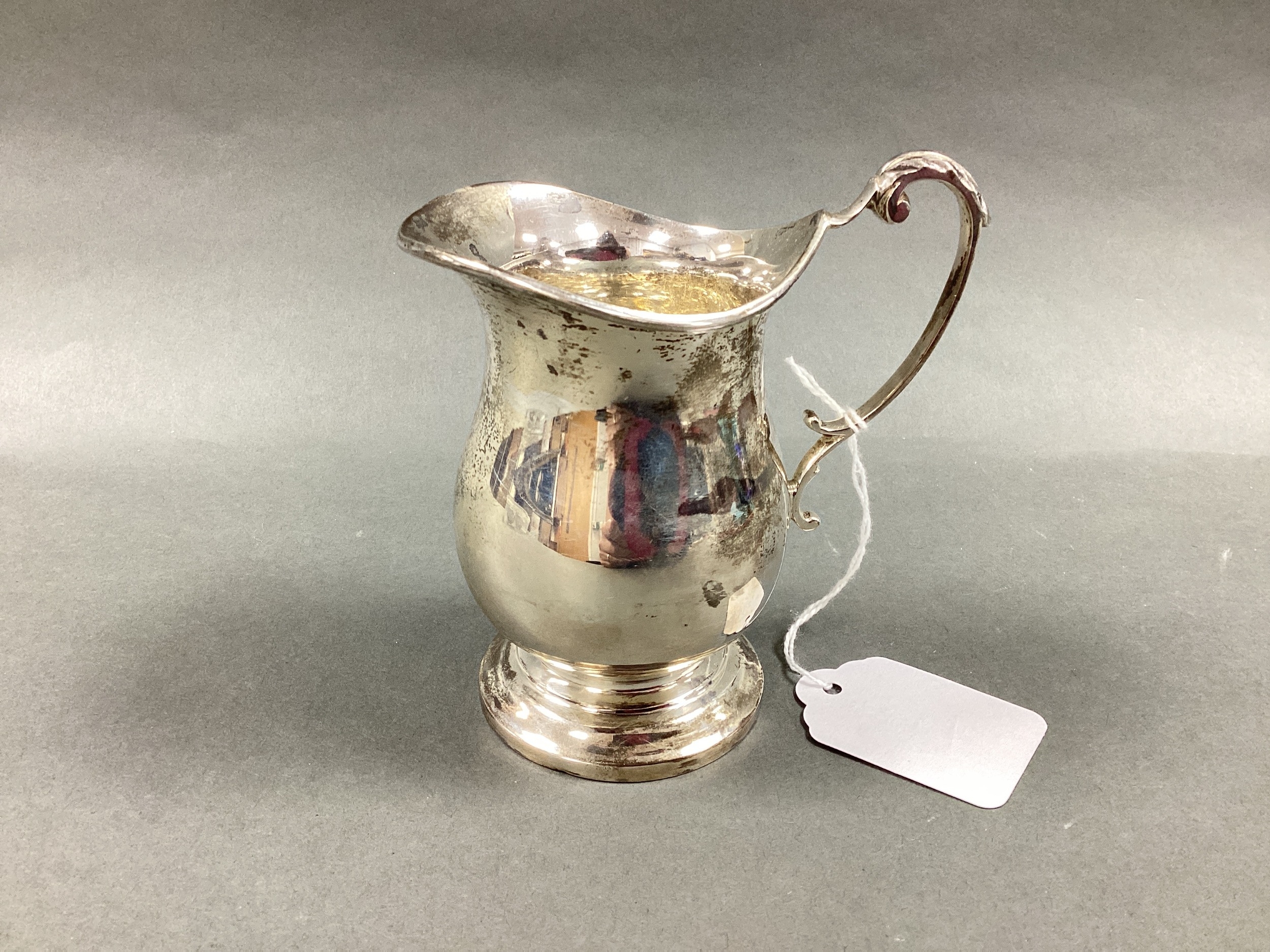 A Hallmarked Silver Jug, HH, Sheffield 1968, of plain baluster form with leaf capped scroll handle.