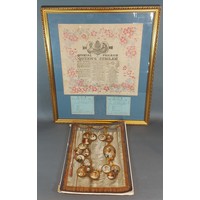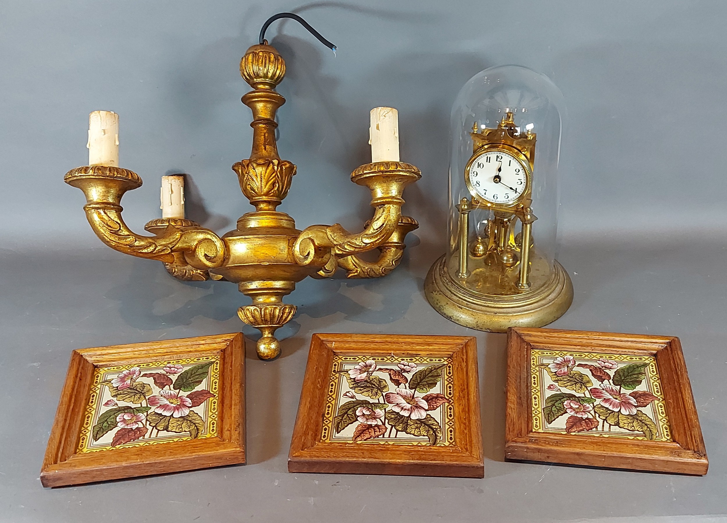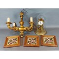 A set of three 19th Century framed tiles together with a gilded four branch electrolier and an Anniversary clock