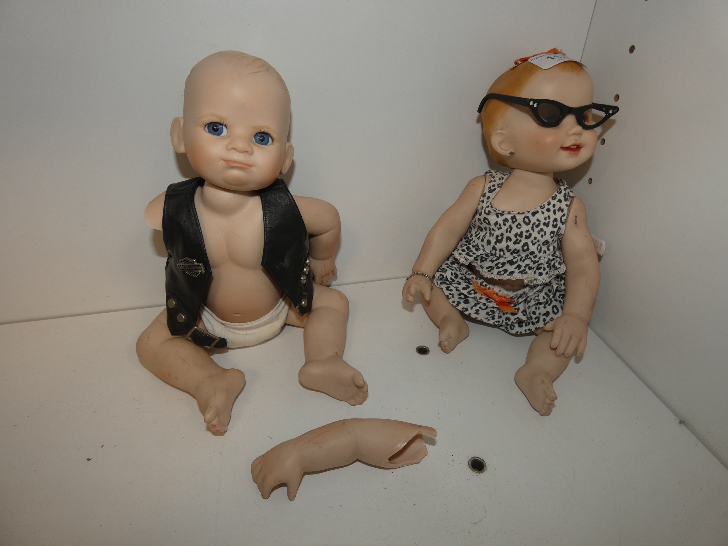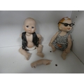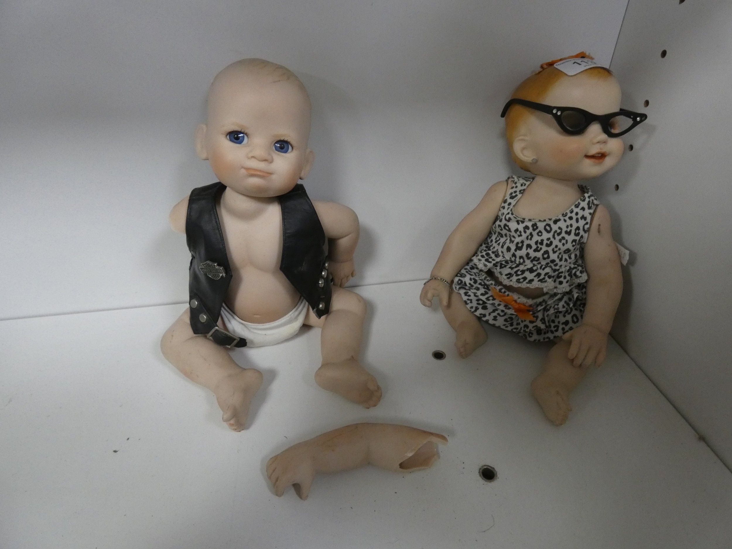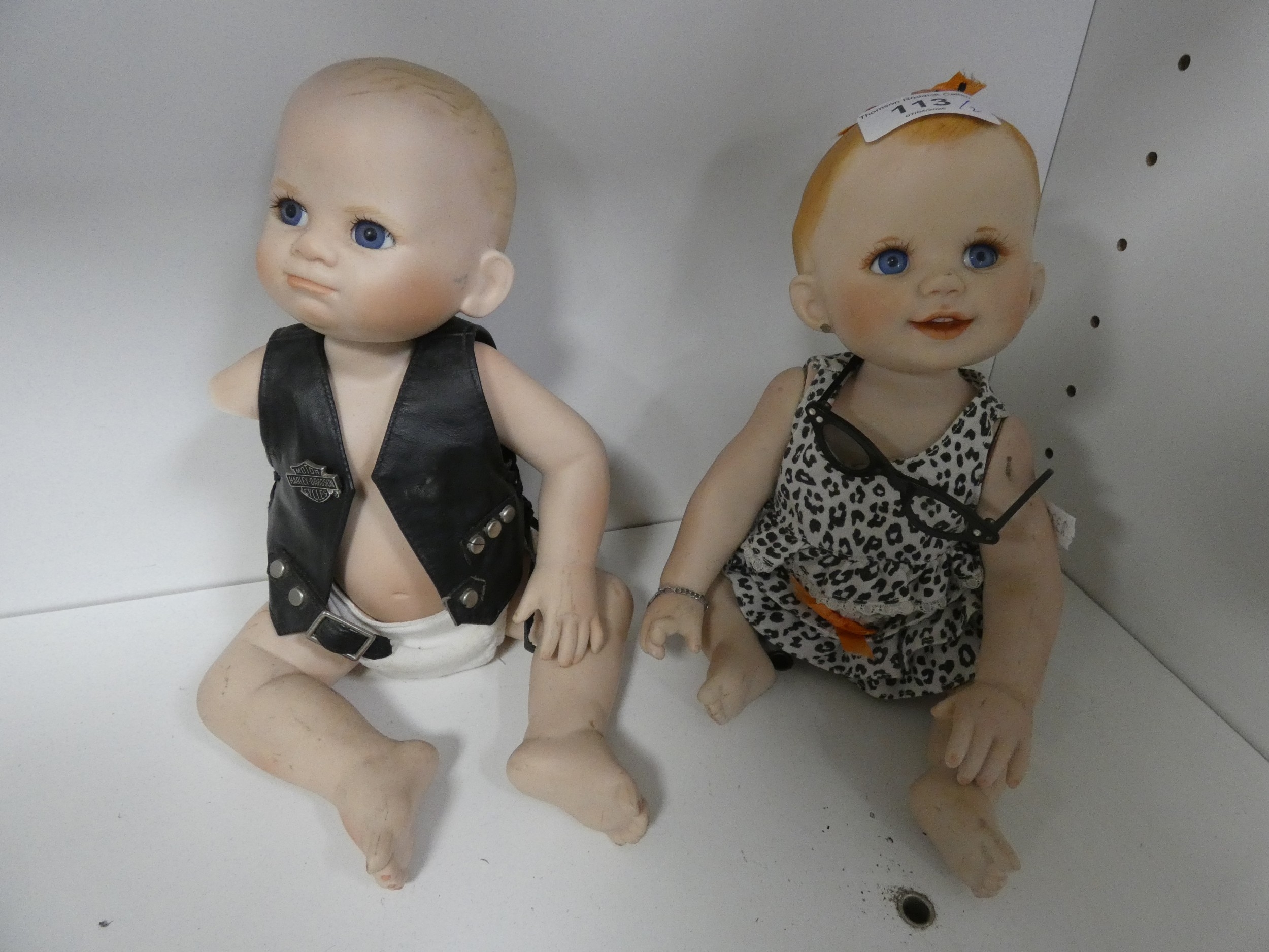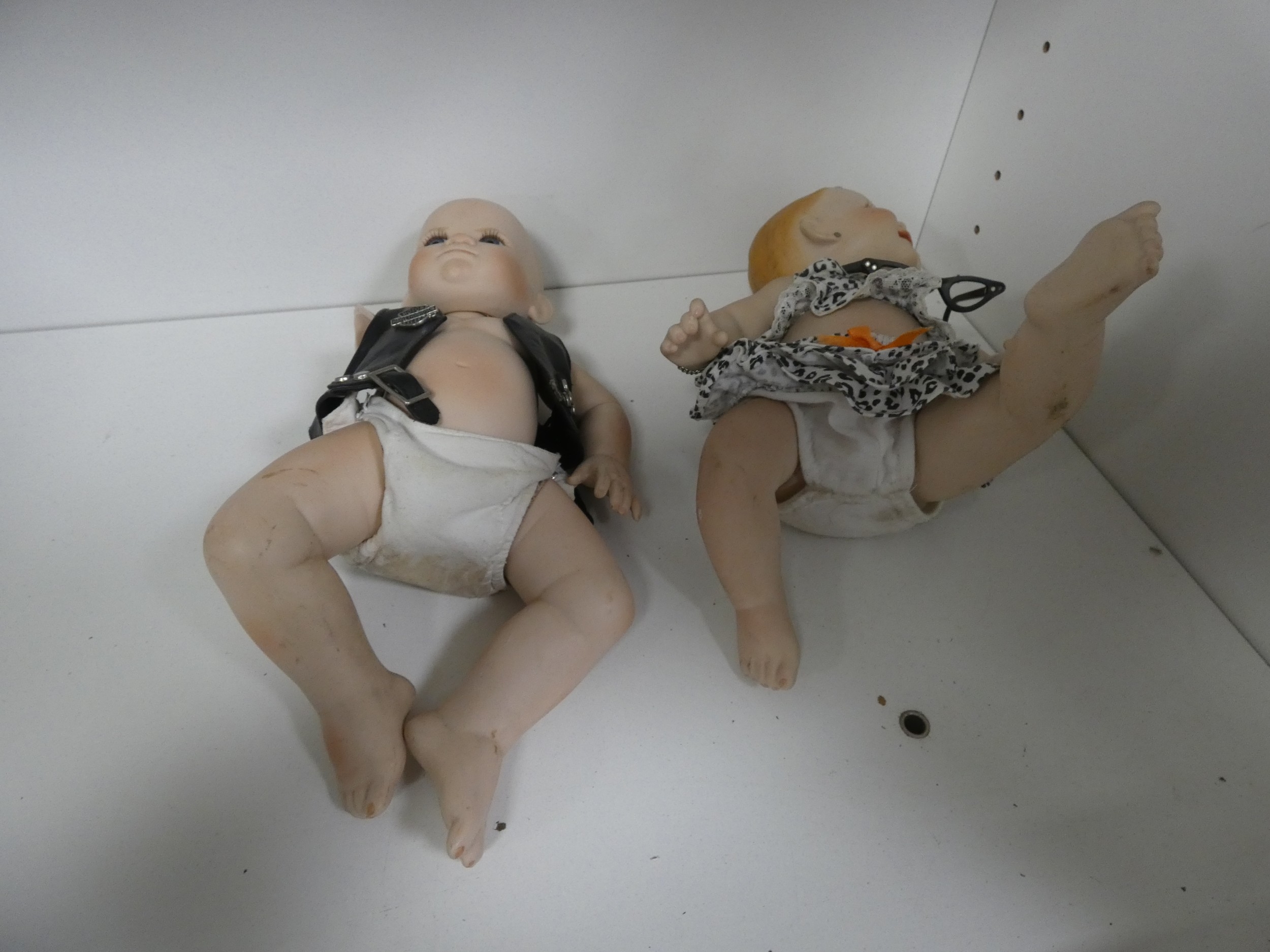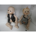 Two china dolls in the form of a boy and girl, with clothing. (2)