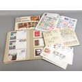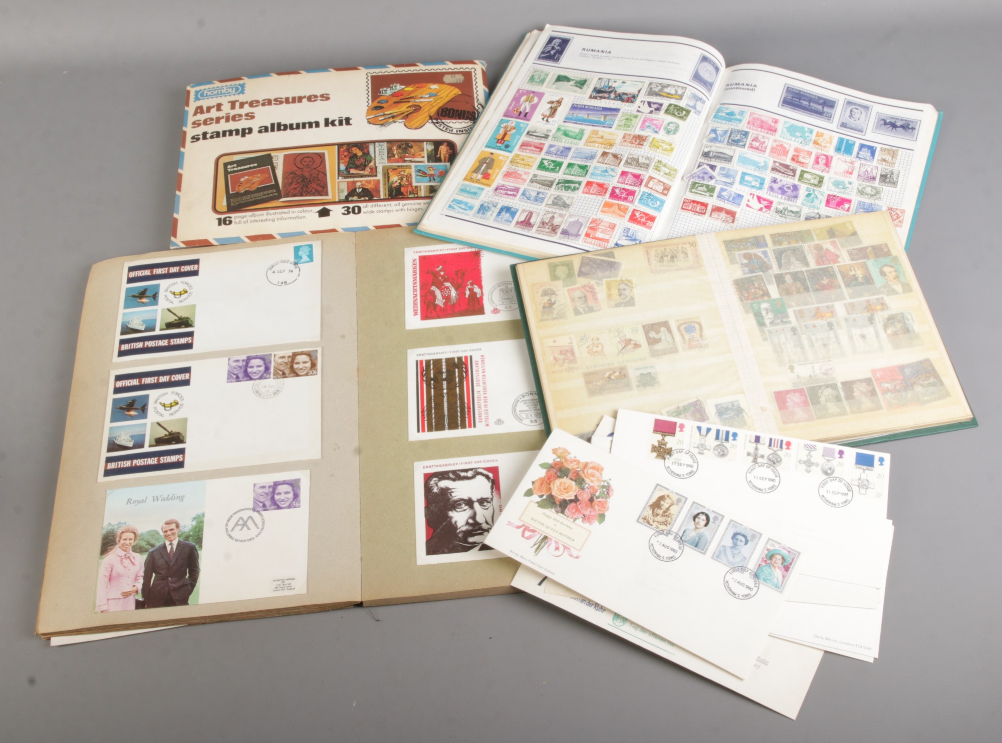 A quantity of stamp albums including stamps from around the world together with a Hornby art treasure series stamp album kit, scrap album containing a large amount of first day covers and with some loose examples