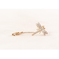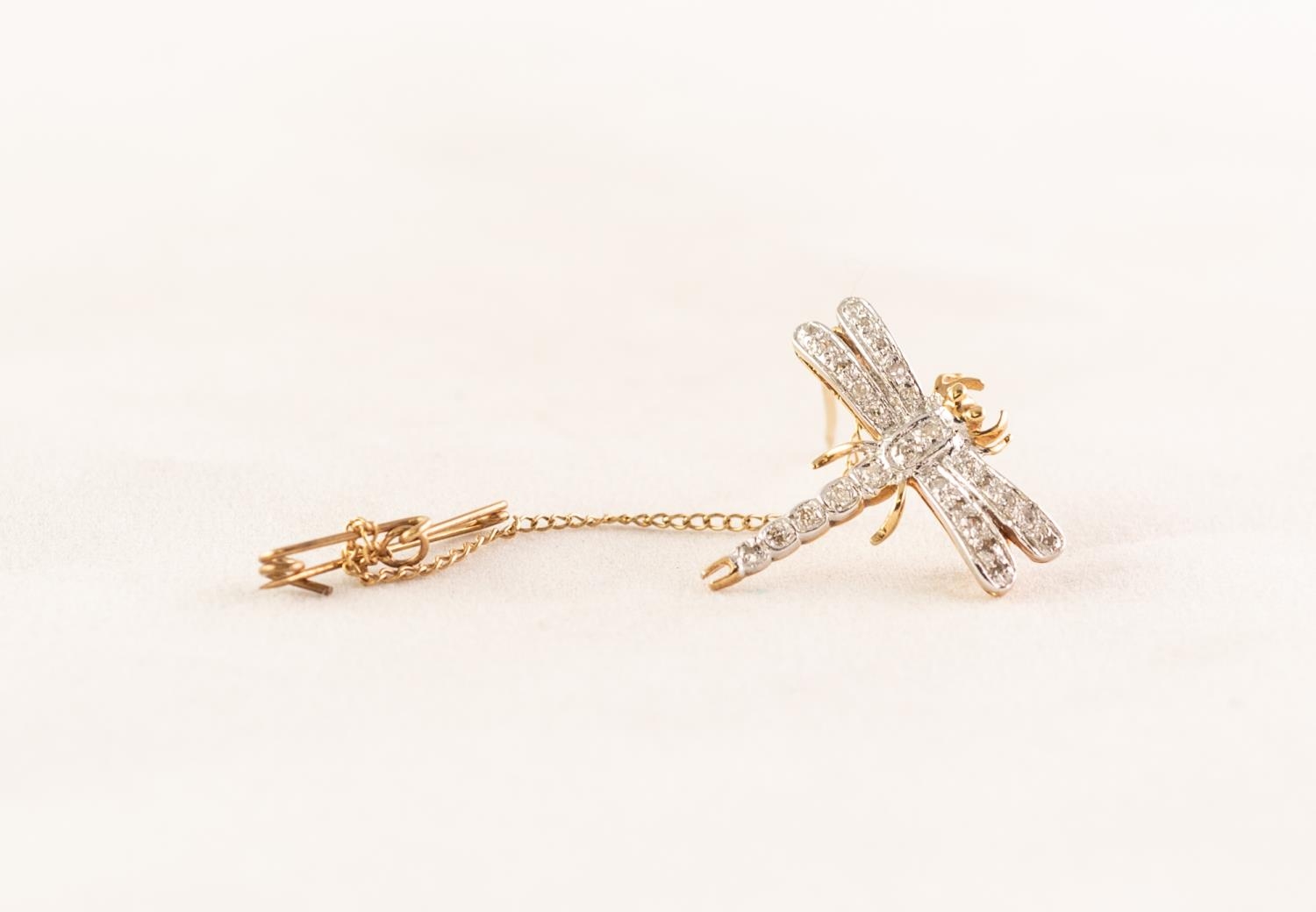 TINY 9ct GOLD AND DIAMOND ILLUSION SET DRAGONFLY BROOCH, with safety chain, 2gms gross