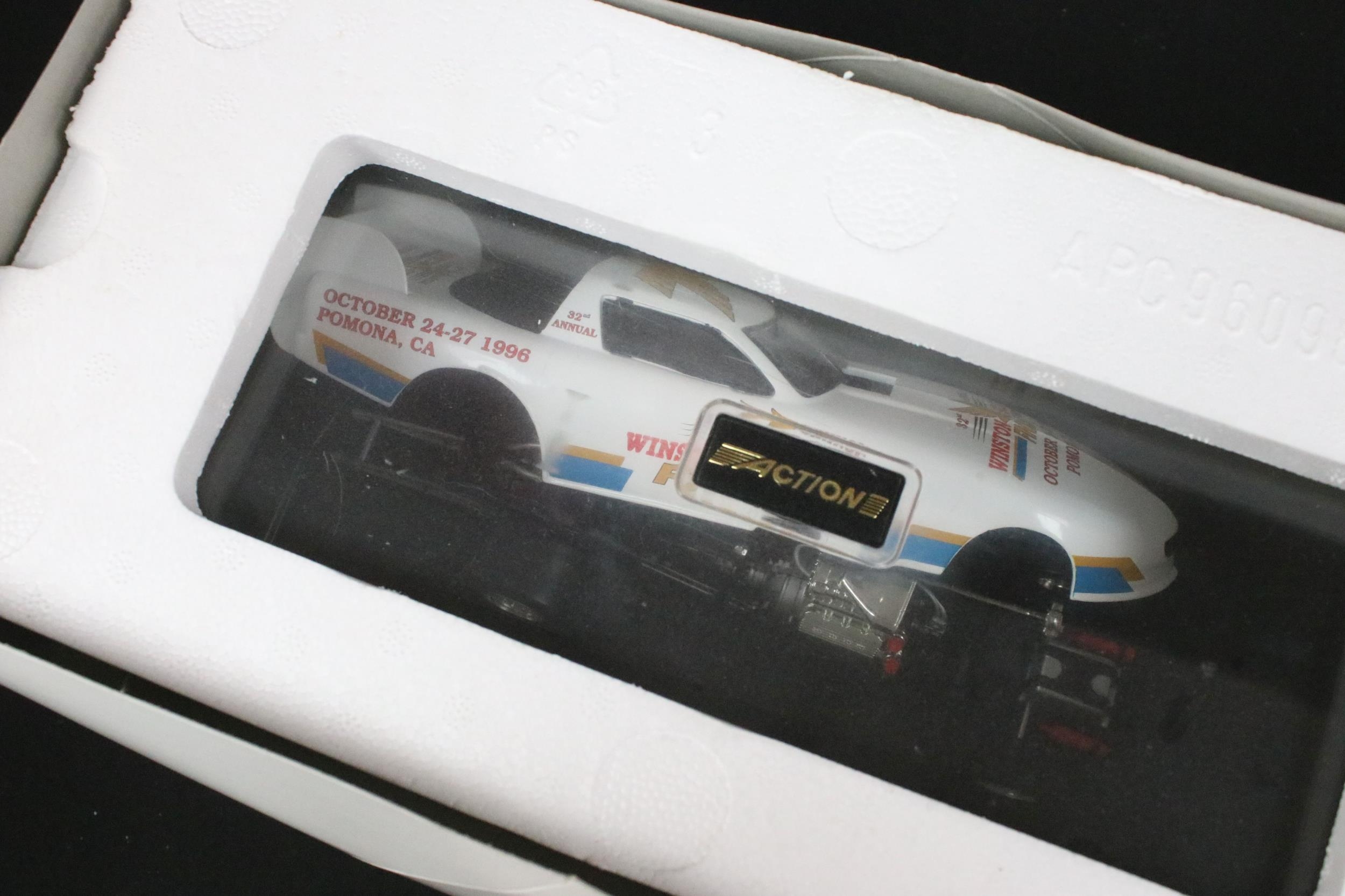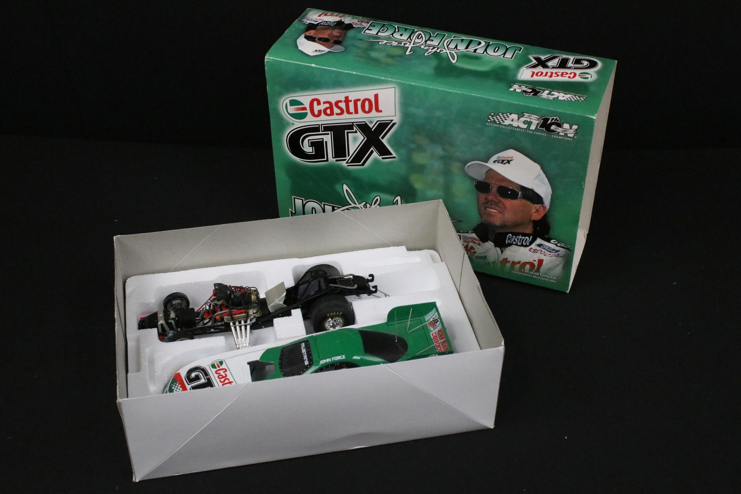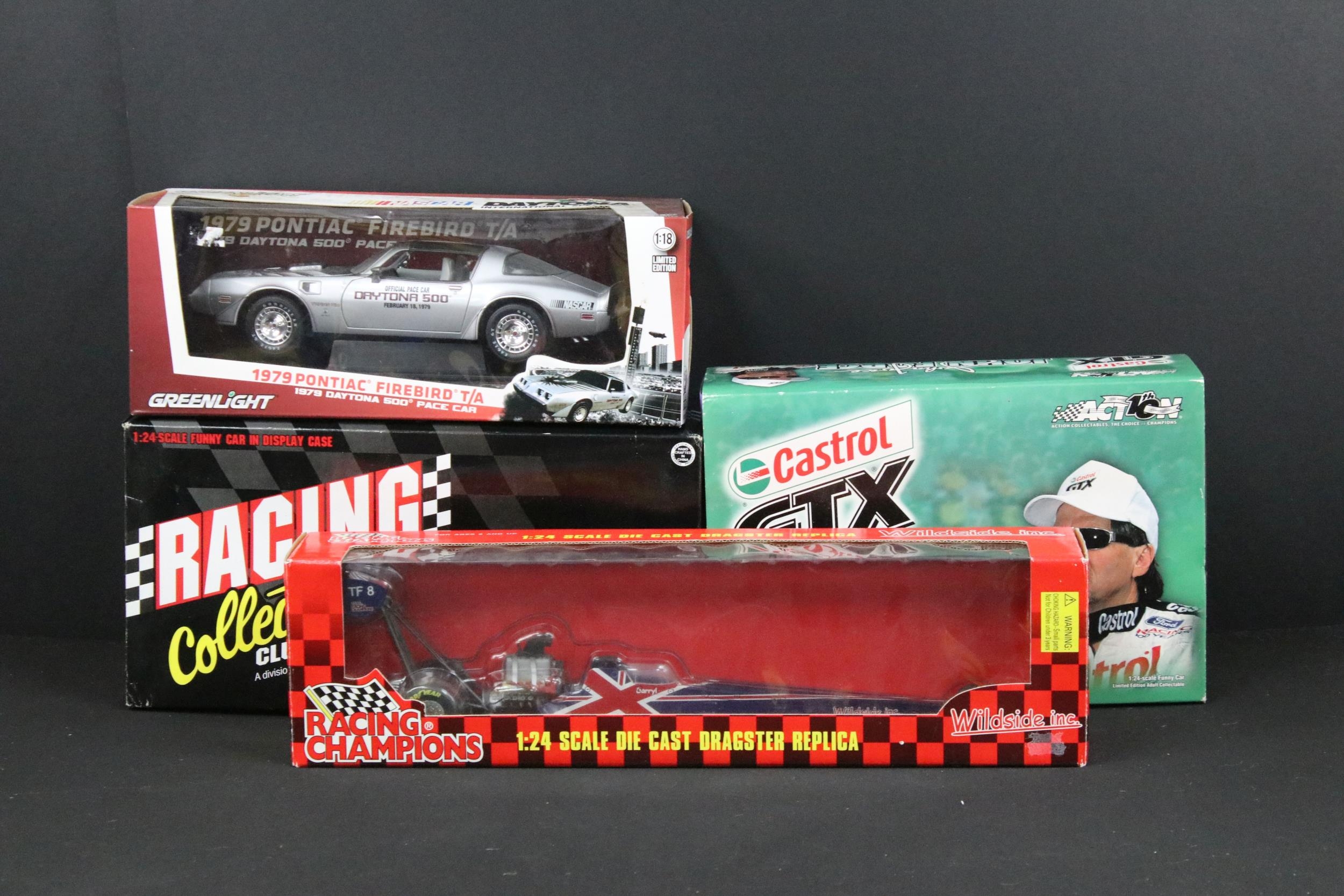Four boxed Nascar / Racing diecast models to include ltd edn Action Collectables John Force Castrol GTX 2002 Mustang Funny Car, ltd edn Greenlight 1979 Pontiac Firebird TA (grubby box), ltd edn Racing Collectables Club of America Winston World 1996 Pontiac and Wildside Racing Champions Dragster, diecast ex, boxes vg unless stated