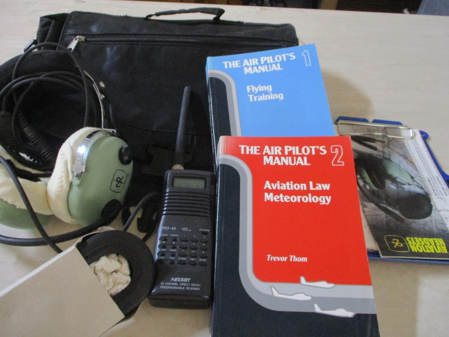 Pilot's Bag with Headphones, Radio Walkie - Talkie, Manuals, Knee Clip Board