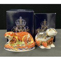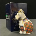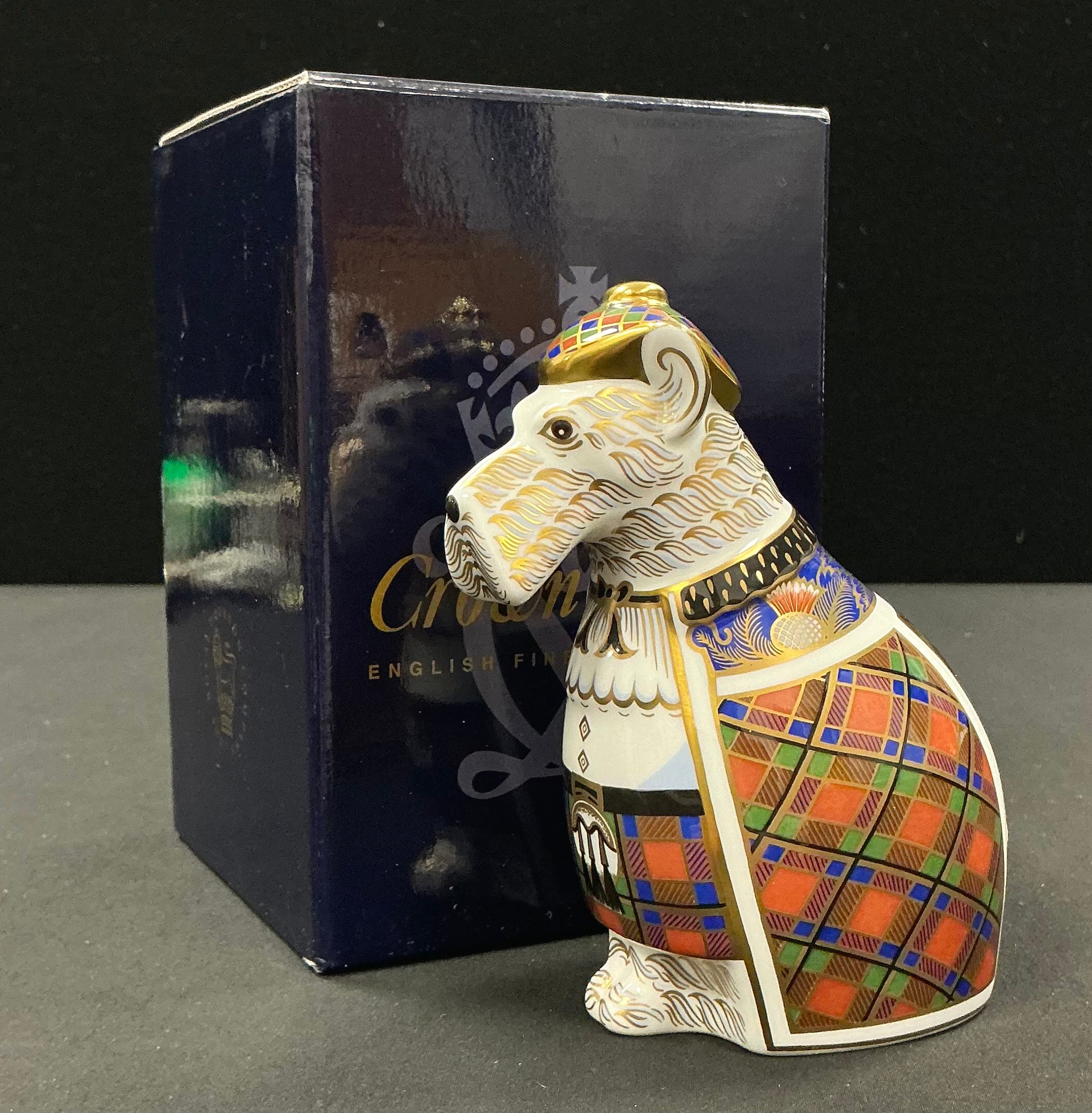 A Royal Crown Derby paperweight, Scottish Terrier, 14cm wide, specially commissioned by Sinclairs to celebrate the Royal Crown Derby event at Blair Atholl, Sinclair tartan, this is number 188 of a limited edition of 500, hand signed in gold by Hugh Gibson and Sue Rowe and dated 7-5-00, red printed marks and Royal Crown Derby stamp to the base, boxed, first quality [ lacks a stopper as is the case with most examples of this collection]