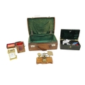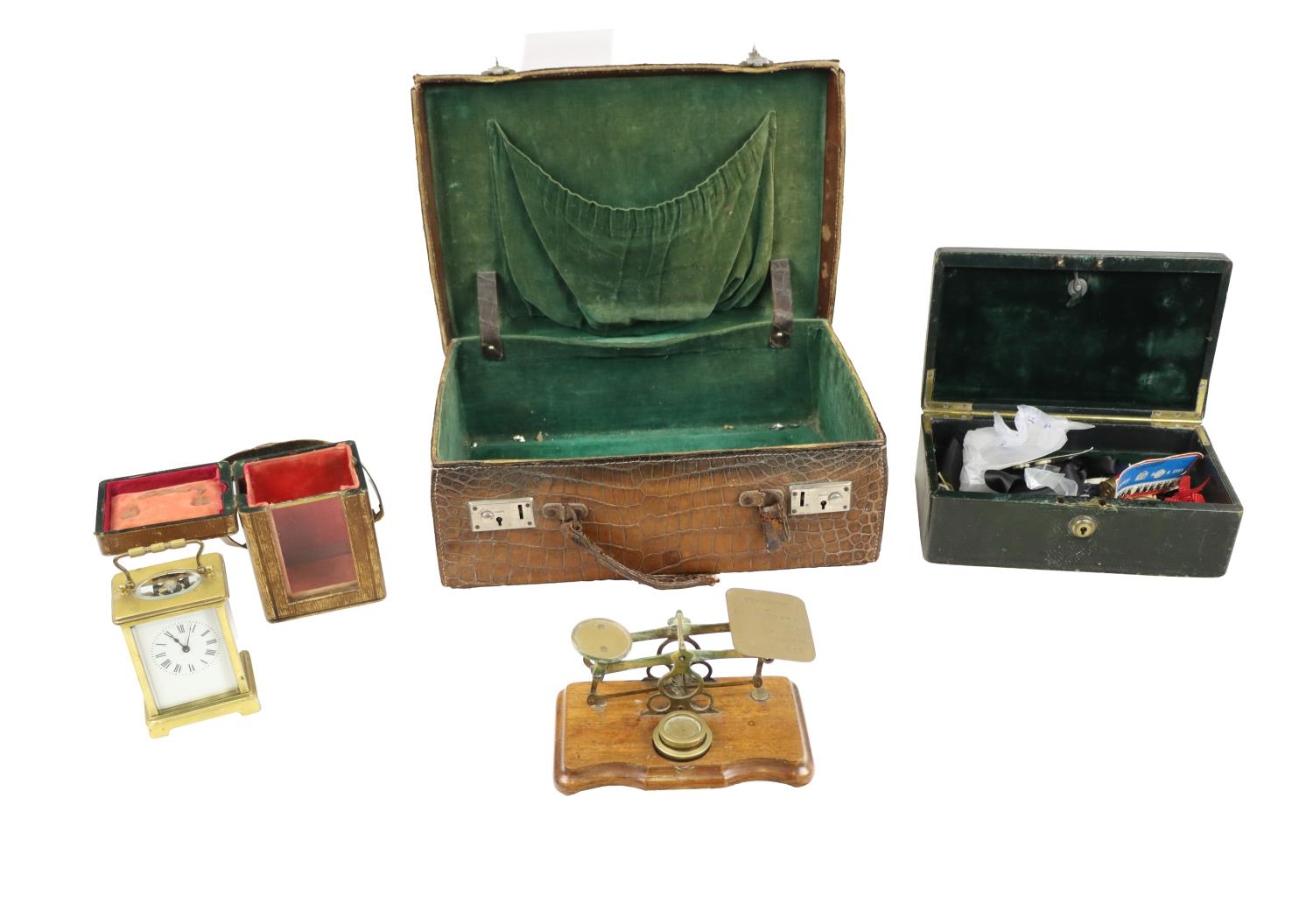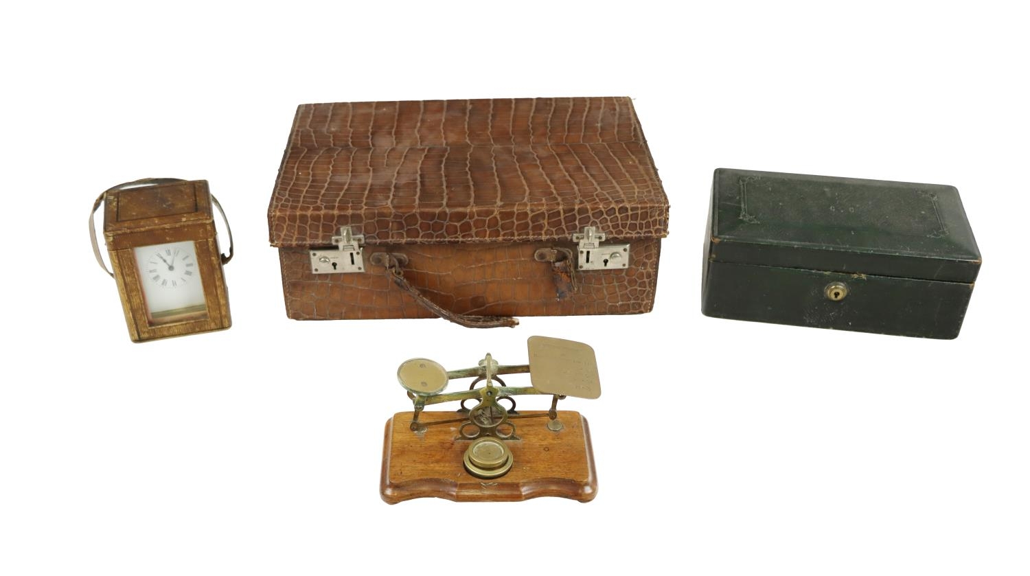 A brass Carriage Clock, in original case, a Postal Weighing Scales, a crocodile skin Case and a leather Stationery Box with initials G.C. (4)